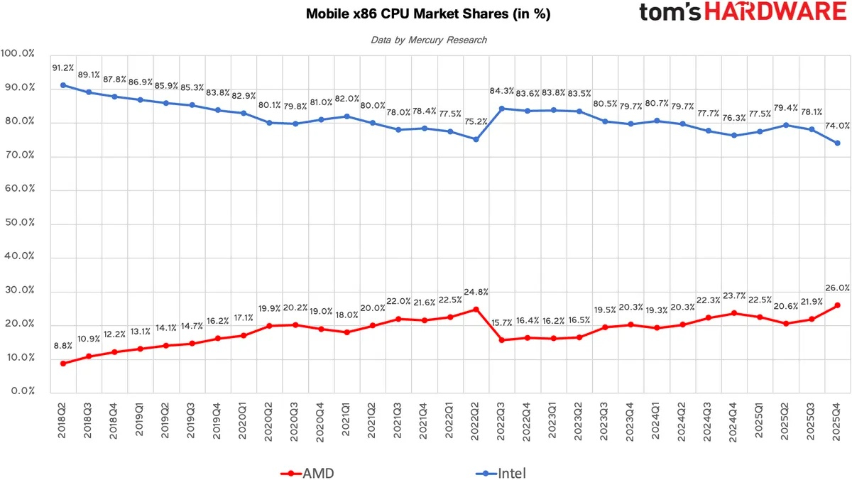 Мобильный сегмент ПК всегда был сильной стороной Intel. Тем не менее, Intel становится все сложнее удерживать лидирующие позиции с процессорами Arrow Lake и Lunar Lake, поскольку AMD значительно расширила свою линейку процессоров для ноутбуков. После нескольких кварталов подряд, когда доля рынка колебалась около 22 %, AMD продемонстрировала уверенное восстановление в четвёртом квартале 2025 года, заняв 26 % рынка и увеличив свою долю на 4,1 % по сравнению с предыдущим кварталом. Intel остаётся доминирующим поставщиком с 74 % рынка, по сравнению с результатами четвёртого квартала 2024 года, компания потеряла всего 2,2 %. Переход к массовому производству процессоров Panther Lake и Nova Lake может помочь Intel не только вернуть утраченную долю рынка, но вновь потеснить AMD.
