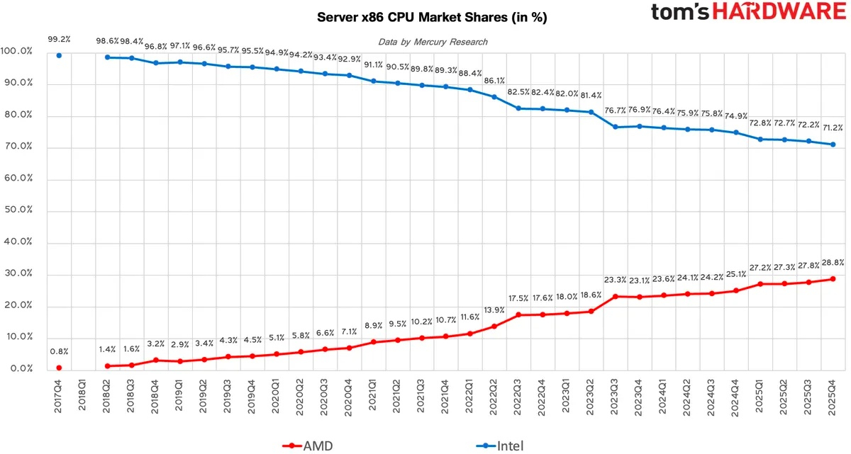 По данным аналитической компании Mercury Research, AMD «триумфально» завершила 2025 год, увеличив свою долю рынка во всех основных сегментах процессоров и достигнув 29,2 % от общего объёма отгруженных клиентских x86-совместимых процессоров в четвёртом квартале, что является абсолютным рекордом для компании. Доля AMD в секторе настольных ПК превысила 35 %. Доля компании в секторе ноутбуков достигла 25 % и приблизилась к 30 % на важнейшем рынке серверов.