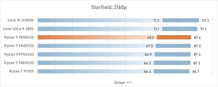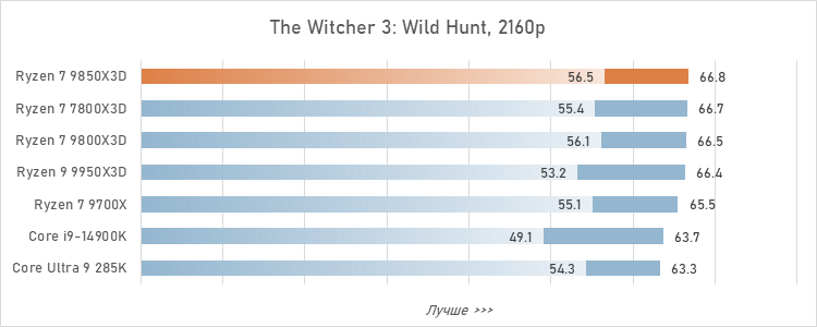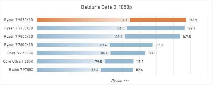 Если же говорить о результатах в отдельных играх, то они, естественно, разнятся. Большее преимущество Ryzen 7 9850X3D обеспечивает там, где процессорная нагрузка выше. Например, в пяти играх из нашего тестового набора (Baldur's Gate 3, Homeworld 3, Starfiled, The Witcher 3: Wild Hunt и Warhammer 40,000: Space Marine 2) превосходство новинки над Ryzen 7 9800X3D превышает 4 %, а над Ryzen 7 7800X3D — и вовсе доходит до 20-25 %.