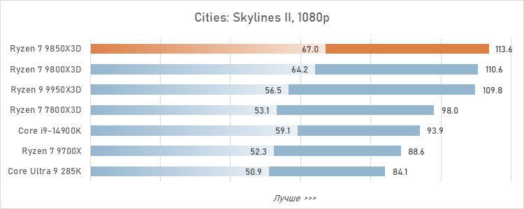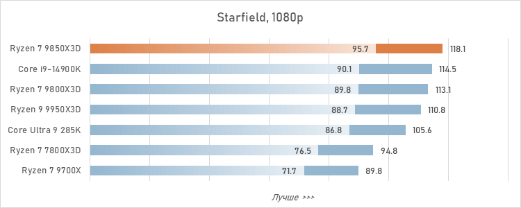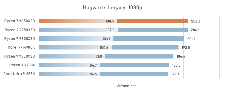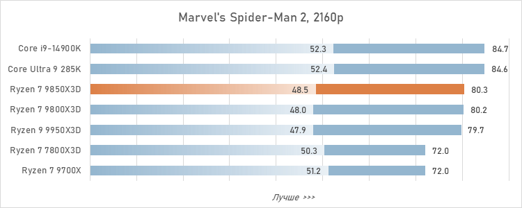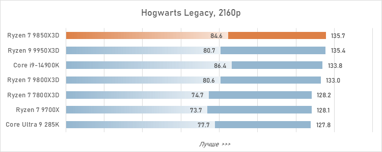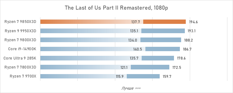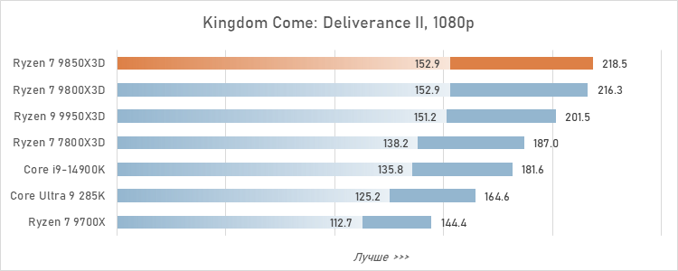 Для протокола зафиксируем: Ryzen 7 9850X3D оторвался в играх от Core Ultra 9 285K уже на 24 %, а его преимущество перед более удачным в смысле гейминга Core i9-14900K достигло 17 %. То есть, превосходство AMD в сегменте игровых CPU стало буквально разгромным.
