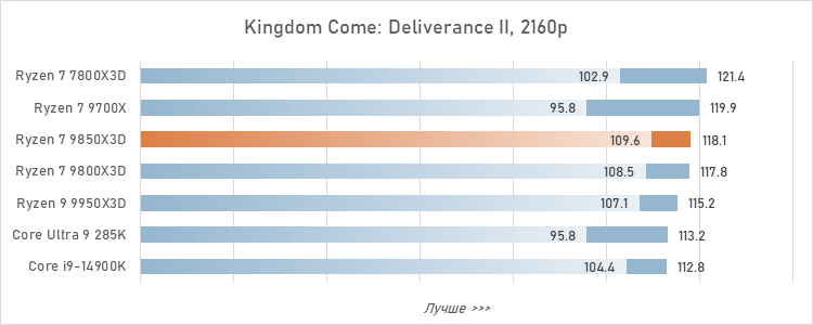 С увеличением разрешения вклад процессора в игровую производительность уменьшается, и отрыв Ryzen 7 9850X3D от предшественника становится исчезающе малым. По крайней мере, если смотреть на показатель среднего FPS по 13 играм, разница между Ryzen 7 9850X3D и Ryzen 7 9800X3D уменьшается до 0,5 %.