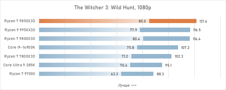Начнём с очевидного. Ryzen 7 9850X3D действительно перехватил звание самого быстрого процессора для игр, которое раньше принадлежало Ryzen 7 9800X3D. В среднем новинка на 3 % быстрее предшественника, а в отдельных процессорозависимых играх её преимущество может доходить и до 5 %. Назвать такой прирост принципиальным или хотя бы значимым довольно трудно. Но в текущих условиях AMD настолько сильно оторвалась от конкурента по производительности в играх, что для подтверждения беспрекословного лидерства в этой дисциплине ей достаточно и таких незначительных улучшений.