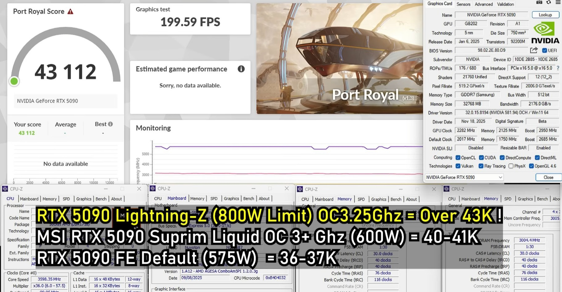 Джонатан начал с умеренного разгона карты. Он повысил частоту GPU до 3,25 ГГц при напряжении 1,05 В. При таких настройках карта уже потребляла более 700 Вт. В тесте 3DMark Port Royal видеокарта с ограничением мощности в 800 Вт набрала 43 112 баллов, превзойдя предыдущий максимум в 40–41 тыс. баллов, показанный моделью MSI RTX 5090 Suprim Liquid. Такие результаты уже значительно выше типичных 36–37 тыс. баллов, которые набирает среднестатистическая RTX 5090.