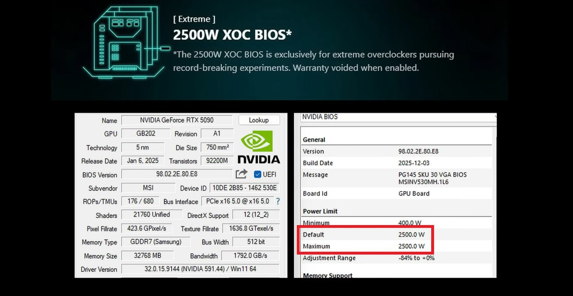 GeForce RTX 5090 Lightning Z от MSI действительно особенная. И не только за счёт своей невероятной официальной цены $5090, но и благодаря тому, что она успела установить несколько новых мировых рекордов производительности ещё до своего официального выхода в продажу. Видеокарта оснащена очень мощной 40-фазной подсистемой питания VRM, двумя разъёмами питания 12V-2x6 и предлагает поддержку двух режимов TDP с 800 и 1000 Вт. Для неё также предлагается «полуофициальная» экстремальная прошивка BIOS XOC на 2500 Вт, предназначенная для оверклокеров. Использование этой прошивки автоматически лишает владельца видеокарты гарантии производителя.