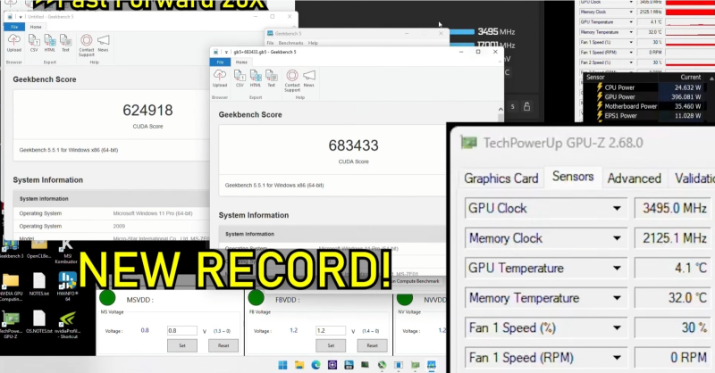 Бенчмарк GPUPI оказался гораздо более «снисходительным», и Джонатану удалось достичь частоты 3,6 ГГц при температуре около 0 градусов на GPU. Команда остановилась на частоте 3,5 ГГц как на оптимальной на данный момент и смогла побить мировой рекорд по наивысшему результату HWBot для вычислений на GPU в Geekbench 5. Они набрали 683 433 балла, и этот рекорд до сих пор не побит.