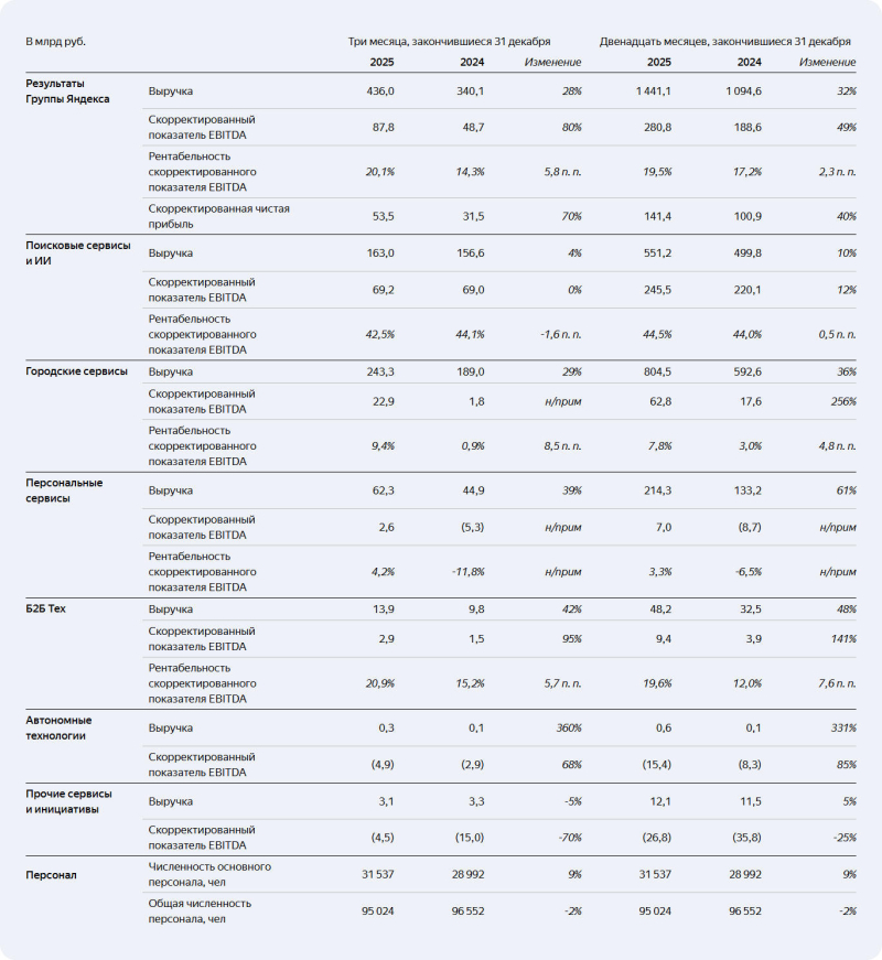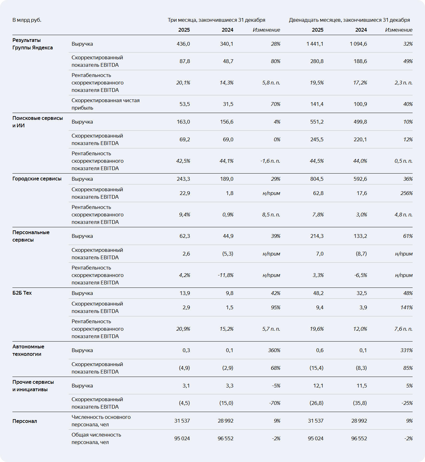 «Яндекс» сумел резко нарастить прибыльность: скорректированный показатель EBITDA в IV квартале увеличился на 80 %, до 87,8 млрд руб., при рентабельности 20,1 %. По итогам всего 2025 года данный показатель вырос на 49 % и составил 280,8 млрд руб., рентабельность — 19,5 %. Рекламное направление выросло на 8,7 % по итогам минувшего квартала и на 13,5 % — за весь год. Выручка от подписки «Яндекс Плюс» в IV квартале показала годовой рост на 34,5 %; за весь 2025 год число подписчиков увеличилось на 44,9 %, до 47,5 млн человек. Весь блок «Персональные сервисы», куда, помимо подписки, входят финансовые продукты и развлекательные сервисы, нарастил выручку на 61 % за год.