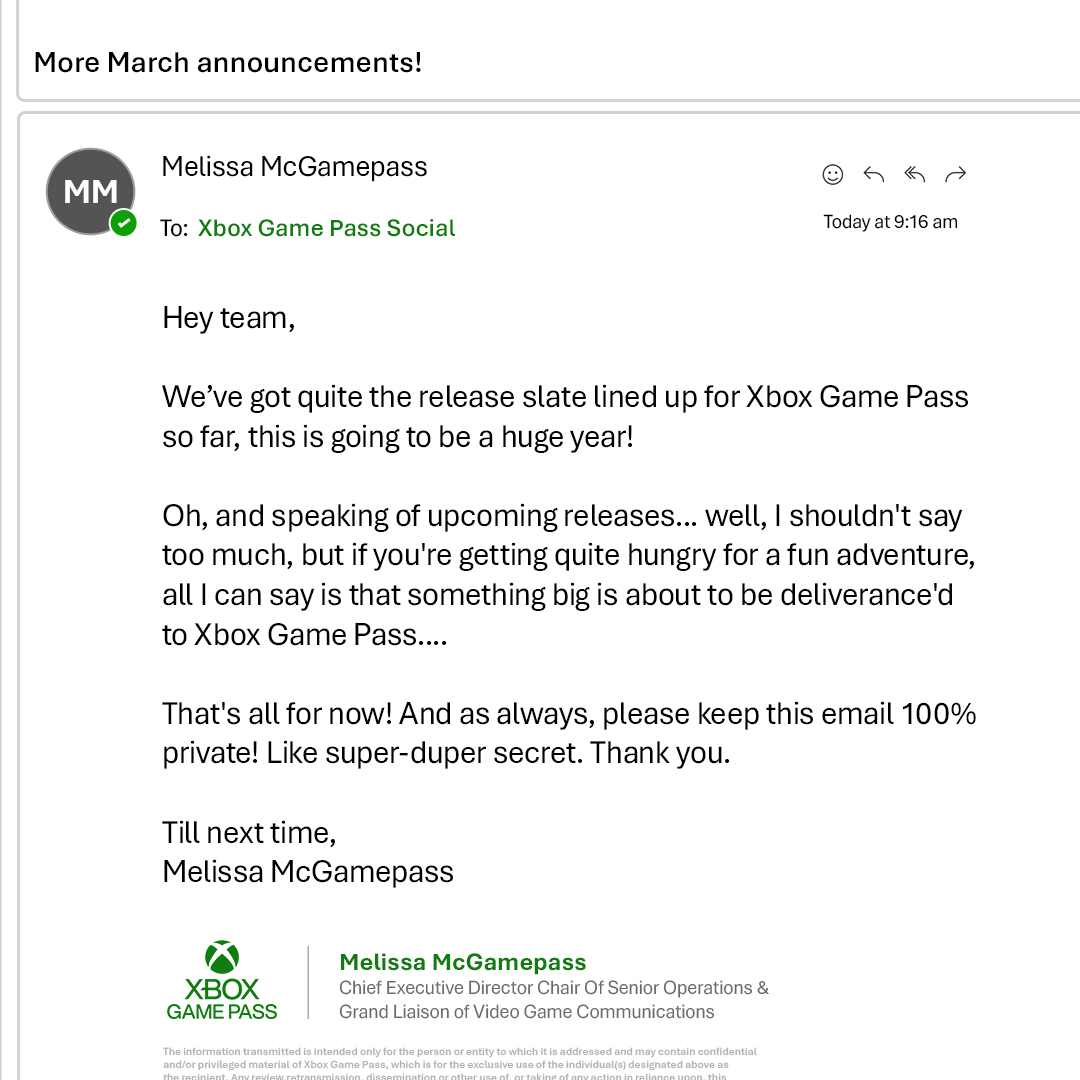 Официальный микроблог Game Pass опубликовал фиктивное письмо с корпоративной почты, в котором Мелисса Макгеймпасс (Melissa McGamepass) готовит сотрудников к мартовским пополнениям библиотеки.