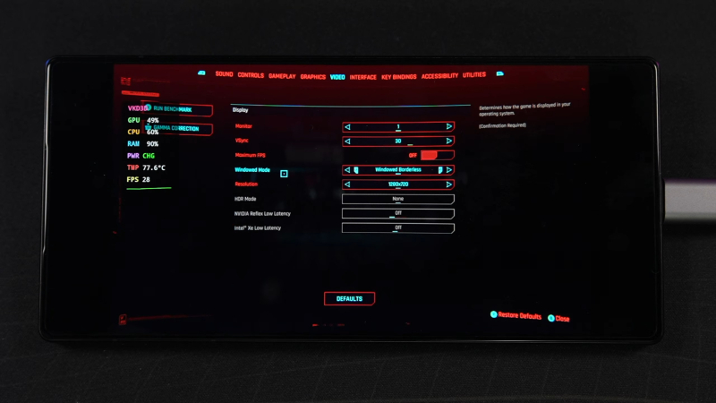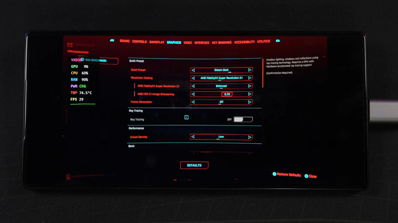 ETA Prime также запустил игру с теми же настройками и включённой генерацией кадров FSR, что значительно увеличило частоту кадров в Cyberpunk 2077, позволив достичь максимума в 50 FPS с просадками чуть ниже 40 FPS. Также был опробован пресет для Steam Deck, который выводит некоторые настройки на высокий уровень. К удивлению, Android-смартфон справился: с отключённой генерацией кадров телефон смог достичь около 27 FPS, а с включённой — 40–50 FPS.
