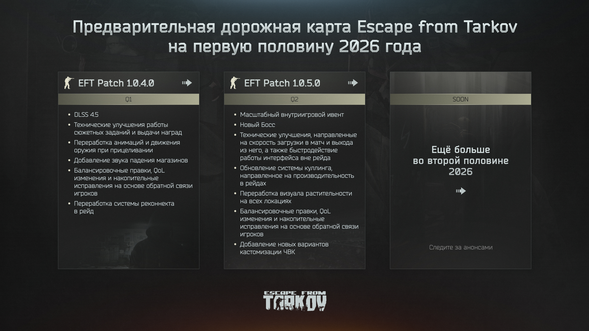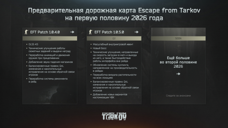 Разработчики из российской студии Battlestate Games представили план развития своего хардкорного эвакуационного шутера Escape from Tarkov на первую половину 2026 года и сообщили о выходе для игры альтернативной озвучки.