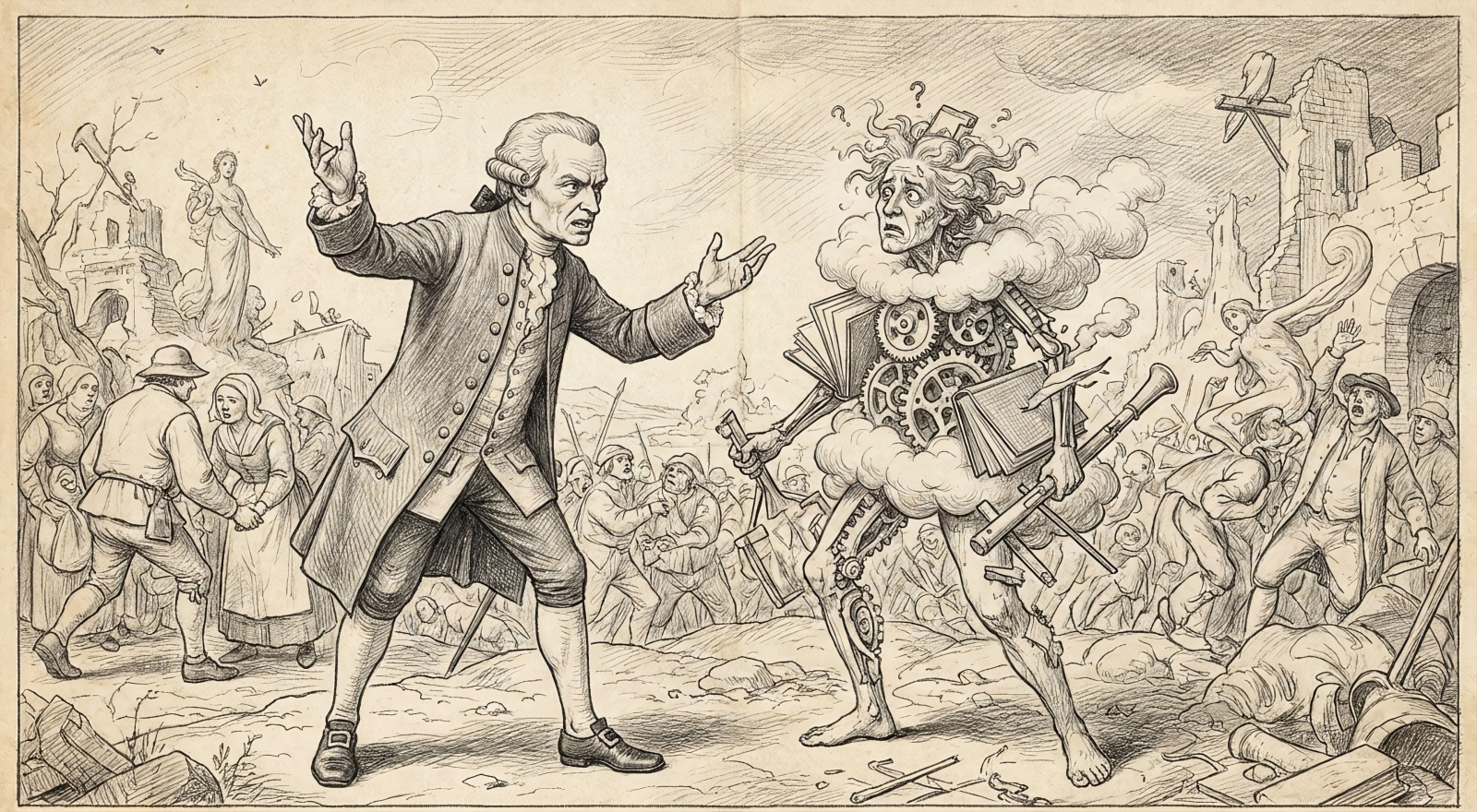 Верный подданный Её Императорского Величества Елизаветы Петровны Иммануил Кант критикует Чистый Разум при большом стечении не на шутку заинтересованного народа; рисунок Питера Брейгеля Старшего (источник: ИИ-генерация на основе модели Nano Banana) Кант же в своём фундаментальном труде «Критика чистого разума» поставил под сомнение традиционную схоластическую метафизику — ведь, поскольку предмет той лежит за пределами доступного человеку опыта, она не может быть точной наукой, положения которой выводятся логически и подтверждаются экспериментально. «Чистым» философ, кстати, вслед за Лейбницем (Gottfried Wilhelm Leibniz) называл разум, не наполненный эмпирическим содержанием; разум как таковой, как саму способность к познанию, — ну чем не глубокая нейросеть в исходном своём состоянии, с нулевыми весами на входах всех перцептронов? Отрицая для человеческого разума интеллектуальную интуицию — то бишь непосредственное понимание сущностей/первопричин/метафизических реальностей, — Кант показал, что человеческий интеллект по своей сути дискурсивен, и как раз потому назвал Vernunft ту «тяготеющую к метафизике» самонадеянную попытку постичь в принципе непостижимый абсолют — за которой неизбежно следует скатывание к иллюзии. В итоге философ обозначил словом Verstand анализ опыта; вполне обыденный навык образовывать прикладные понятия и строить логические умозаключения на эмпирическом основании. Высшую же способность формулировать метафизические идеи (и заодно диалектически разоблачать трансцендентальные иллюзии), прежний intellectus, он назвал Vernunft. Эту классификацию подхватил затем Гегель (Georg Wilhelm Friedrich Hegel), а позже — и прочие философы Нового времени. С их лёгкой руки в переводы — что на русский, что на английский — и проник «интеллект» как кантовский Verstand. Прежнее же, схоластическое наполнение этого термина — «прямое постижение» через боговдохновенное откровение извне — унаследовал Vernunft, понимаемый как отвлечённая от грубой практики способность к развитию безусловных, умозрительных идей (таких, как «свобода» или «бессмертие»). И, поскольку Verstand у Канта подразумевает деятельное использование врождённых категорий (таких как причинность, субстанция и единство) для формирования в сознании индивида связных и осмысленных переживаний, процесс этот тесно связан с самосознанием и моральной автономией — которые у современных ИИ со всей очевидностью отсутствуют. Может, кстати, и хорошо, что отсутствуют: морально автономный AGI был бы вполне способен задать человечеству жару.