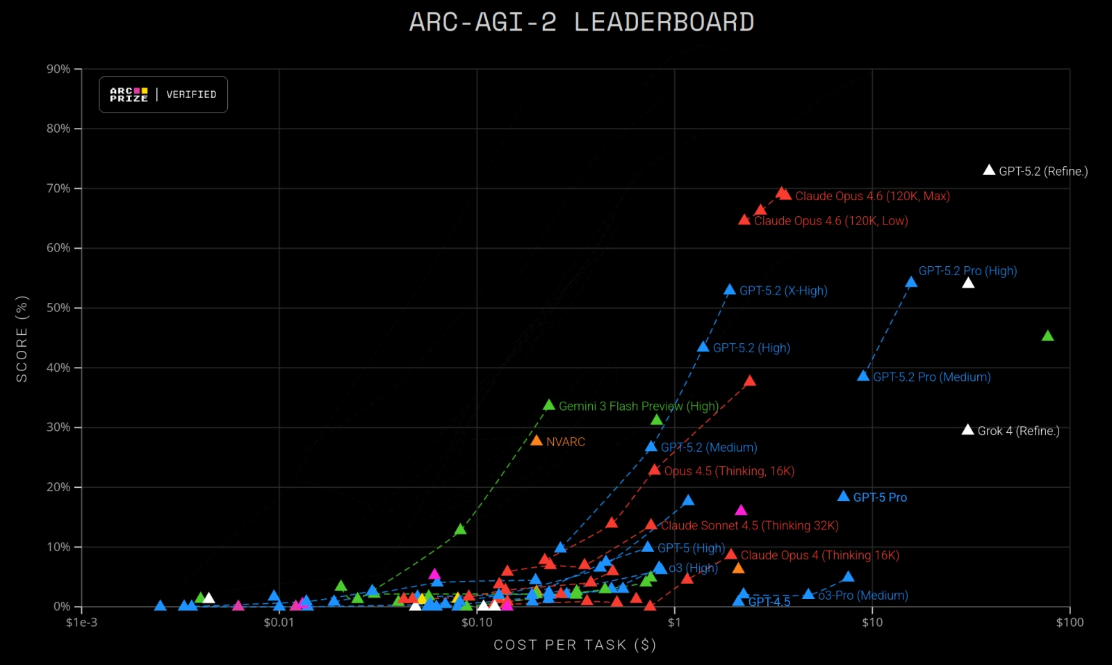 Не прошло и года с момента появления нового «сверхсложного» бенчмарка для ИИ, а уже есть модели, набирающие на нём более 70% (источник: ARC Prize Foundation) Впрочем, и ARC-AGI-1 не удалось избежать критики, характерной едва ли не для любых ИТ-(а не только ИИ-)бенчмарков. Поскольку набор тестов в нём поневоле ограничен — а иначе как можно было бы говорить о корректном сравнении результатов для разных участников? — принимавшие вызов модели нередко брутфорсили верные решения вместо того, чтобы «приобретать новые способности», и/или практиковали оверфиттинг (переобучение), жертвуя универсальностью своих возможностей ради набора большего числа баллов в необычно сложном для себя тесте. В итоге сам Шолле признал, что успешное прохождение первой версии теста вовсе не свидетельствует о достижении AGI — поскольку фиксирует опять-таки сам факт решения одной конкретной задачи, но не широкую приспосабливаемость и не выработку в системе пресловутого здравомыслия, после появления которого уже можно будет ставить вопрос о мере её разумности. В марте 2025-го миру был явлен ARC-AGI-2, который курирует отныне некоммерческая организация — фонд ARC Prize Foundation с заявленной миссией «служить ориентиром на пути к созданию искусственного интеллекта через установление долгосрочных контрольных показателей». Призовой фонд в 1 млн долл. («Those are rookie numbers!» — как бы говорят нам Google, Microsoft, Nvidia и прочие купающиеся в миллиардах киты мировой ИИ-отрасли) предполагается распределять между командами, чьи ИИ смогут решить 85% и более из 120 новых задач — НО! — со значительными ограничениями: используя всего четыре графических процессора и за 12 часов либо быстрее. Задачи действительно усложнились: они теперь требуют выявления из предложенных примеров и применения сразу нескольких правил, проведения многоэтапных связных рассуждений, интерпретации определённых символов и т. д. Средний результат человека, которому предлагают ARC-AGI-2, — около 60%, а через полгода после появления теста в открытом доступе лучший на тот момент ИИ — Grok 4 (Thinking) — показывал всего-то 16%. Правда, на момент написания настоящей статьи флагманские генеративные модели явно подтянулись: Claude Opus 4.6 (120K, High) достигла 69,2% при себестоимости решения в 3,47 долларов за задачу, Gemini 3 Pro (Refine) — 54,0% при 30,57 долл./зад., а GPT-5/2 (Refine) — 72,9% при 38,99 долл./зад. И эксперты опять не столько потирают руки в ожидании скорого, уже вот-вот, явления AGI народу (Сэм Альтман-то потирает, конечно, — но он этим занят непрерывно уже который год), сколько привычно сетуют на оверфиттинг и брутфорс — бесспорно, теперь на существенно новом и куда более прогрессивном уровне. Так что нынче в разработке находится уже ARC-AGI-3, бенчмарк с динамическими задачами (мини-играми на всё том же прямоугольном поле) — но вряд ли стоит сомневаться, что и с ним история в целом повторится.