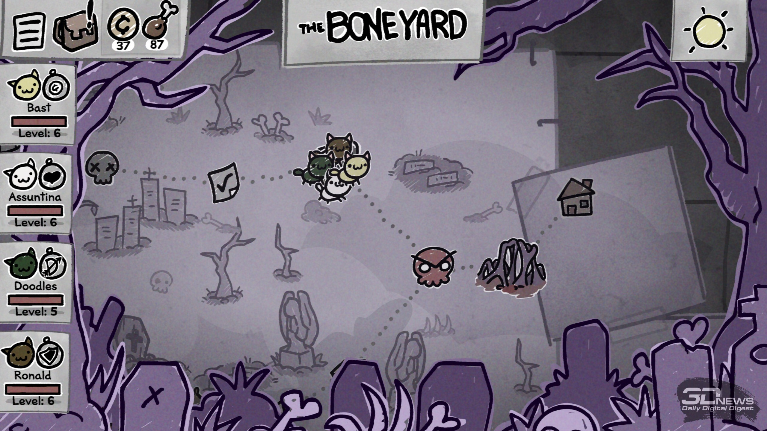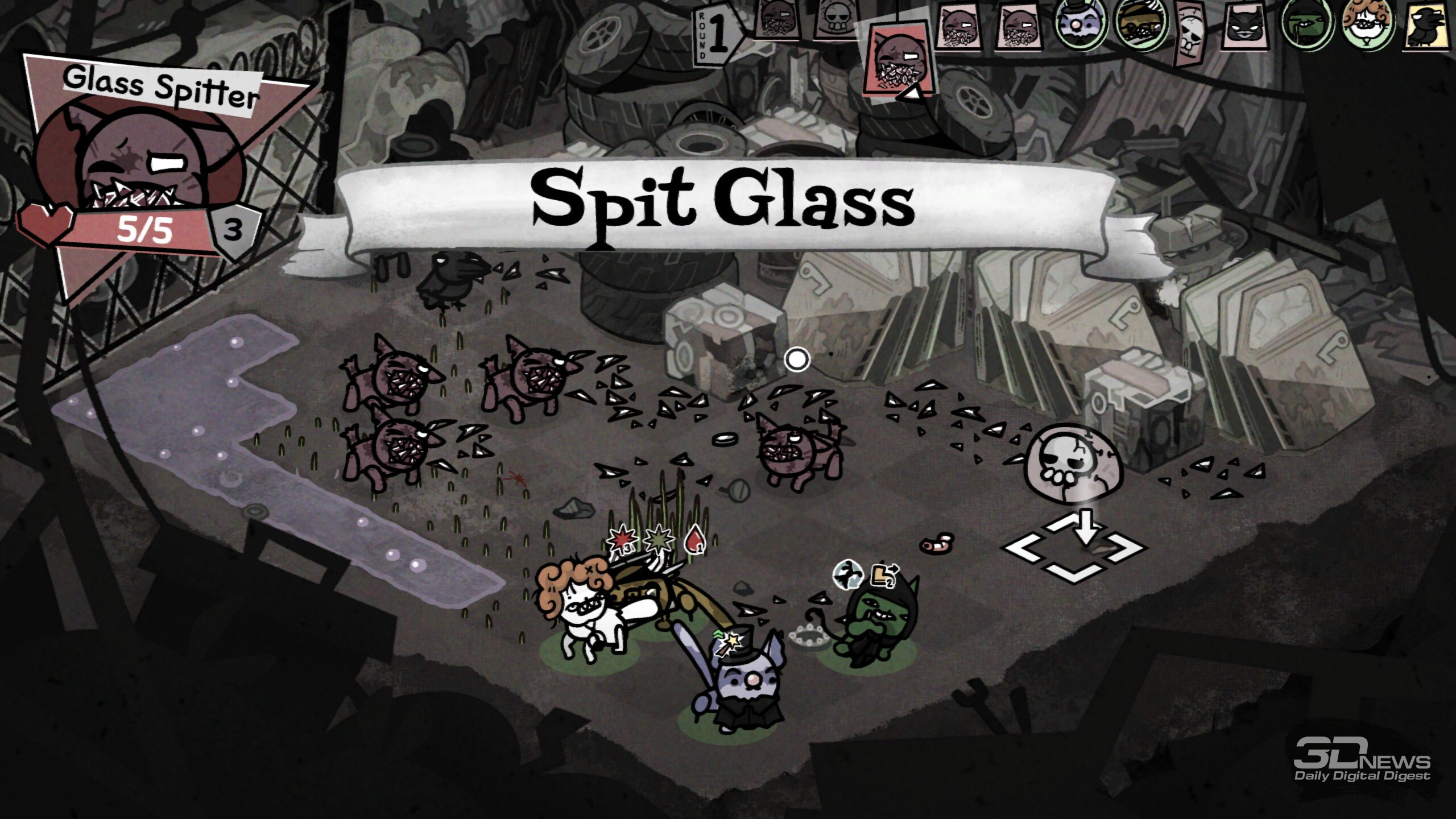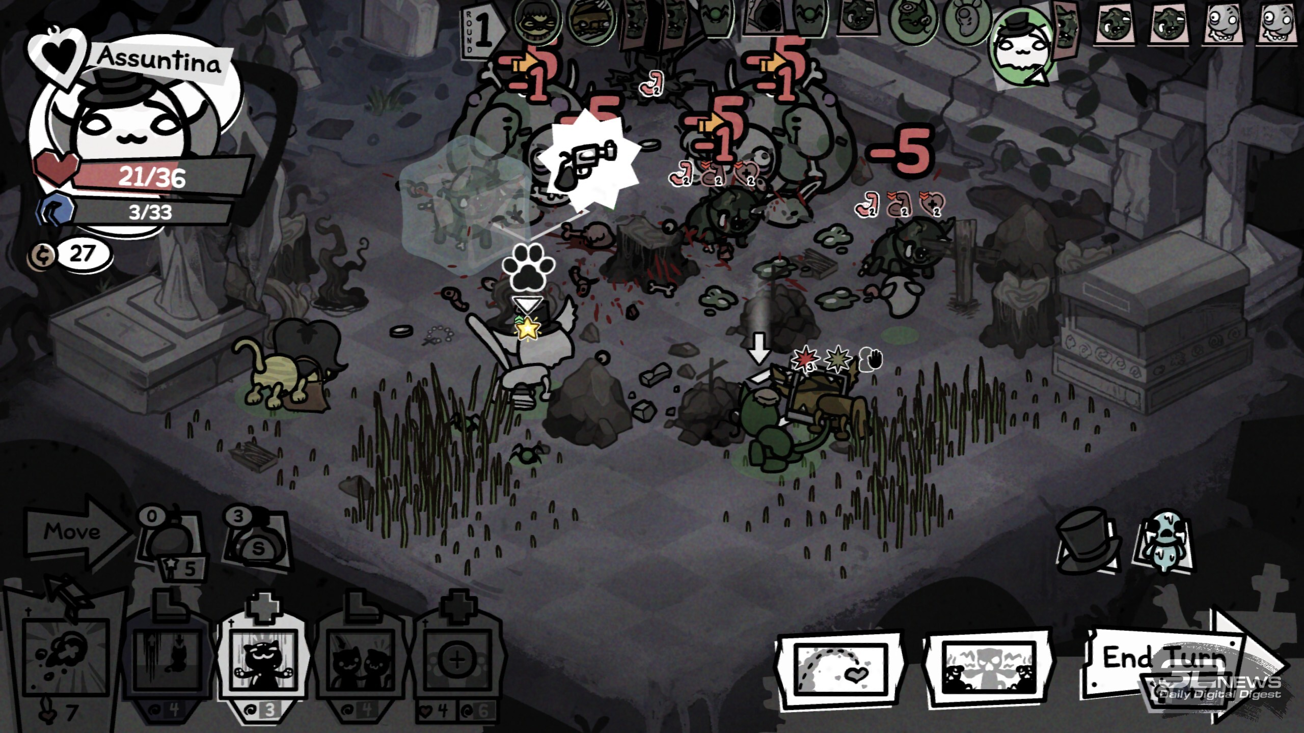 Когда у кота закончится здоровье в бою, он потеряет сознание и получит травму — перманентный штраф к случайной характеристике. Но если противник уничтожит тело, то, увы, это конец для хвостатого Изначально в нашем распоряжении всего четыре ошейника, но после успешных забегов и открытия новых биомов станут доступны новые классы. Девять дополнительных ошейников позволят добавить в отряд некроманта, монаха, мясника, шута и многих других. А ещё можно отправить кота в поход и без аксессуара вовсе, что лишит его классовых преимуществ, но зато даст гибкость в развитии и шанс получить какую-нибудь особенно сильную способность в ходе забега. Новые умения коты получают после победы в бою (четыре на выбор). Какие-то будут хороши сами по себе в силу универсальности, например те, что дают дополнительный урон, призывают на помощь фамильяров, даруют возможность телепортироваться по арене, помогают усиливать или лечить союзников. А есть и способности ситуативные, которые могут как решить исход сложного боя, так и пролежать мёртвым грузом, а то и стать причиной гибели всего отряда. Например, мощная атака по области, что задевает и своих, и чужих, или какой-нибудь хитрый эффект, что сокращает урон от стандартной атаки вполовину, но даёт дополнительное применение; или же пассивное умение охотника, когда после атаки стрелок разворачивается на сто восемьдесят градусов и даёт повторный залп по доступной цели… не исключая союзников. Потенциал у таких умений вроде бы есть, но уместны они далеко не в каждом составе и не в каждом бою.