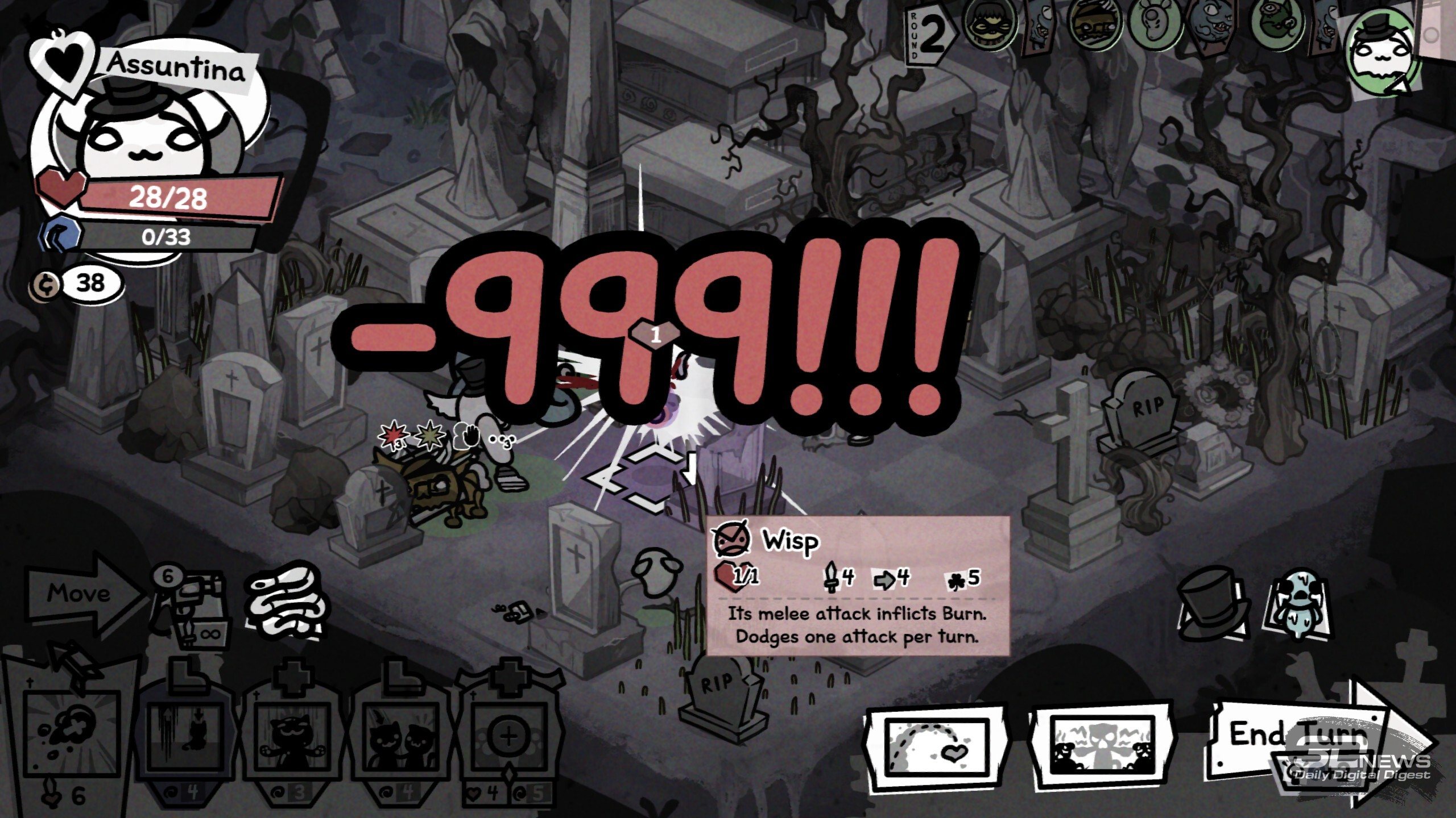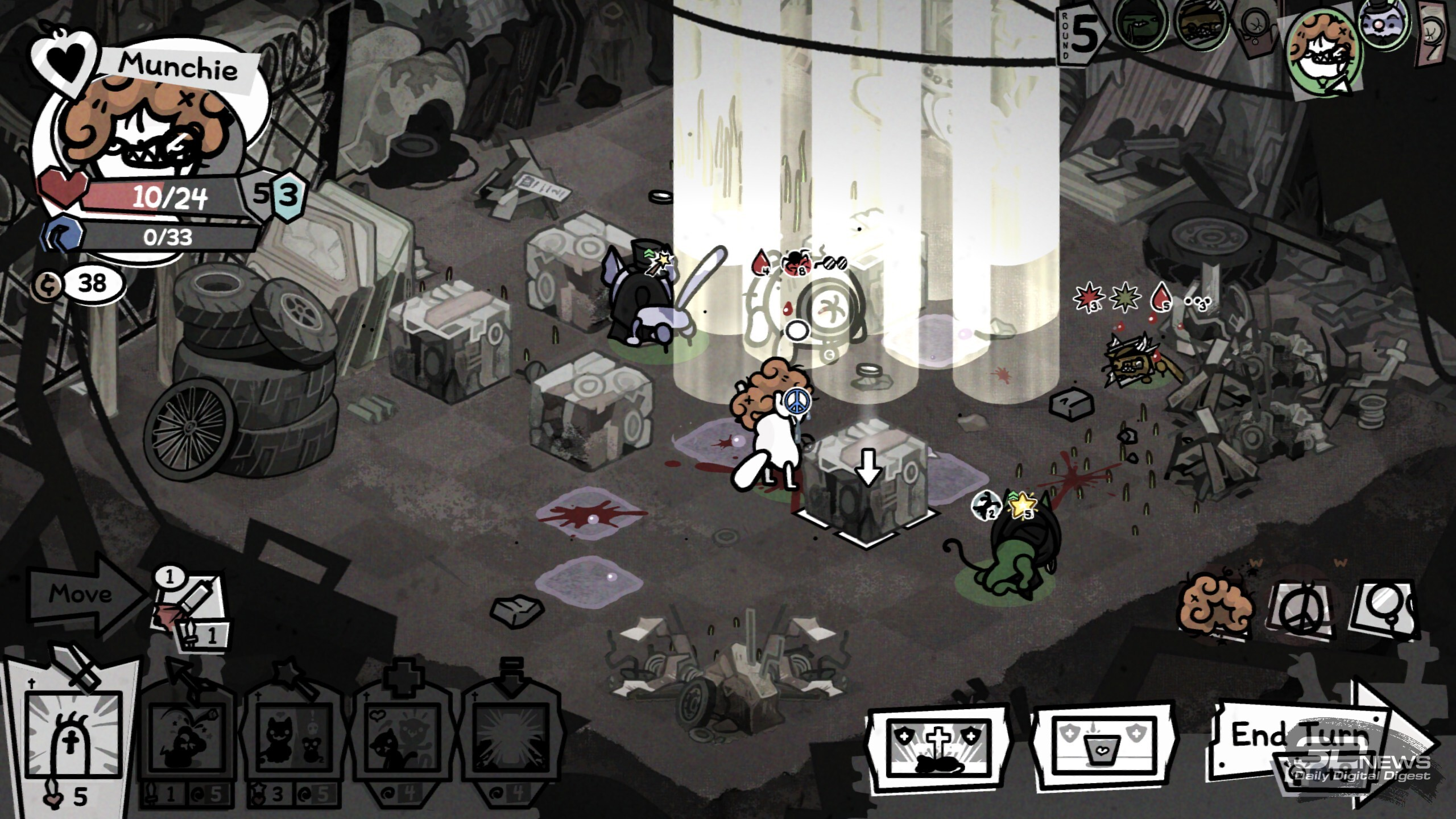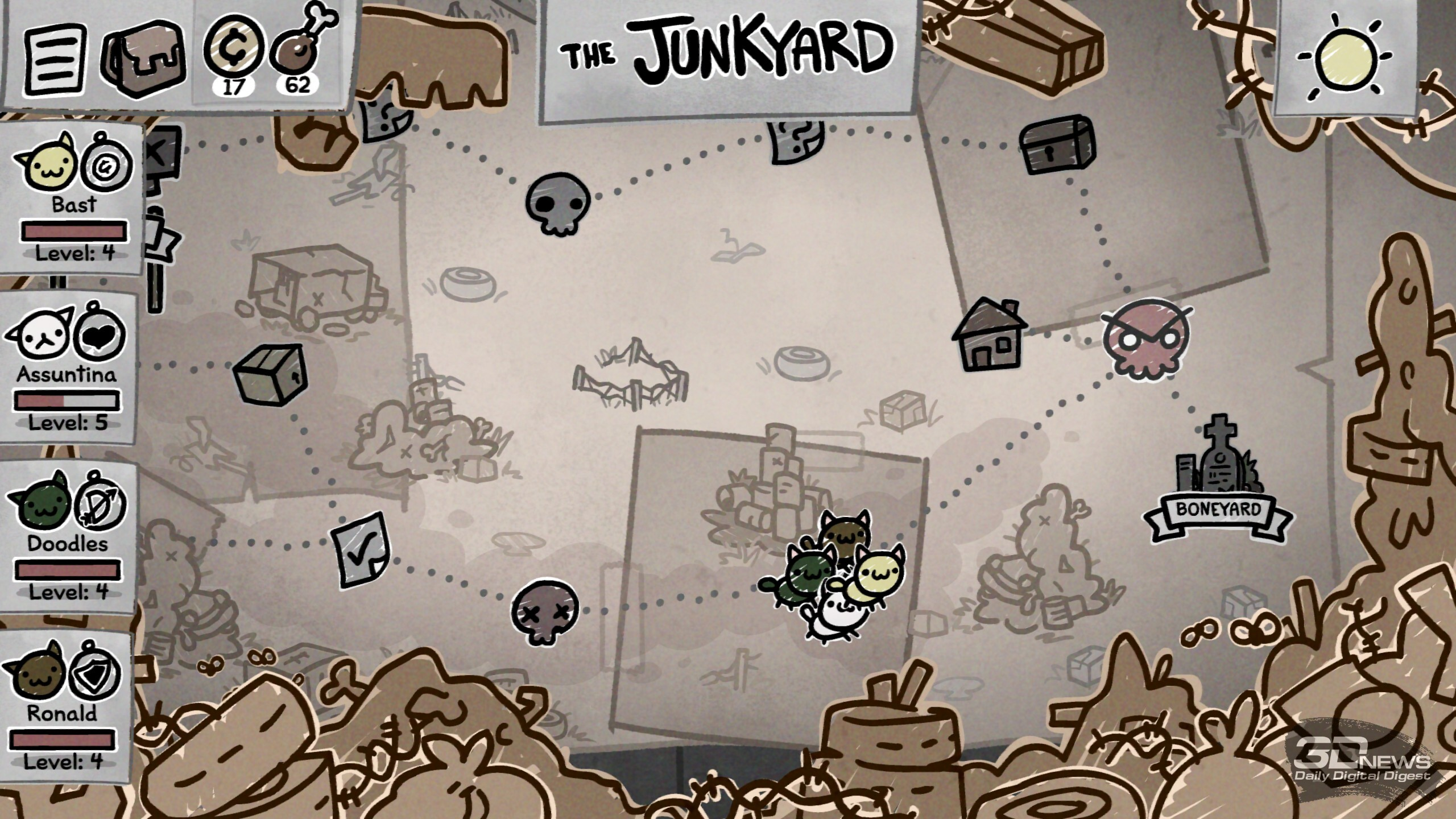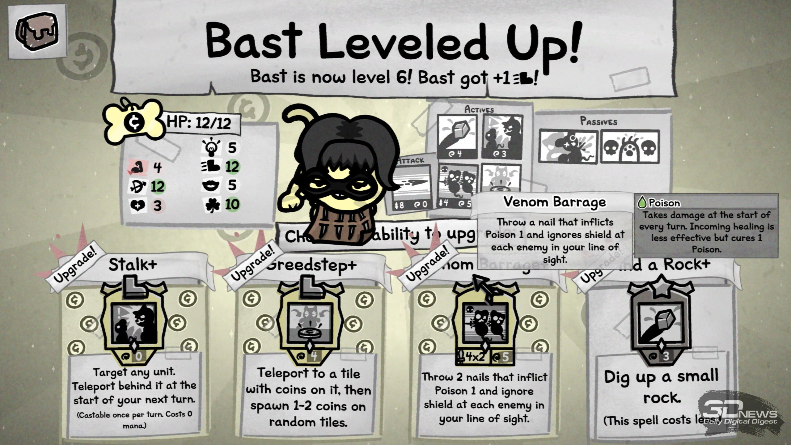 Когда у кота закончится здоровье в бою, он потеряет сознание и получит травму — перманентный штраф к случайной характеристике. Но если противник уничтожит тело, то, увы, это конец для хвостатого Изначально в нашем распоряжении всего четыре ошейника, но после успешных забегов и открытия новых биомов станут доступны новые классы. Девять дополнительных ошейников позволят добавить в отряд некроманта, монаха, мясника, шута и многих других. А ещё можно отправить кота в поход и без аксессуара вовсе, что лишит его классовых преимуществ, но зато даст гибкость в развитии и шанс получить какую-нибудь особенно сильную способность в ходе забега. Новые умения коты получают после победы в бою (четыре на выбор). Какие-то будут хороши сами по себе в силу универсальности, например те, что дают дополнительный урон, призывают на помощь фамильяров, даруют возможность телепортироваться по арене, помогают усиливать или лечить союзников. А есть и способности ситуативные, которые могут как решить исход сложного боя, так и пролежать мёртвым грузом, а то и стать причиной гибели всего отряда. Например, мощная атака по области, что задевает и своих, и чужих, или какой-нибудь хитрый эффект, что сокращает урон от стандартной атаки вполовину, но даёт дополнительное применение; или же пассивное умение охотника, когда после атаки стрелок разворачивается на сто восемьдесят градусов и даёт повторный залп по доступной цели… не исключая союзников. Потенциал у таких умений вроде бы есть, но уместны они далеко не в каждом составе и не в каждом бою.