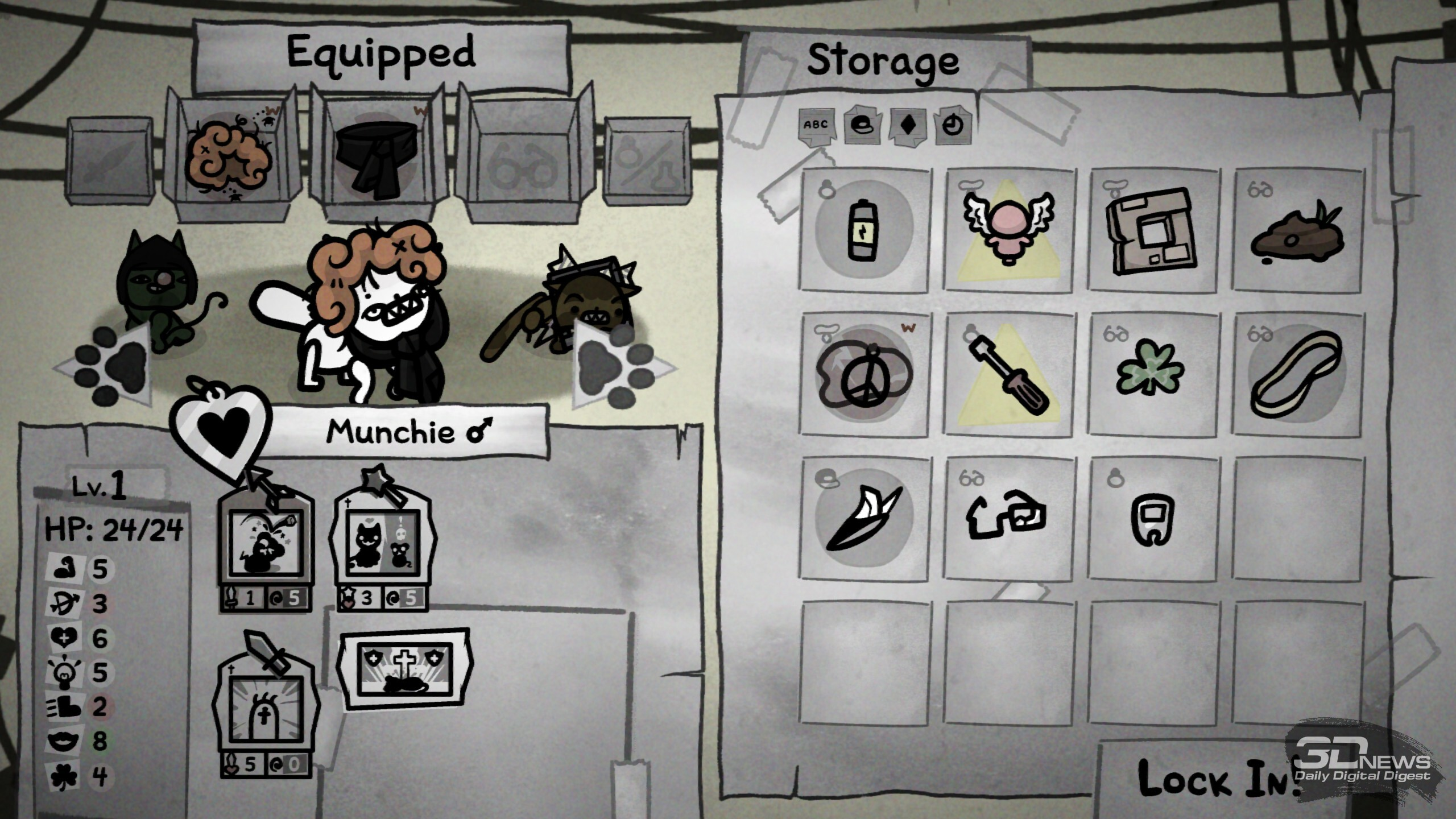 Играли на PC Игры Эдмунда Макмиллена обладают интересным эффектом, одновременно и отталкивающим, и притягательным, — вроде бы происходящее на экране настолько мерзко, что аппетит пропадает на неделю, а вроде и оторваться от игры невозможно. Та же The Binding of Isaac была чрезвычайно неприятной игрой на многих уровнях восприятия, но при этом настолько глубокой и проработанной, что игроки проводили в ней сотни часов. А за отвратительными фигурами и странноватым юмором скрывались пронзительные темы, тревожившие душу куда сильнее жутких гиперболизированных образов. Mewgenics — куда более лёгкий проект на уровне драматургии, а в гротескных образах больше комичности, чем мерзости, так что осадочек будет попроще (хоть иногда и буквально подташнивает, но это я впечатлительная). Главное, что на уровне геймплея игра предлагает высочайший уровень проработки систем и малейших нюансов. ⇡#Пушистая комбинаторикаВ первую очередь Mewgenics — это, конечно же, тактический роглайк, в котором вам предстоит собирать свой кошачий боевой отряд, сражаться в пошаговых битвах, прокачивать усатых бойцов и принимать множество самых разных решений. Самое первое из которых — а кого из хвостатых отправить на вылазку: группа ограничена четырьмя слотами, одних и тех же постоянно брать нельзя, поэтому успех забега во многом зависит от характеристик каждого из котов и грамотно подобранной экипировки. Определившись с составом, вы должны раздать группе ошейники, что отвечают за класс и набор способностей, а также увеличивают характеристики, необходимые классу (за счёт снижения парочки других). Скажем, выдав блохастому ошейник белого цвета, вы наречёте его клириком, повысите харизму, отвечающую за количество и восполнение маны в конце хода, и усилите телосложение, определяющее здоровье, а вот ловкостью (дальнобойный урон) и скоростью (количество клеток перемещения и место в очереди ходов) клирику придётся пожертвовать. Зелёный охотничий ошейник тоже отнимает скорость, зато даёт прирост ловкости и удачи, что повышает шансы на критический урон. А вот жёлтый воровской ошейник даст и удачу, и скорость, чтобы было сподручнее проворачивать хитрые боевые схемы; правда, за счёт общей живучести.