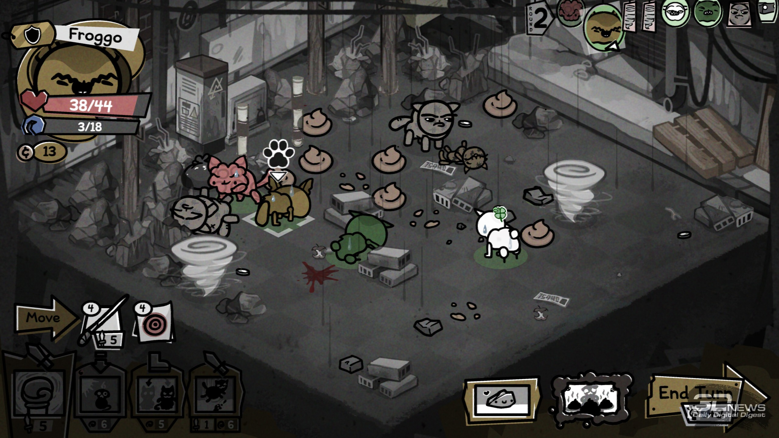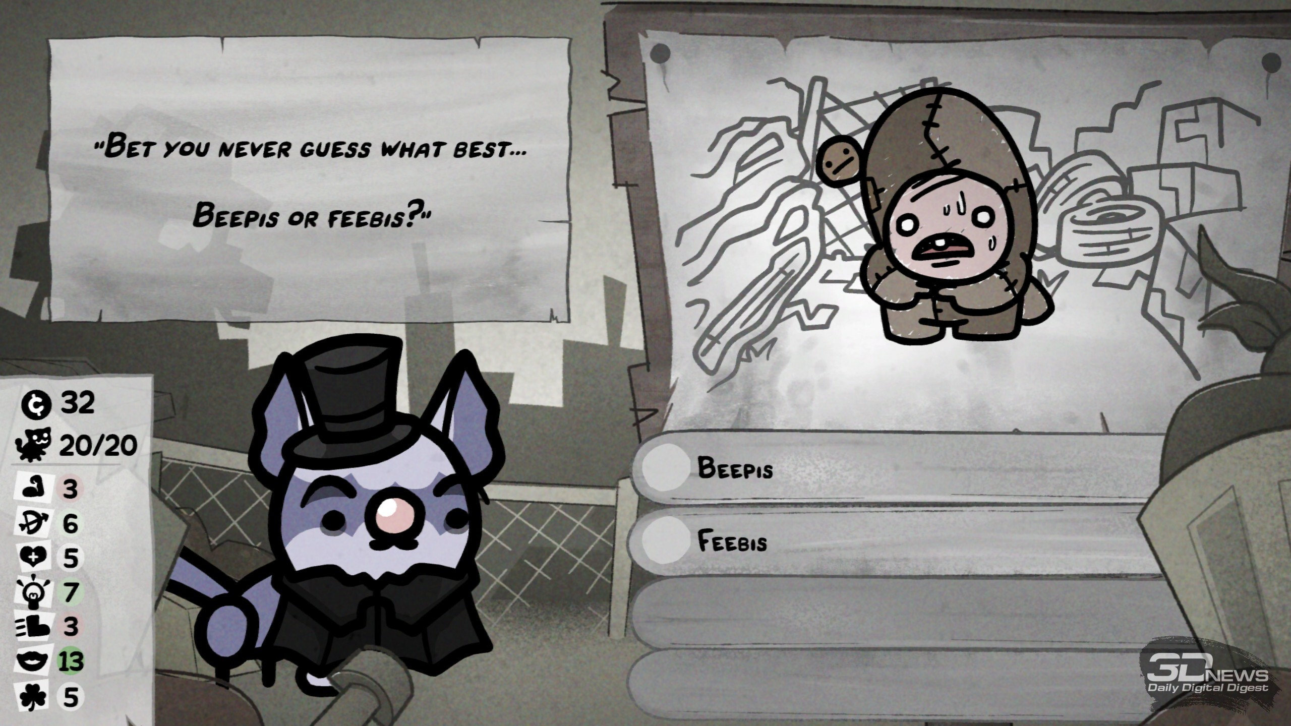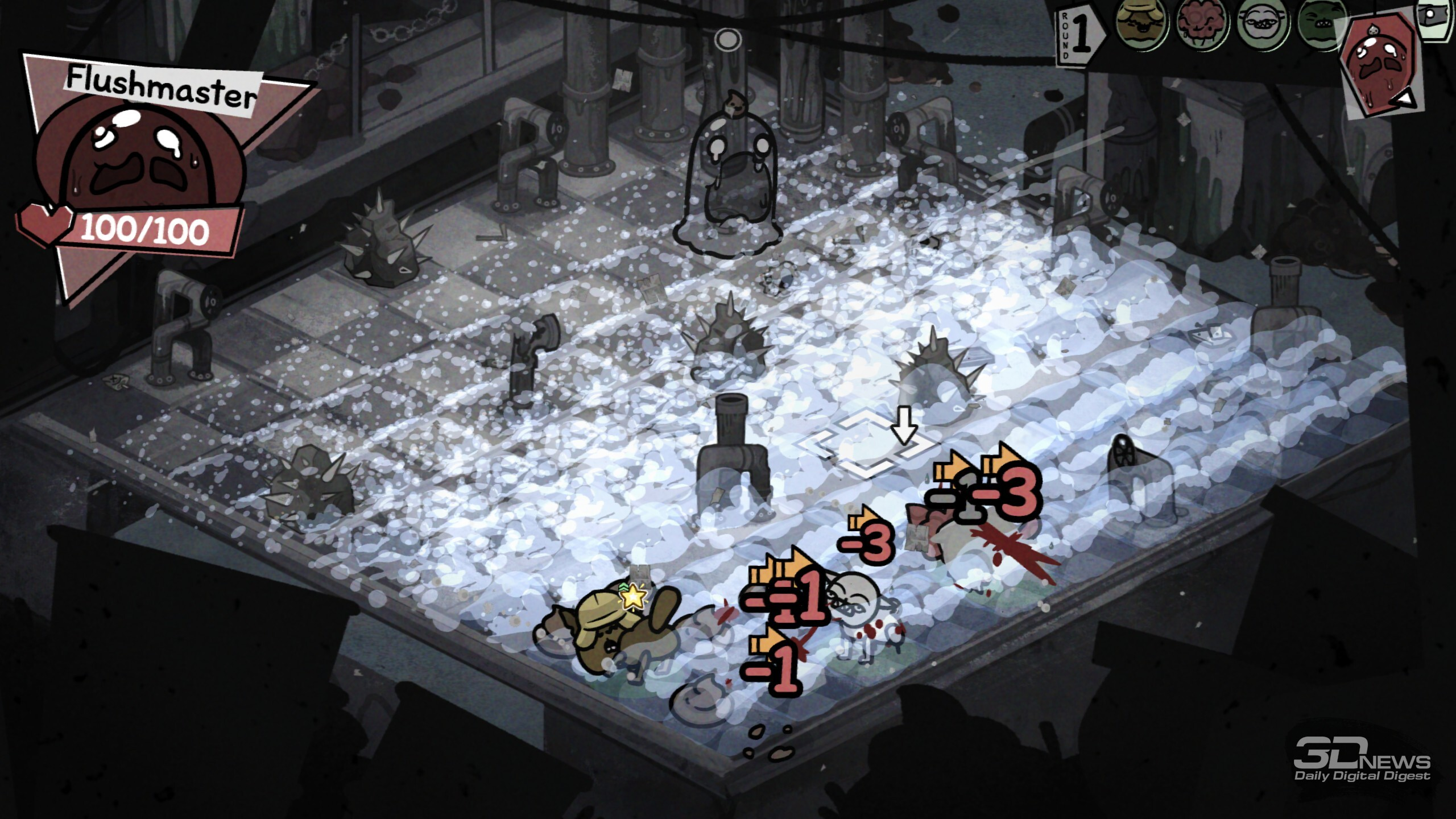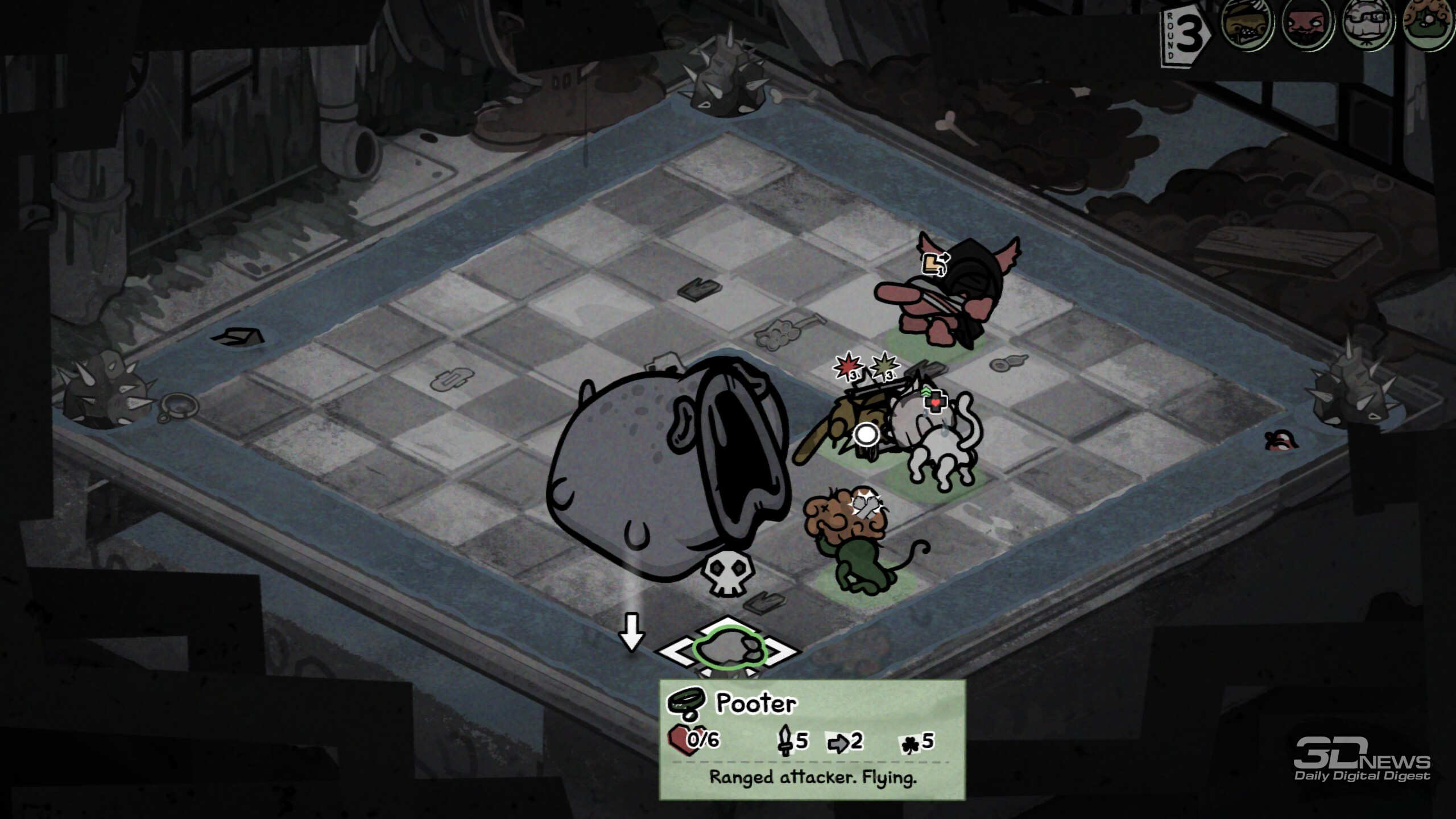 В забегах происходит множество разных случайных событий, исход некоторых зависит от удачи или конкретной характеристики котяры Ключ к успешному забегу лежит в грамотной синергии классов и умений отряда. В этом плане Mewgenics открывает необъятное поле для экспериментов. Даже во время базовой сборки отряда предстоит поломать голову, разрываясь между надёжной «классикой» «танк-клирик-лучник-маг» или совершенно безумным, но эффективным сочетанием вора, некроманта, монаха и мясника. Пораскинуть мозгами предстоит и каждый раз, когда необходимо выбирать способность для кота после боя, — тут стоит держать в голове то, как она может взаимодействовать с другими бойцами, какие комбинации можно будет провернуть и какие боевые манёвры в общем она открывает. Самих способностей здесь тьма-тьмущая. А ещё всегда стоит учитывать, куда направляется отряд, ведь каждый биом таит свои вызовы, своих особых врагов и свои суровые условия. Скажем, канализация заготовила встречу с жуткими четырёхпалыми акулами и мерзкими пиявками, что бросаются на ваших котов через половину арены. Да и сами места стычек нередко заставлены опасными объектами вроде гарпунов, которые притягивают любого проходящего мима бойца, колючих булыжников, что наносят дополнительные повреждения при контакте, и… обильного количества результатов деятельности пищевого тракта. Последнее хоть и не представляет угрозы котам, но может создать сложности лично вам — меня от обилия коричневых кучек стало довольно ощутимо подташнивать. Особенно когда из-за шалящего кишечника (в ходе забега коты могут подцепить болячки) мой танк почти каждый ход устраивал «коричневую бомбардировку». В пустыне же вас ждёт зной, который снижает эффект от лечения и вынуждает искать воду; в пещерах полно разных каменных структур — они усложняют перемещение и могут оказаться замаскированными врагами. А, скажем, арены на свалке полнятся битым стеклом, так что нужно тщательно продумывать позиционирование. И разумеется, в середине локации, а также в её финале вас ждут бои с суровыми боссами. Крыса в стильных очках заполоняет арену бомбами, гигантская паучиха — паутиной и своим выводком, пара других боссов реагирует на каждый удар по себе сближением или атакой, а хранитель кладбища по имени Диббак после смерти вселяется в вашего кота, вынуждая остальных биться против соратника. В таких битвах, учитывая все вводные, мозг буквально закипает, так что ошибиться, потерять котов и провалить часовой забег из-за глупых промахов здесь — обычное дело. Именно в такие моменты руки сами тянутся к ALT + F4, чтобы просто переиграть бой, не допуская совсем уж досадных оплошностей. И именно в этот момент вы познакомитесь со Стивеном. Впрочем, давние фанаты произведений Макмиллена не понаслышке знают о непростом характере персонажа. На этот раз Стивен блюдёт честность ваших забегов и, заметив «экстренный» выход, появится при следующей загрузке сохранения с предупреждением: «Не делай так, а то я вылезу из экрана и убью тебя». Сделаете так ещё раз — не убьёт (фух, пронесло), но выдаст штраф котам, из-за которого те могут спонтанно пропускать действия. И на этом он не остановится — продолжите выходить через ALT + F4 и… увидите, что будет. Я искренне оценила столь остроумное стремление Стивена (и Эдмунда с Тайлером) стимулировать игроко