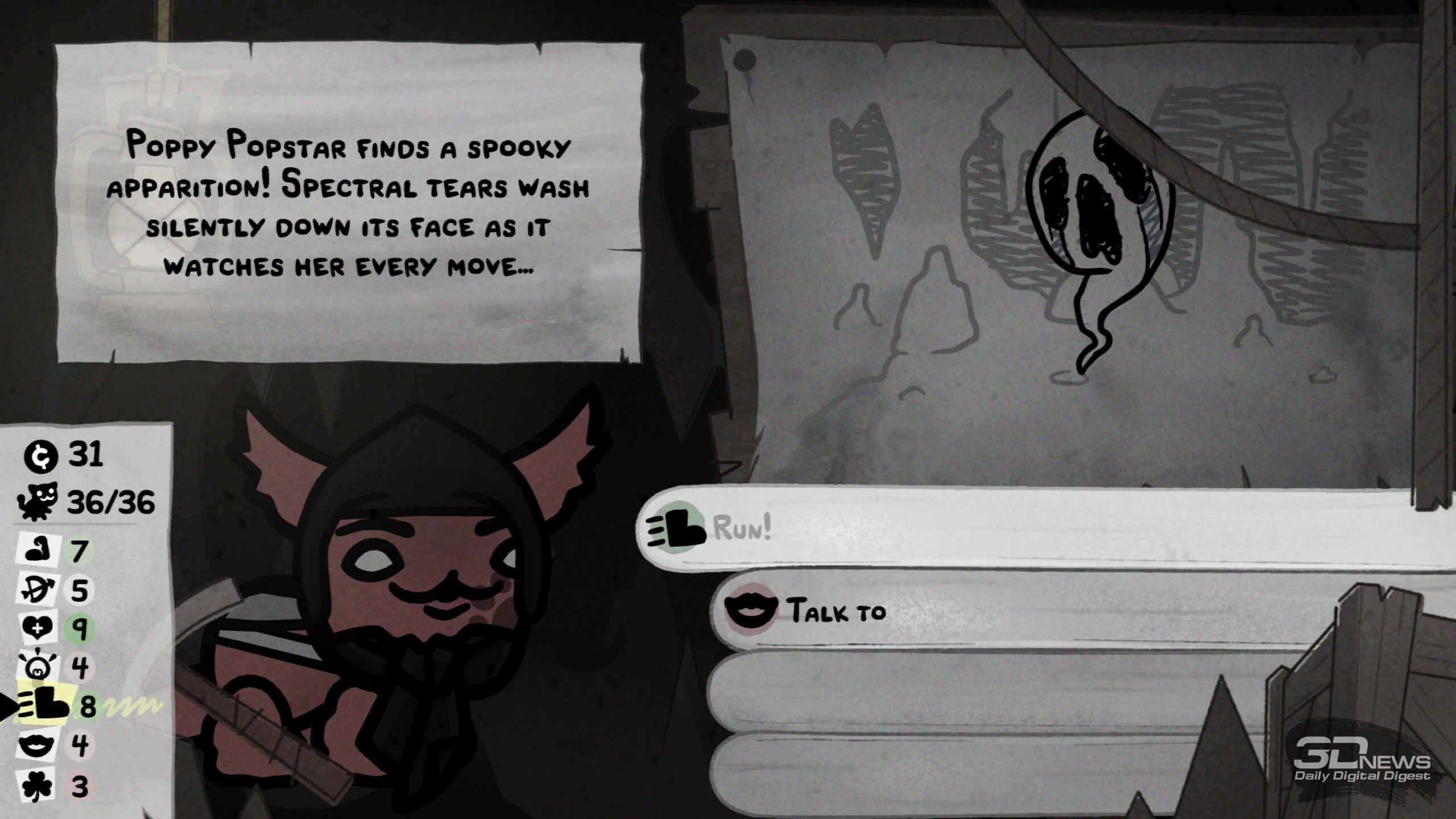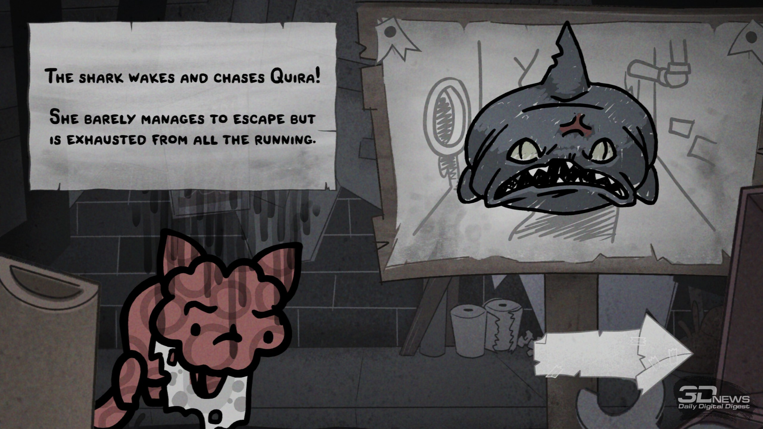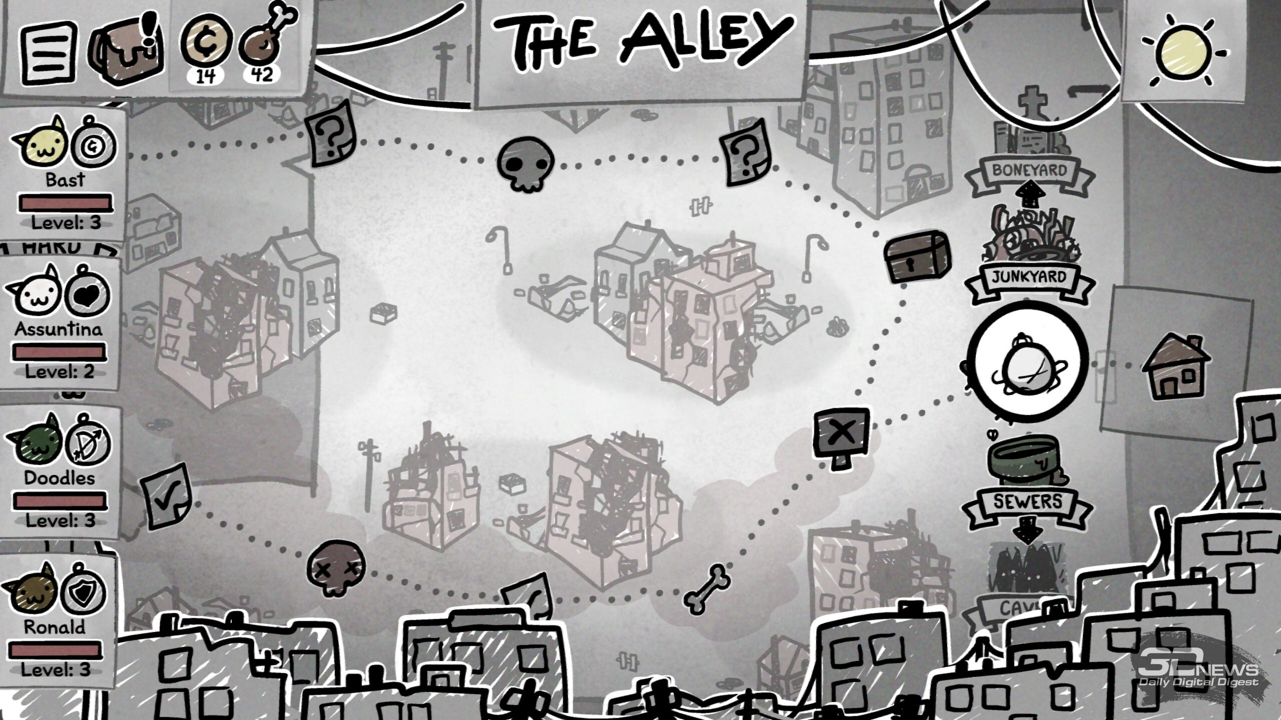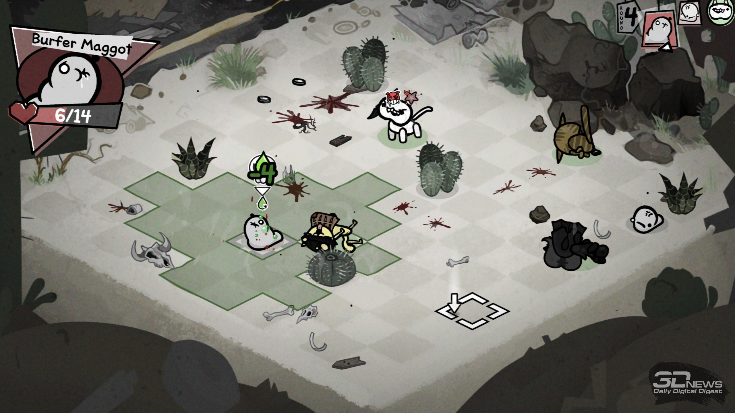 В забегах происходит множество разных случайных событий, исход некоторых зависит от удачи или конкретной характеристики котяры Ключ к успешному забегу лежит в грамотной синергии классов и умений отряда. В этом плане Mewgenics открывает необъятное поле для экспериментов. Даже во время базовой сборки отряда предстоит поломать голову, разрываясь между надёжной «классикой» «танк-клирик-лучник-маг» или совершенно безумным, но эффективным сочетанием вора, некроманта, монаха и мясника. Пораскинуть мозгами предстоит и каждый раз, когда необходимо выбирать способность для кота после боя, — тут стоит держать в голове то, как она может взаимодействовать с другими бойцами, какие комбинации можно будет провернуть и какие боевые манёвры в общем она открывает. Самих способностей здесь тьма-тьмущая. А ещё всегда стоит учитывать, куда направляется отряд, ведь каждый биом таит свои вызовы, своих особых врагов и свои суровые условия. Скажем, канализация заготовила встречу с жуткими четырёхпалыми акулами и мерзкими пиявками, что бросаются на ваших котов через половину арены. Да и сами места стычек нередко заставлены опасными объектами вроде гарпунов, которые притягивают любого проходящего мима бойца, колючих булыжников, что наносят дополнительные повреждения при контакте, и… обильного количества результатов деятельности пищевого тракта. Последнее хоть и не представляет угрозы котам, но может создать сложности лично вам — меня от обилия коричневых кучек стало довольно ощутимо подташнивать. Особенно когда из-за шалящего кишечника (в ходе забега коты могут подцепить болячки) мой танк почти каждый ход устраивал «коричневую бомбардировку». В пустыне же вас ждёт зной, который снижает эффект от лечения и вынуждает искать воду; в пещерах полно разных каменных структур — они усложняют перемещение и могут оказаться замаскированными врагами. А, скажем, арены на свалке полнятся битым стеклом, так что нужно тщательно продумывать позиционирование. И разумеется, в середине локации, а также в её финале вас ждут бои с суровыми боссами. Крыса в стильных очках заполоняет арену бомбами, гигантская паучиха — паутиной и своим выводком, пара других боссов реагирует на каждый удар по себе сближением или атакой, а хранитель кладбища по имени Диббак после смерти вселяется в вашего кота, вынуждая остальных биться против соратника. В таких битвах, учитывая все вводные, мозг буквально закипает, так что ошибиться, потерять котов и провалить часовой забег из-за глупых промахов здесь — обычное дело. Именно в такие моменты руки сами тянутся к ALT + F4, чтобы просто переиграть бой, не допуская совсем уж досадных оплошностей. И именно в этот момент вы познакомитесь со Стивеном. Впрочем, давние фанаты произведений Макмиллена не понаслышке знают о непростом характере персонажа. На этот раз Стивен блюдёт честность ваших забегов и, заметив «экстренный» выход, появится при следующей загрузке сохранения с предупреждением: «Не делай так, а то я вылезу из экрана и убью тебя». Сделаете так ещё раз — не убьёт (фух, пронесло), но выдаст штраф котам, из-за которого те могут спонтанно пропускать действия. И на этом он не остановится — продолжите выходить через ALT + F4 и… увидите, что будет. Я искренне оценила столь остроумное стремление Стивена (и Эдмунда с Тайлером) стимулировать игроко