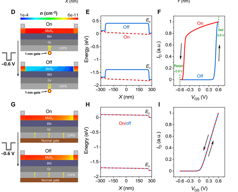 В целом предложенная структура сегнетоэлектрического транзистора с затвором длиной 1 нм выглядит следующим образом: канал из , тонкий диэлектрик h-BN (5 нм), плавающий затвор из многослойного графена, ферроэлектрический слой (CIPS) толщиной от 6,5 до 70 нм и затвор в виде металлической однослойной углеродной нанотрубки (m-SWCNT) длиной 1 нм. Благодаря экстремально малому радиусу кривизны нанотрубки происходит сильная концентрация электрического поля (усиление до 2,6 раза), что локально повышает напряжённость поля в сегнетоэлектрике до В/см при внешнем напряжении всего –0,6 В.