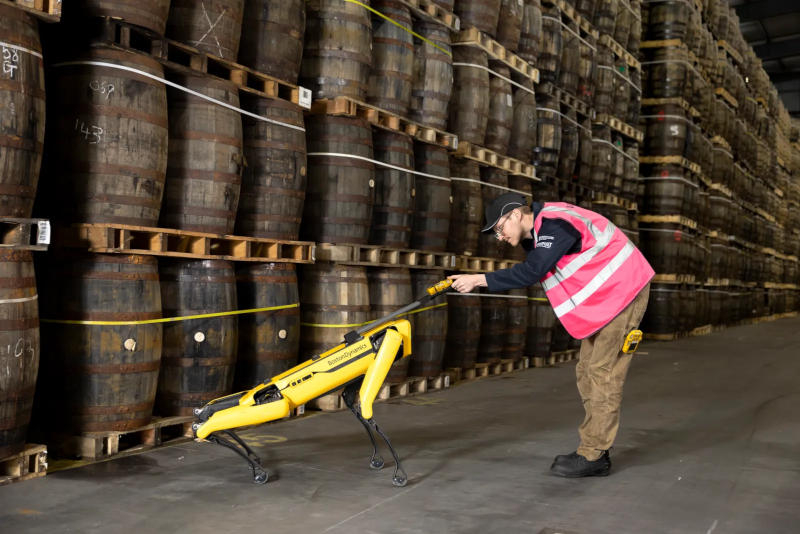Традиционный шотландский виски выдерживается в деревянных бочках, которые являются источником проблем в индустрии крепких спиртных напитков: бочки дают утечку, и очень часто. В распоряжении бренда Dewar’s более сотни складов, в которых размещены бочки для выдержки виски, — и на каждом по 25 000 бочек. Выдержка осуществляется от трёх до двенадцати лет, и многие бочки в какой-то момент начинают протекать. С потребностью обнаруживать их до истечения срока выдержки владеющая брендом Dewar’s компания Bacardi обратилась в Национальный производственный институт Шотландии (NMIS), где предложили завести на складе роботизированную собаку Boston Dynamics Spot с необходимыми модификациями.