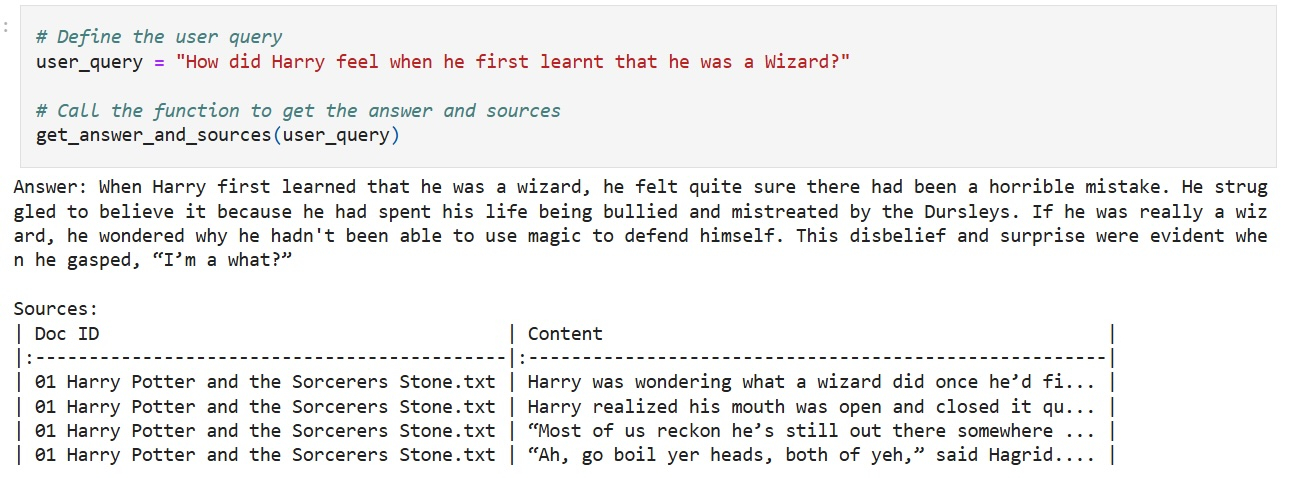 Обучая большие языковые модели, поклонники Гарри Поттера могли создавать системы вопросов и ответов, способные извлекать соответствующие отрывки из книг. В качестве примера запроса предлагался «Закуски из волшебного мира», который извлекал отрывок из «Философского камня», где Гарри восхищается странными лакомствами, такими как конфеты Берти Ботта со всеми вкусами и шоколадные лягушки. Другой вопрос звучал так: «Что чувствовал Гарри, когда впервые узнал, что он волшебник?»