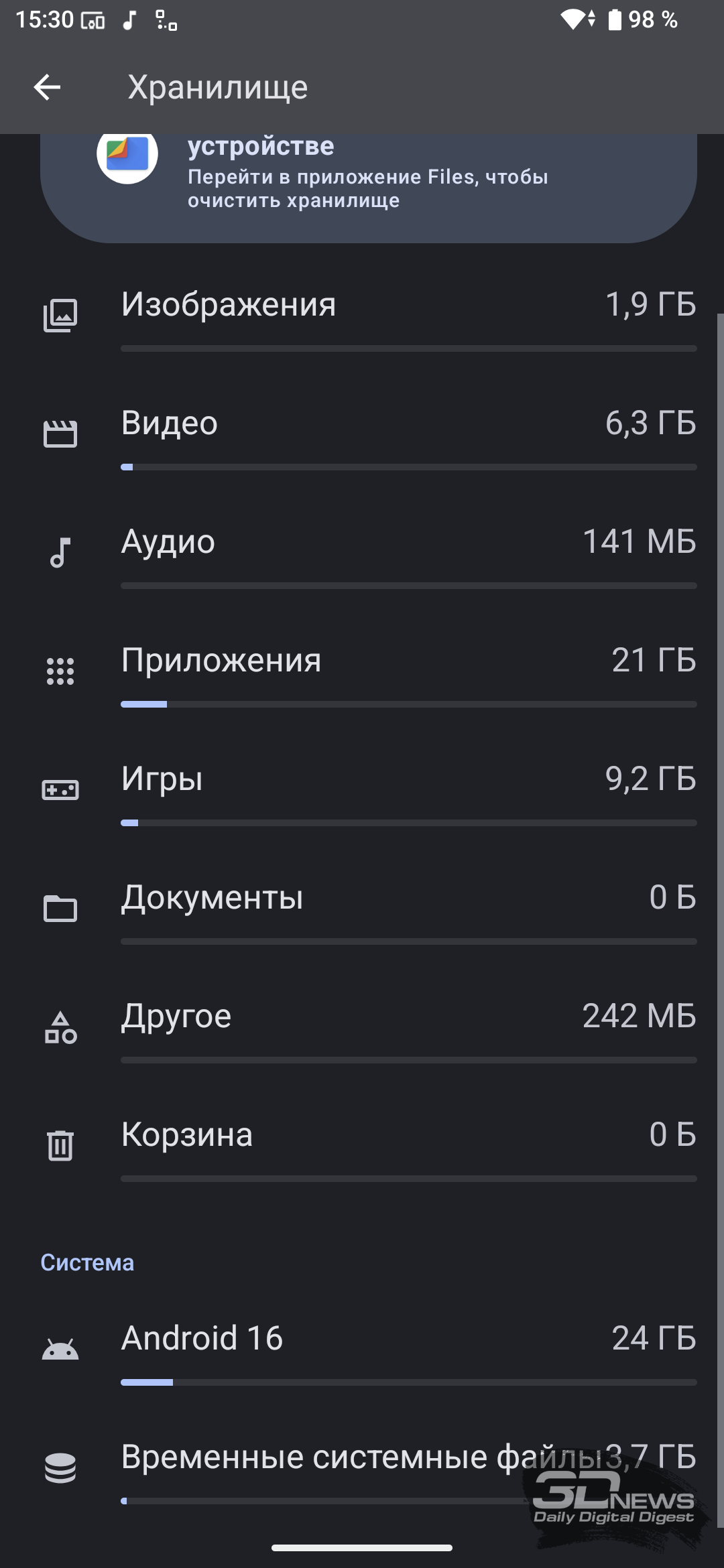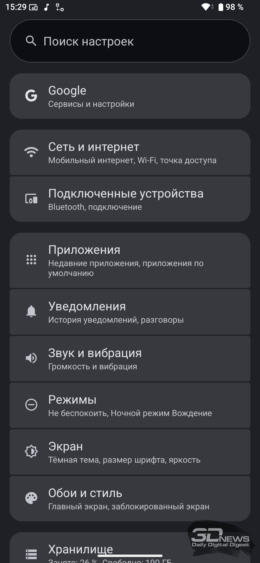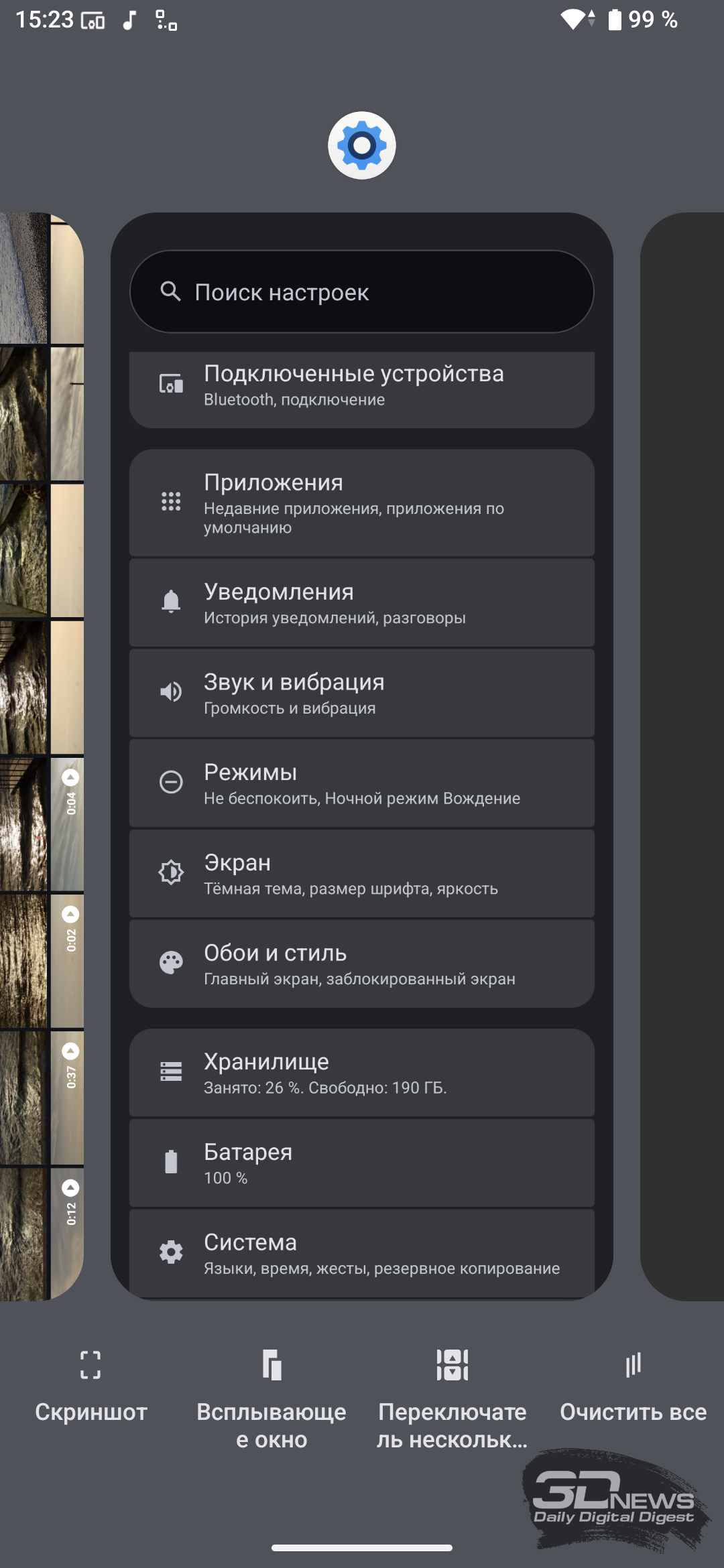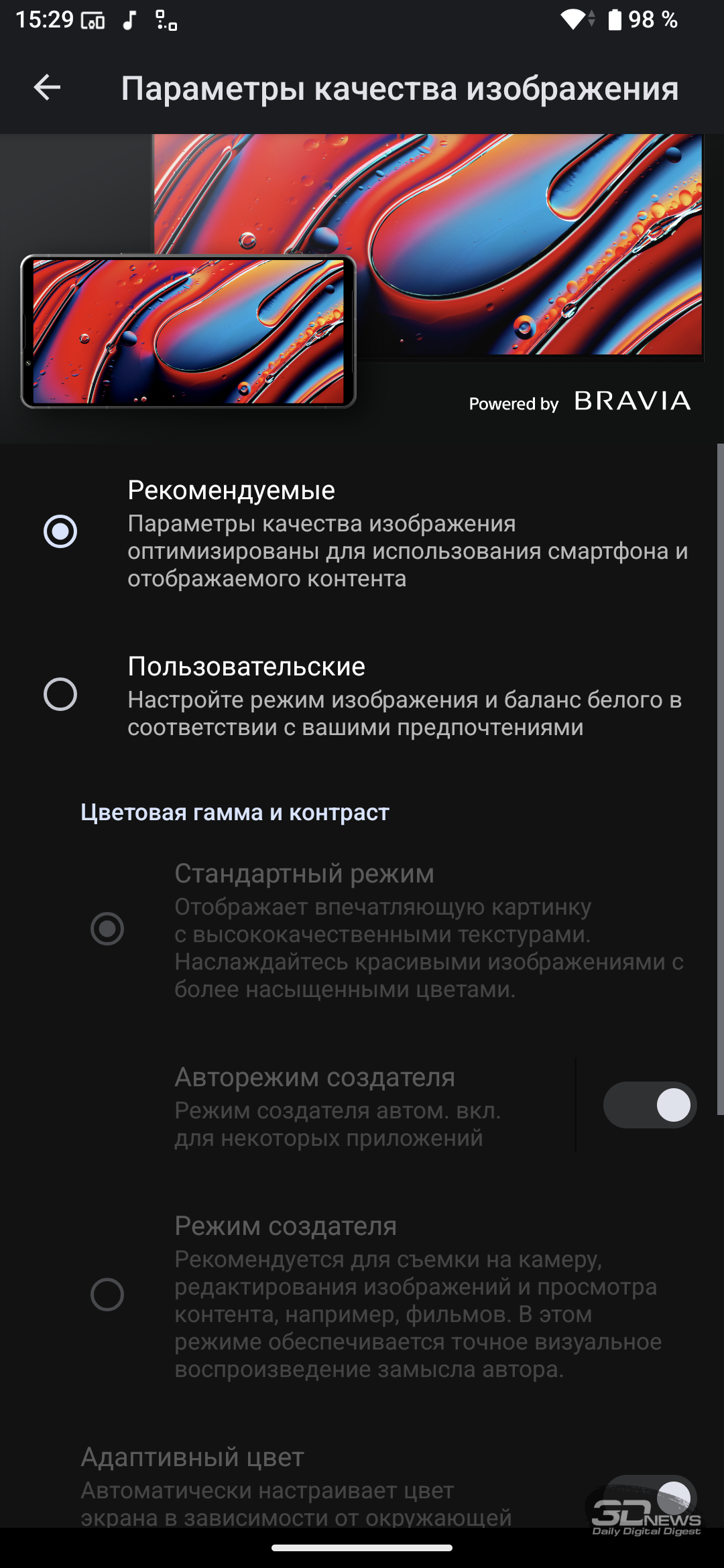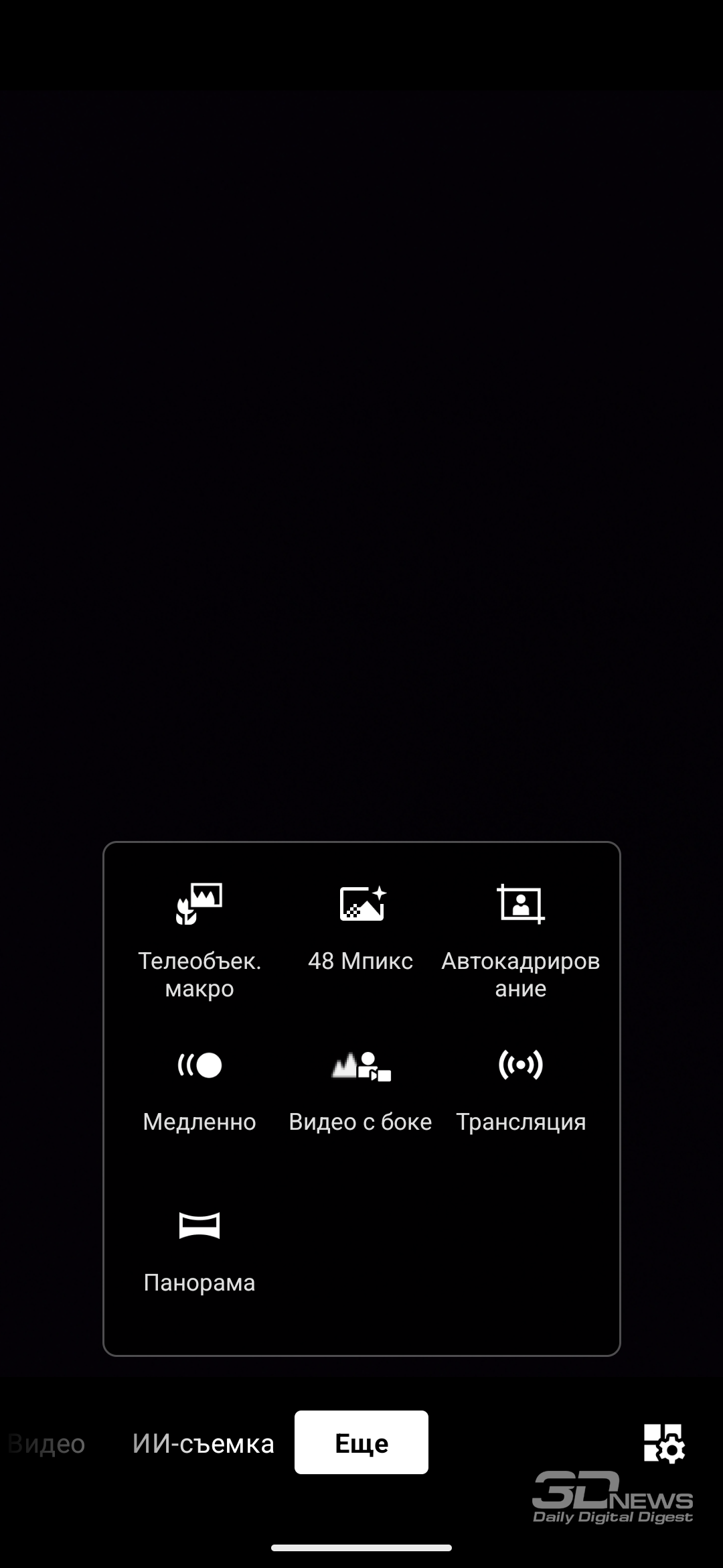Что-то свежее сказать об этой системе нельзя — Android есть Android, специфики у Sony тут немного. Тот самый фирменный софт в основном касается создания контента — тут и приложение камеры с богатыми и нетипичными возможностями (о нем поговорим в соответствующем разделе), и приложение для редактирования видео, и плеер, и игровой хаб, и приложение для управления звуком (пригодится, в первую очередь, если у вас наушники Sony). При этом отсутствуют какие-либо нейросетевые инструменты, кроме встроенных в камеру (тут есть кое-что новое) и стандартного интегрированного в любой смартфон на Android Google Gemini (вызывается долгим нажатием на клавишу питания, но без некоторых ухищрений в России не работает). Функционирует система, если честно, так себе — есть вероятность, что доставшийся мне экземпляр из той самой бракованной первой партии, но, скорее всего, у смартфона просто есть хронические болезни, ведь даже многочисленные обновления их не вылечили. А за полторы недели тестирования обновлений этих прилетело не меньше трех. И чтобы скачать каждое из них, приходилось включать VPN. А сменить тему интерфейса и вовсе не представлялось возможным — этот раздел в настройках попросту не работал. Приложение камеры три-четыре раза схлопывалось с ошибкой. А некоторые сторонние приложения (вроде Telegram) работали не так, как должно. В целом скорость работы смартфона и удобство пользования вроде бы не вызывают вопросов — примерно такого и ждешь от флагмана. Но ощущается серьезная червоточина где-то в программной глубине гаджета, отравляющая впечатление раздражающими мелочам — при общей унификации современных телефонов случай уникальный. Добавлю, что в памяти система занимает аж 24 Гбайт, что необычно для «чистого» Android. Про сканер отпечатков я уже говорил выше — он здесь вмонтирован в клавишу питания на правой грани. Здесь стоит сказать, что Sony, как и раньше, не допускает использования на своих смартфонах системы распознавания лица, считая, видимо, этот метод недостаточно надежным. Так что будьте готовы регулярно перезаписывать отпечатки, площадь покрытия сенсора не оставляет выбора, проверено практикой. При этом в остальном сканер работает хорошо – есть приятная тактильная отдача и возможностью активировать смартфон как прикосновением к клавише, так и ее нажатием — во избежание случайных срабатываний. При разблокировании касанием у меня было, к слову, немало случайных включений смартфона в кармане, сенсор гиперчувствительный. ⇡#Дисплей и звукЭкран на смартфонах Sony Xperia 1, как и дизайн, тоже почти не меняется. Но в прошлом поколении все же произошли изменения — как минимум, разрешение «похудело» с прежнего запредельного для мобильного устройства 4K до, наоборот, кажущегося недостаточным Full HD (2340 × 1080 точек). Здесь та же самая панель, два раза подряд ее в Sony менять никто не будет. Плотность пикселей, соответственно, 396 ppi при диагонали 6,5 дюйма. Теоретически цифры совсем не впечатляющие, но на практике разницу в картинке на Xperia 1 VII и у любого из конкурентов с плотностью свыше 400 ppi увидеть почти невозможно. Панель — LTPO OLED. Экран умеет менять частоту обновления с минимальным шагом в диапазоне от 1 до 120 Гц. В играх максимальная частота поддерживается. Формат экрана стандартный – 19,5:9 (раньше было 21:9 — менее привычно по восприятию, но зато держать смартфоны было еще удобнее). 