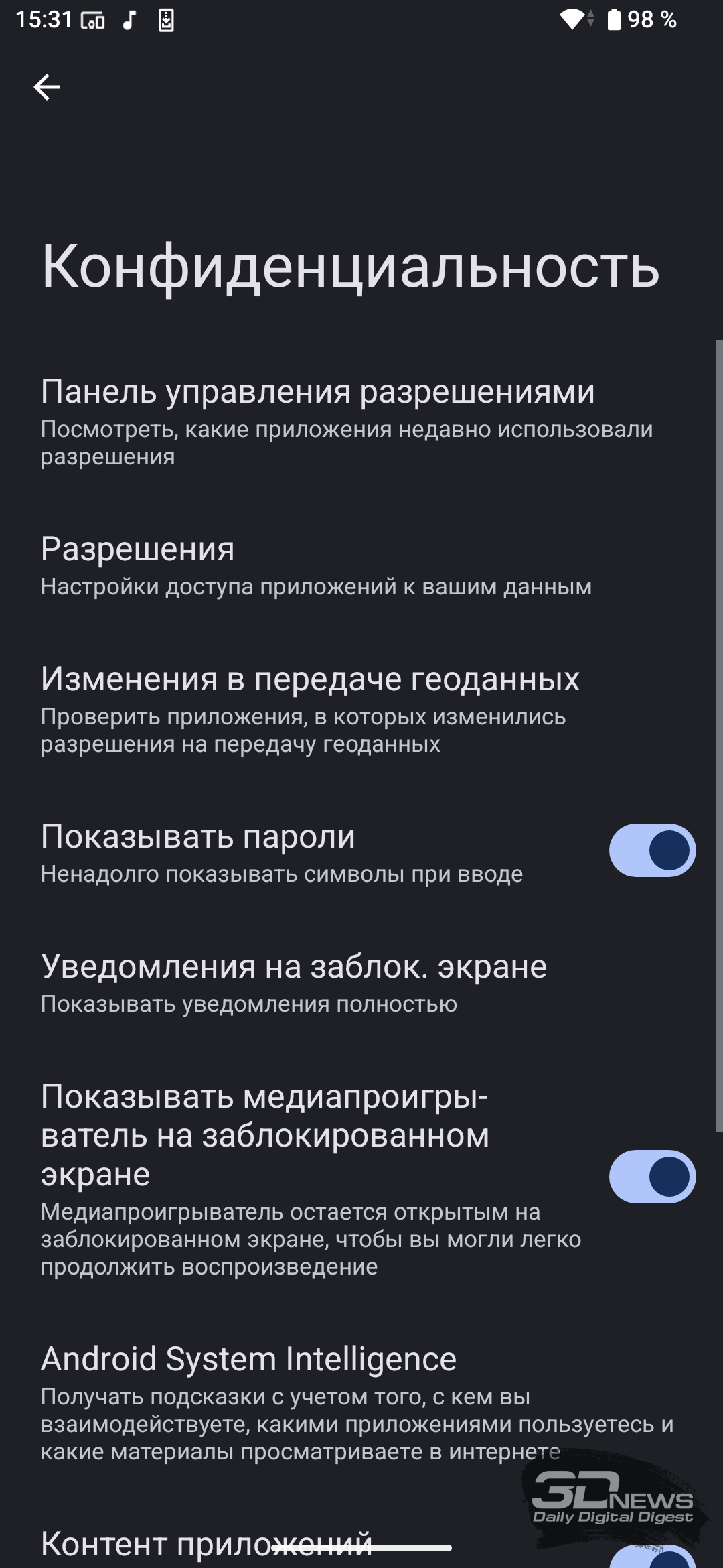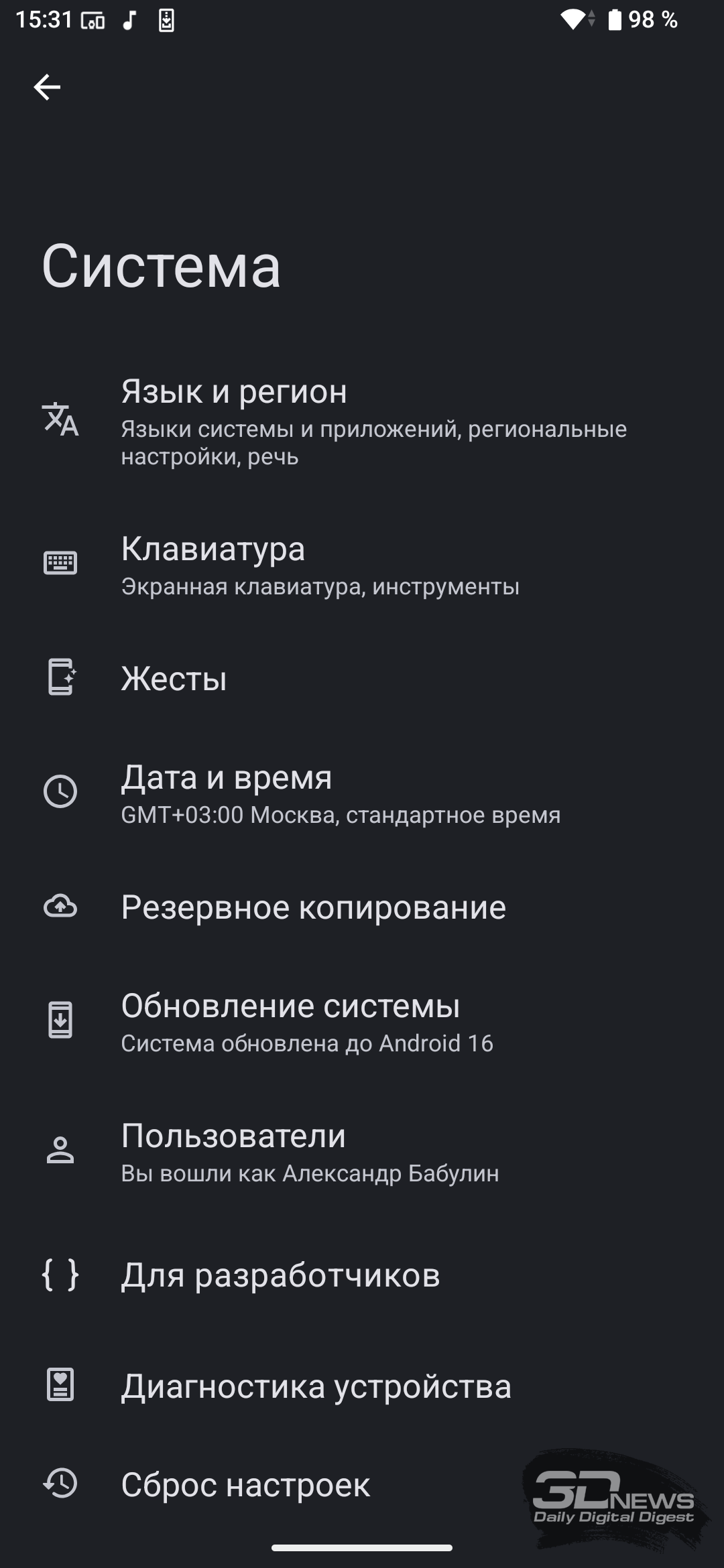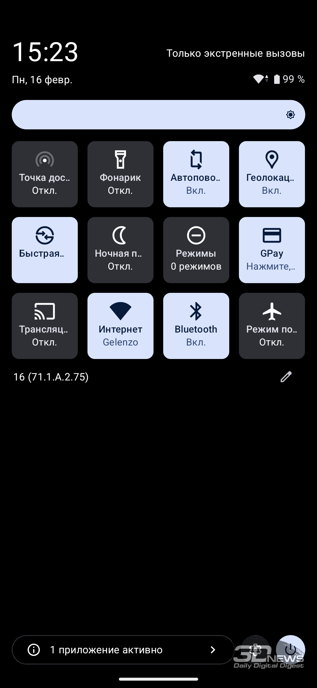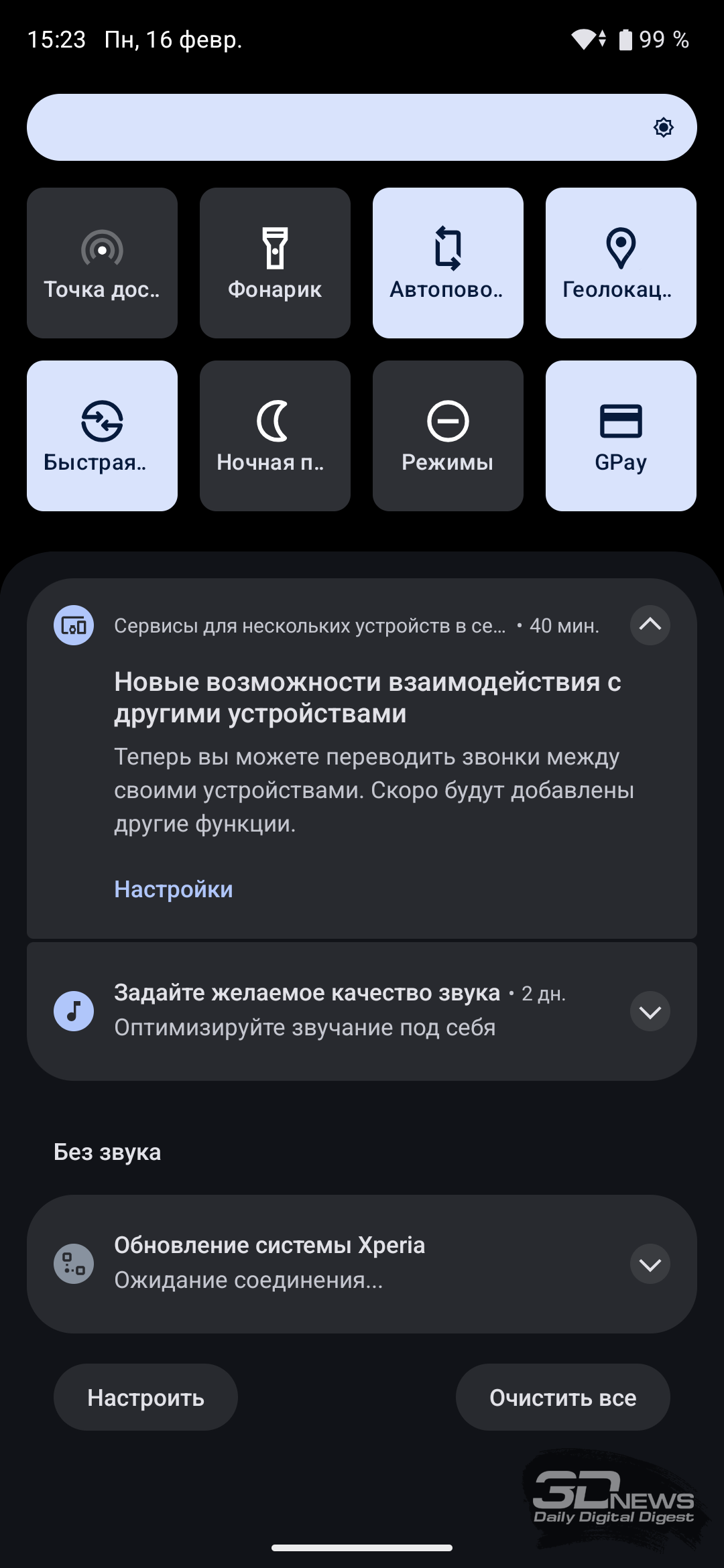 Sony Xperia 1 VII, правая грань: клавиша регулировки громкости, клавиша питания со сканером отпечатков, кнопка спуска камеры Функциональные элементы порадуют любого ретрограда, да и не только ретрограда; многим любителям максимальной универсальности они тоже придутся по душе. Тут и мини-джек, расположенный на верхней грани, и фирменный слот для карточек (куда помимо симок можно вставить и MicroSD), не нуждающийся в штырьковом замке, и выделенная кнопка спуска на правой грани. Классика, которая не может надоесть. А вот сканер отпечатков в клавише питания — это все же, нам мой вкус, излишний традиционализм. Впрочем, и это многим придется по душе, экранные датчики не у всех вызывают восторг. Добавлю, что кнопка спуска фотокамеры реализована Sony все еще лучше всех. Подобные органы управления встречаются время от времени и на других смартфонах (обычно это функциональные клавиши, правда), но чтобы симулировать отдачу, как на серьезной фотокамере, полунажатие для наведения автофокуса — такого по-прежнему нет ни у кого больше. ⇡#Программное обеспечениеSony Xperia 1 VII в базе работает под управлением Android 15 – фактически без оболочки как таковой. Есть только фирменные темы интерфейса (в том числе и значки, и, частично, подрихтованная логика), да набор фирменного софта. Сразу после запуска смартфон предлагает обновиться до актуальной версии Android, так что тестировал я устройство уже с шестнадцатым «роботом». Всего обещают до четырех системных обновлений — слабовато для флагмана, если честно. Интерфейс Android 16 на Sony Xperia 1 VII