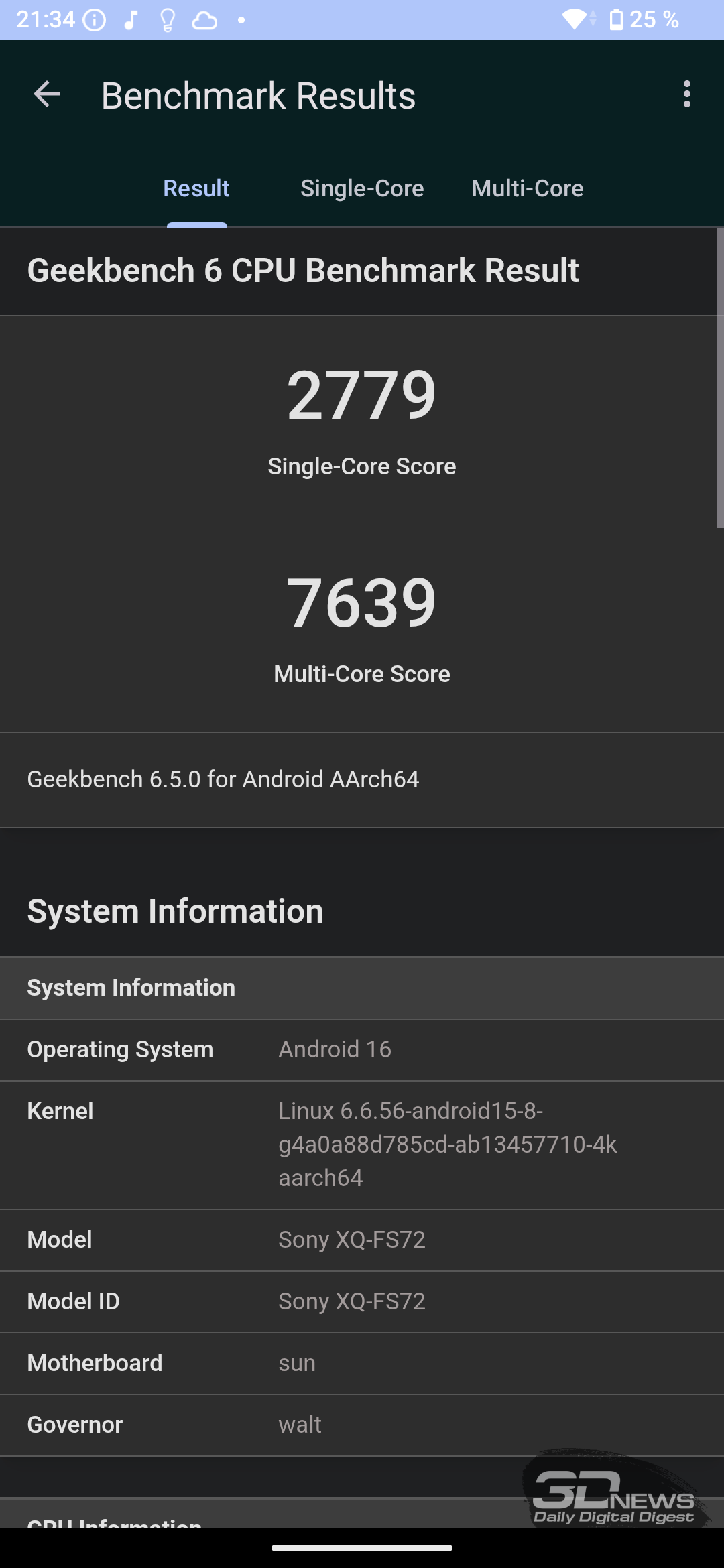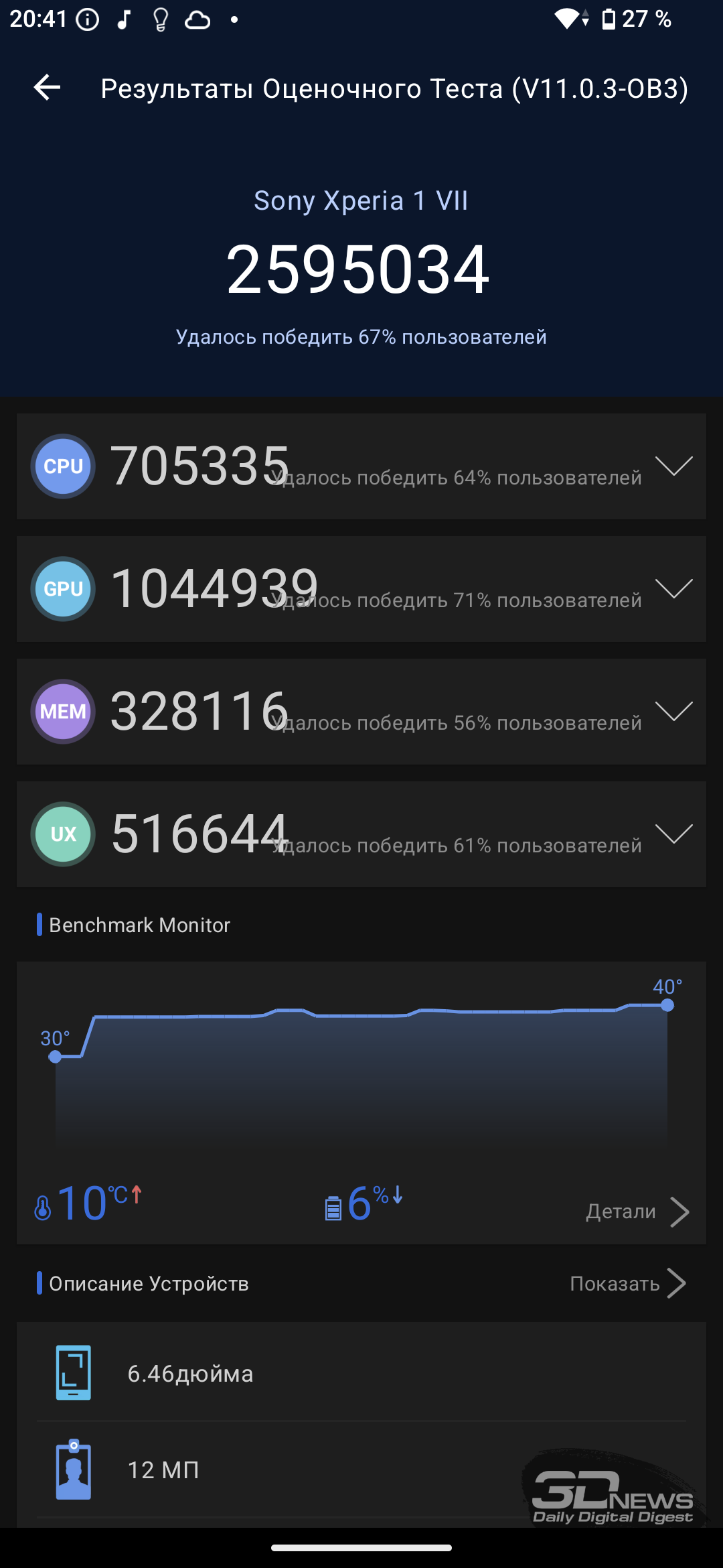 Смотреть все изображения (11) Если по мощи, скорее всего, сюрпризов быть не могло, то вот в вопросе охлаждения висела интрига — Snapdragon 8 Elite та еще «печка», с ней справились далеко не все. Sony прошла эта испытание успешно — троттлинг не превышает 40 % (неплохой уровень для флагманской платформы), к перегреву гаджет не подбирается, хотя под нагрузкой температура ядра достигает 47 °C. Немало. В Sony Xperia 1 VII используются накопители стандарта UFS 4.0 (емкостью 256 или 512 Гбайт) и оперативная память LPDDR5x на 12 Гбайт с возможностью расширения (у накопителя забирается 8 дополнительных гигабайт). Есть слот для карты памяти – ее можно устанавливать вместо второй SIM-карты. У нас на тестe был Sony Xperia 1 VII c 256 Гбайт памяти. ⇡#Связь и беспроводные коммуникацииСо связью у Sony Xperia 1 VII все стандартно (то есть, по факту, хорошо). В наличии и 5G-, и LTE-модем с поддержкой всех необходимых для корректной работы (в том числе и в России) диапазонов. Имеется два слота для карточек Nano-SIM, что бывает у флагманов не всегда. Также можно подключить виртуальную симку – вместо одной из реальных VoLTE работает нормально.