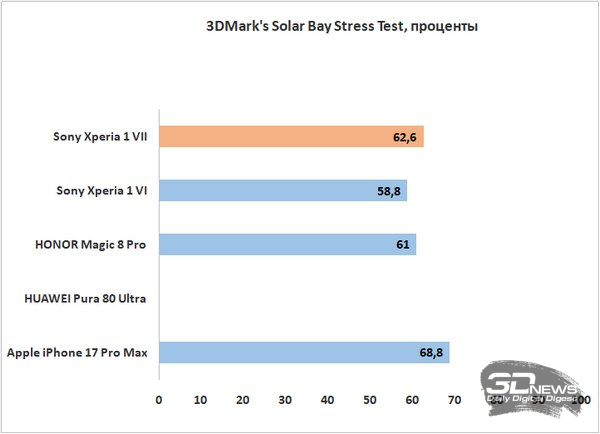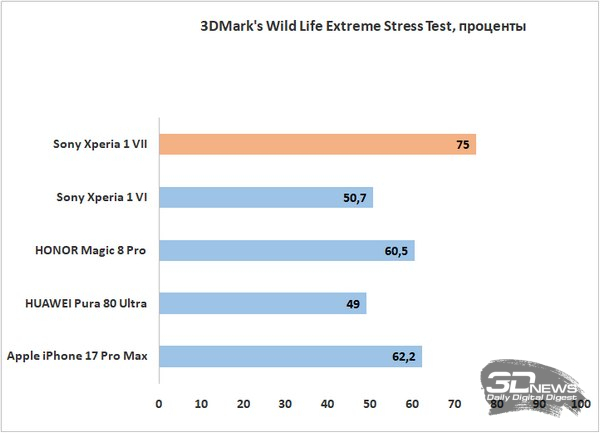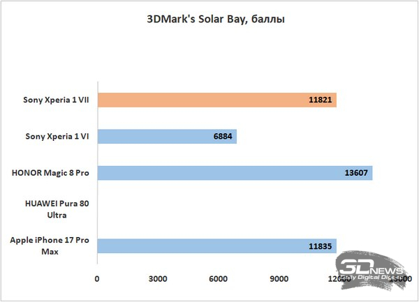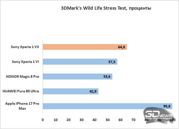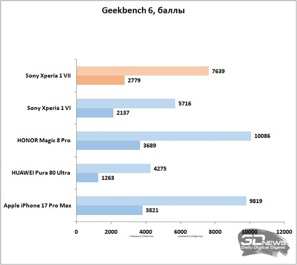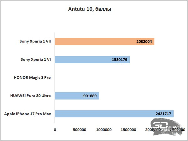 Sony Xperia 1 VII, цветовой охват в режиме создателя. Серый треугольник – охват sRGB, белый треугольник – охват Xperia 1 VII В режиме создателя цветовой охват уже в точности соответствует sRGB. Средняя гамма та же — 2,18, цветовая температура неожиданно чуть повышается, приближаясь к значению 7 000 К. Среднее отклонение DeltaE по шкале Color Checker составляет уже 1,85, что входит в границы не только нормы, но и эталонного значения (2,00). Дисплей настроен очень хорошо. Со звуком у Sony Xperia 1 VII, как и у всех предшественников, дела обстоят здорово. Можно даже сказать, смартфоны бренда неизменно удерживают лидерство в этом плане. Мини-джек в сочетании с качественным аналоговым звуковым трактом дополнен в этот раз Bluetooth 6.0 с поддержкой Dolby Atmos и Snapdragon Sound, обеспечена работа с профилями aptX, aptX HD, aptX Adaptive и LDAC. Ну и есть стереодинамики очень серьезного уровня, причем звук выводится во фронтальную плоскость смартфона — ничего подобного на рынке нет ни у кого. ⇡#«Железо» и производительностьSony Xperia 1 VII был анонсирован еще в мае 2025-го, так что нет ничего удивительного в том, что он получил аппаратную платформу Qualcomm Snapdragon 8 Elite, предельно актуальную на тот момент. Впрочем, надо сказать, что и сейчас она не потеряла своей актуальности, несмотря на массовое появление смартфонов на базе Snapdragon 8 Elite Gen 5 – все-таки последняя прорыва не совершила. Напомним архитектуру Qualcomm Snapdragon 8 Elite: два старших ядра Oryon V2 Phoenix L тактовой частотой 4,32 ГГц и шесть ядер Oryon V2 Phoenix M частотой до 3,53 Гц сопровождаются графической подсистемой Adreno 830 частотой 1,1 ГГц. Набор инструкций – ARMv9.2-A. Собирается чипсет на фабриках TSMC по 3-нм техпроцессу. По мощи к смартфону и не могло быть вопросов, если только не произошло какого-то форс-мажора с интеграцией прекрасно знакомой платформы. С этим все нормально — Xperia 1 VII и в бенчмарках показывает хорошие цифры, и в реальных задачах проявляет себя молодцом: работает гладко, приложения открывает быстро, в соревновательных играх выдает 120 кадров в секунду. Такого запаса, как у смартфонов на актуальных платформах, нет, но, на самом деле, едва ли в течение жизненного цикла Xperia вы почувствуете это. Результаты синтетических тестов Sony Xperia 1 VII