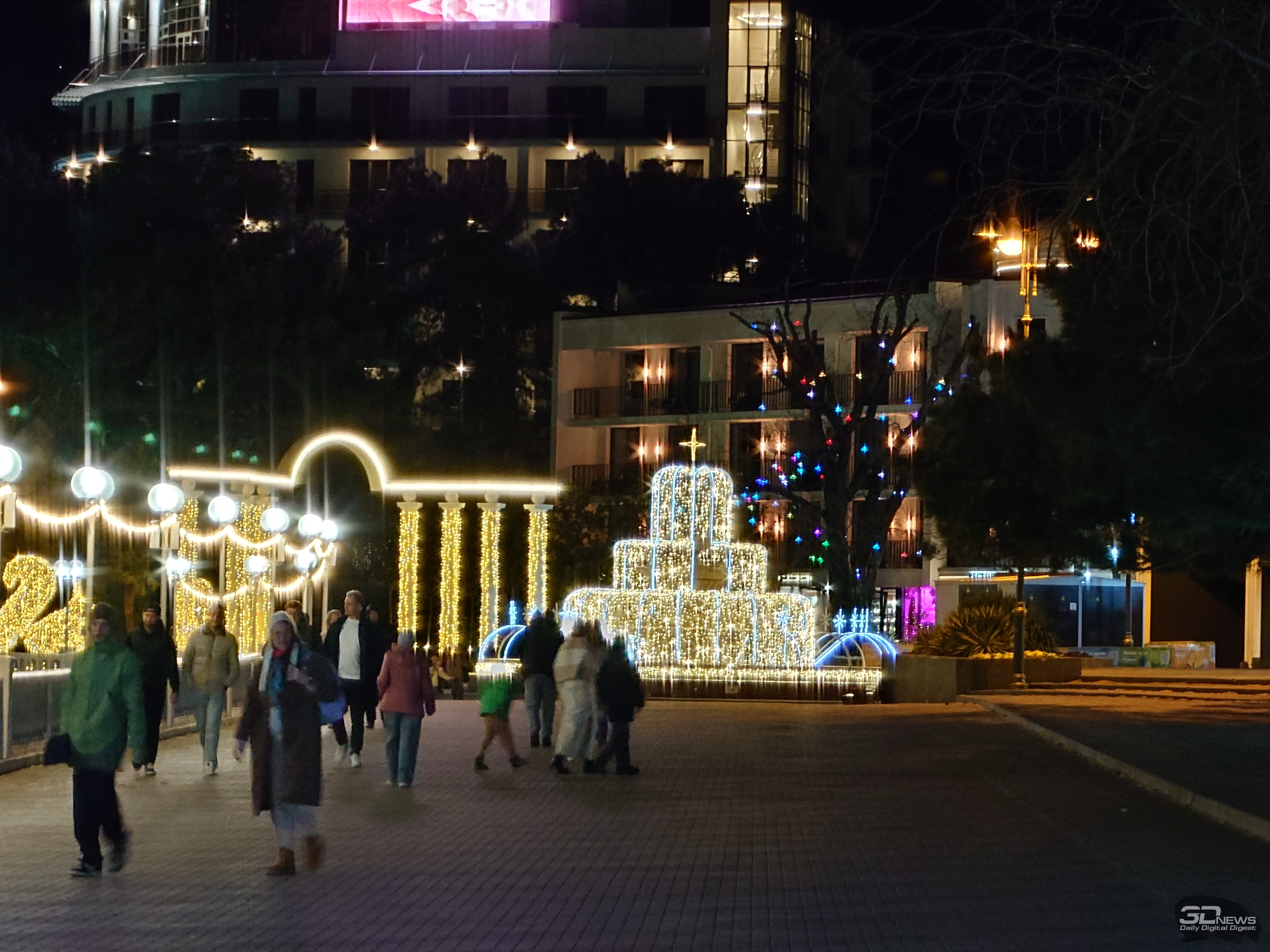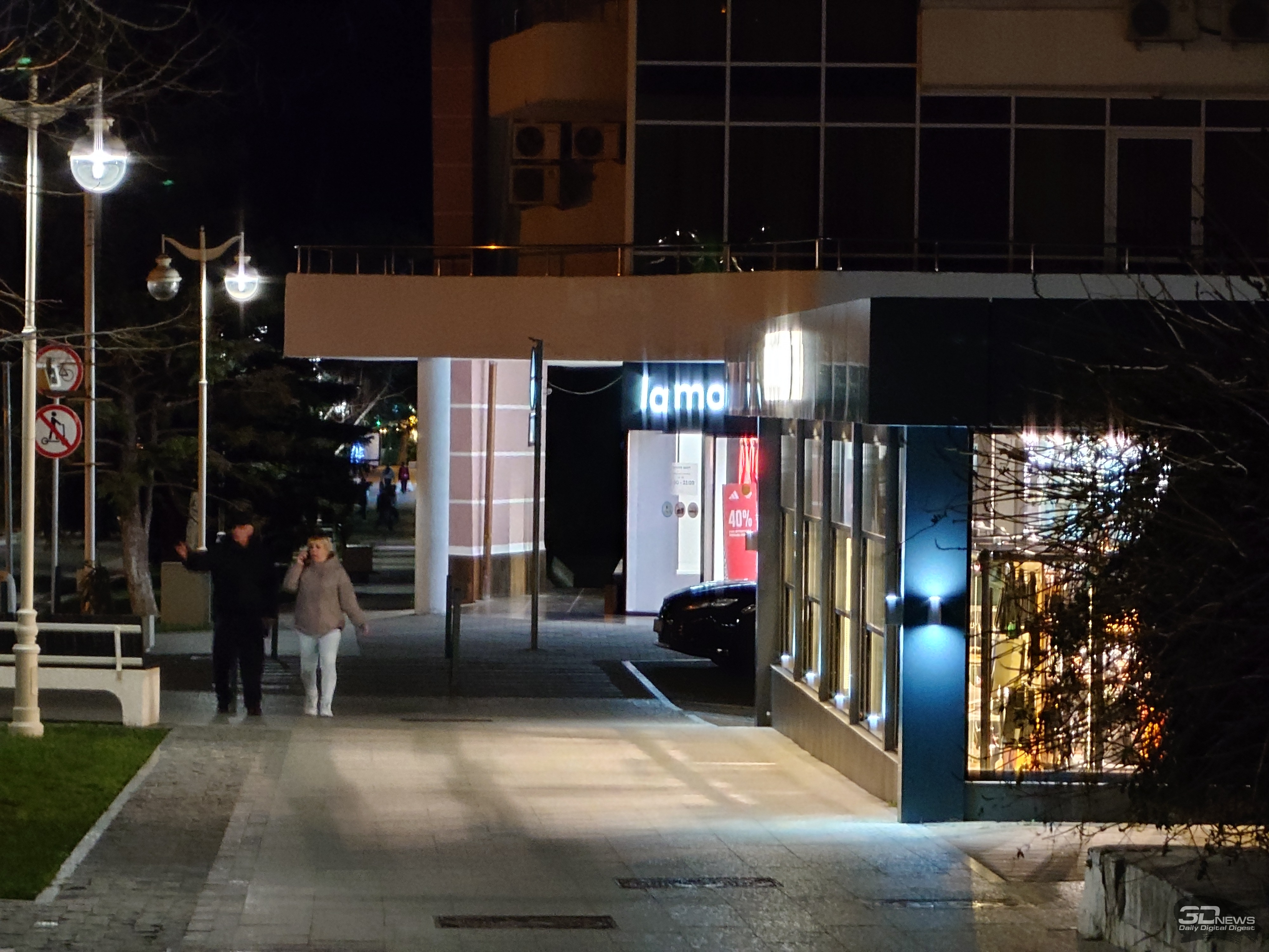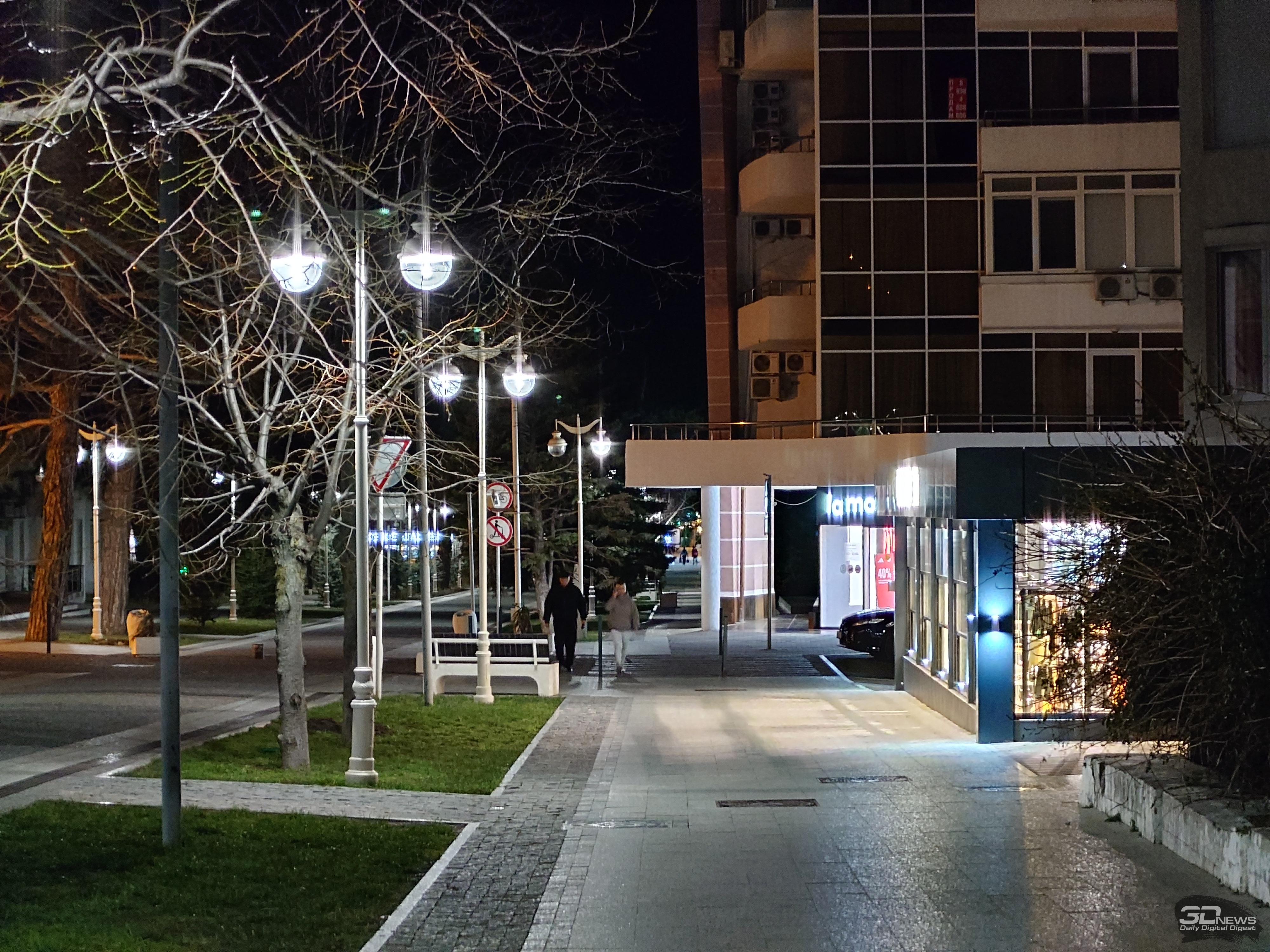В базовом меню съемки мы видим пять доступных фокусных расстояний — помимо уже упомянутых опций также есть двукратный «гибридный» зум за счет кропа с 48-мегапиксельной картинки, сделанной на главную камеру. Качество съемки на главную камеру днем — высокое: отмечаем хорошую детализацию без выраженного «перешарпа» (хотя слегка жирные контуры присутствуют, без этого вообще редко обходится) и достойный динамический диапазон. В прошлом поколении обработка снимков была приближена к той, что мы привыкли на камерах — то есть приходилось очень сильно следить за экспозицией самостоятельно и, чтобы добиться нужного баланса светов и теней, обрабатывать затем фото в редакторе. Здесь при съемке в базовом режиме все более привычно для смартфона — HDR задействуется по умолчанию, баланс между светлыми и темными областями ровный, недосвеченные или пересвеченные снимки днем получаются редко. А вот ночью камера не блещет — довольно слабо работает с источниками освещения (есть и блики, и засветы), не хватает детализации, которая как раз «вытягивается» за счет повышения контурной резкости. Но это в условиях совсем слабой освещенности. Ночной город на главную камеру Xperia 1 VII можно снимать без проблем. Двукратный «гибридный» зум (кроп от 48-мегапиксельной картинки с последующей обработкой) реализован вполне приемлемо – есть легкая замыленность, но в целом режим рабочий днем и в вечерних/ночных условиях при хорошем внешнем освещении. Глубокой ночью же и резкость падает, и серьезные шумы при этом есть.