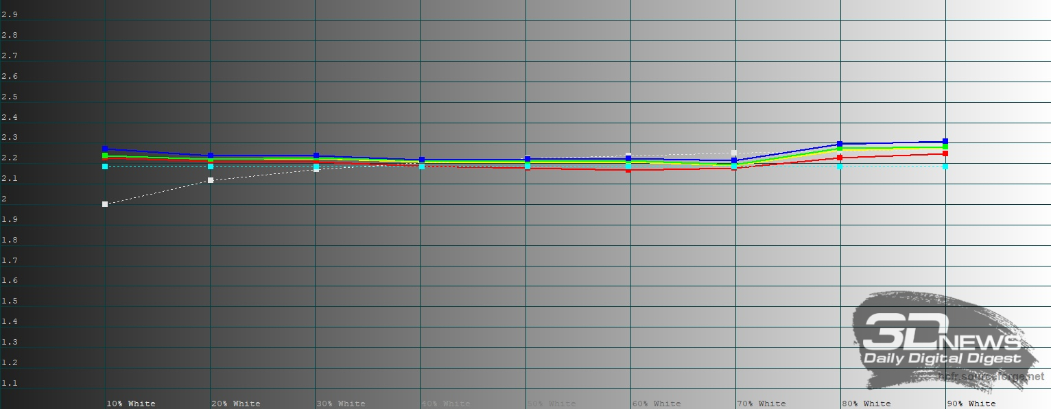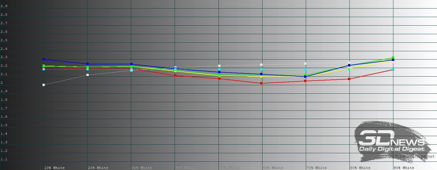 Sony Xperia 1 VII, цветовой охват в стандартном режиме. Серый треугольник – охват DCI-P3, белый треугольник – охват Xperia 1 VII В стандартном режиме цветовой охват оказывается чуть шире sRGB, но даже не приближается в DCI-P3. Цветовая температура близка к эталону, 6 500 К — интересный и приятный поворот от Sony, которая всегда делала ставку на холодную цветопередачу. Гамма близка к норме – 2,18 в среднем при стабильных кривых. Среднее отклонение DeltaE по шкале Color Checker, включающей в себя как широкий спектр цветов, так и оттенки серого, составляет 2,85 при норме в 3,00.