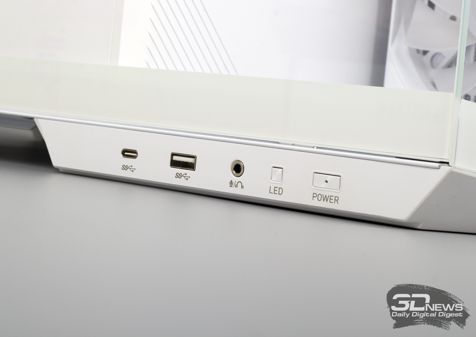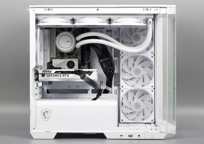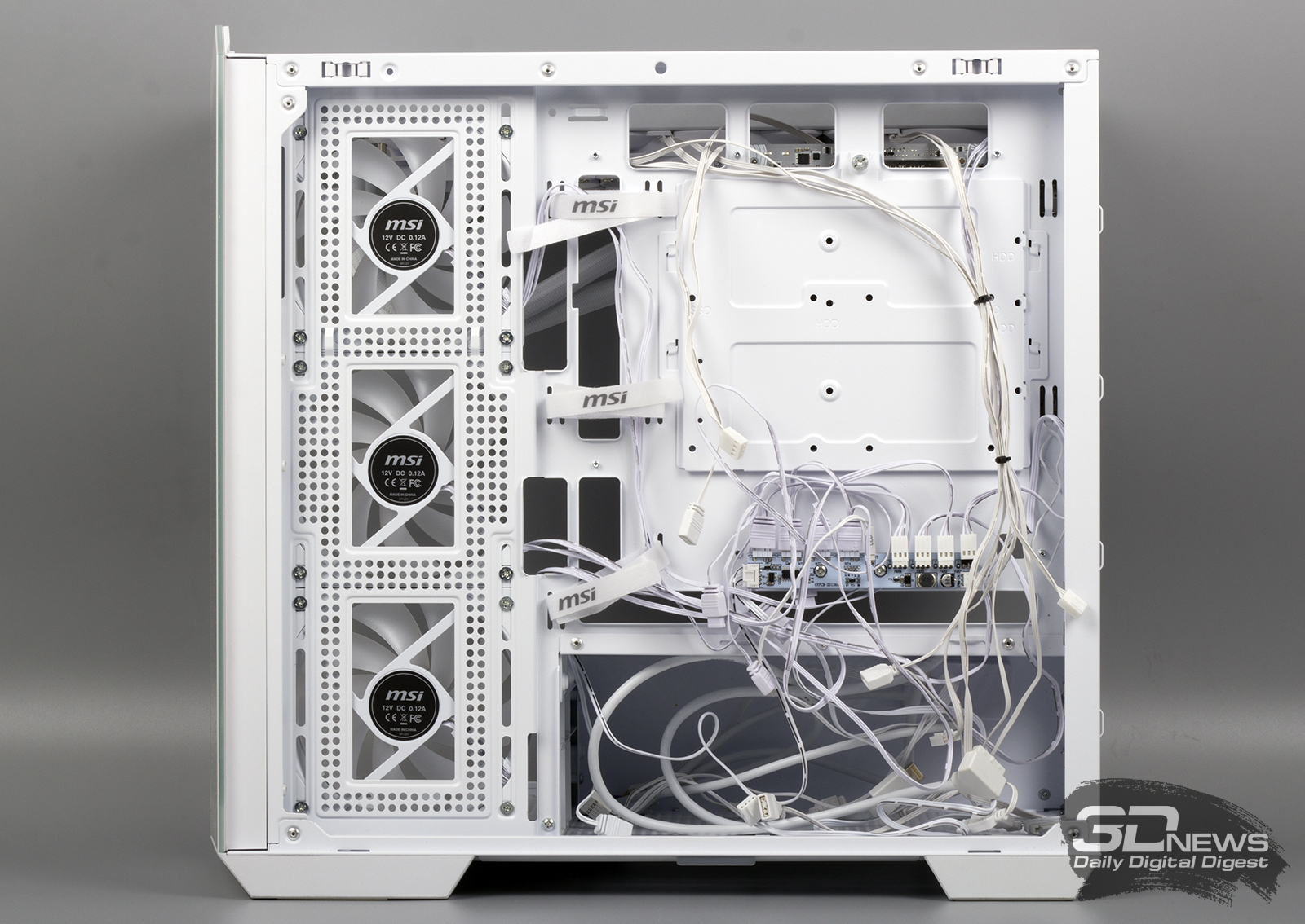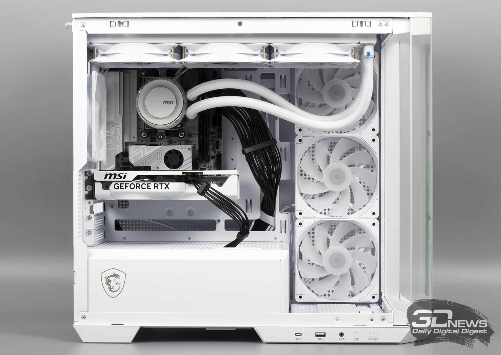 Кажется, вышло неплохо. Большая часть комплектующих в сборке оснащена RGB-подсветкой. Правильный антураж в таком ПК создает корпус. В данном случае речь идет о MAG PANO M100R PZ WHITE белого цвета. Про черную его версию я рассказывал в статье «Собирай по-новому, собирай красиво: знакомимся с концепцией скрытого кабель-менеджмента в игровых ПК на примере системы MSI PROJECT ZERO». Корпус поддерживает установку комплектующих формата Back-Connect Design, когда часть проводов и кабелей спрятаны от пользователя. Естественно, в таких устройствах делается акцент на внешнем виде. Так, передняя и боковая панели MAG PANO M100R PZ WHITE выполнены из закаленного стекла. То, что должно быть спрятано, — спрятано, блок питания скрыт от пользователя за металлической ширмой. Корпус обладает просторным шасси — на его основе можно собирать игровые ПК практически любой сложности. Здесь поместятся видеокарты длиной до 390 мм и процессорные кулеры высотой до 175 мм. Однако чаще для сборок в BCD-стиле подбирают необслуживаемые СЖО. На верхнюю панель корпуса можно повесить 240- или 360-мм радиатор. Размещать радиатор на боковой стороне производитель не рекомендует. Топовые блоки питания (длиной до 200 мм) в «панораме» тоже поместятся. Корпус оснащен четырьмя 120-мм вентиляторами. Они снабжены ARGB-подсветкой и подключены к хабу на боковой стенке. Три «карлсона», закрепленные сбоку, работают на вдув. Одна крыльчатка, размещенная на задней стенке, — на выдув. В целом охлаждение в MAG PANO M100R PZ WHITE выглядит продуманным. Подробнее о том, как в корпусах-аквариумах организовать правильное охлаждение, читайте в этой статье. Верхняя и нижняя панели устройства оснащены съемными пылевыми фильтрами. На I/O-панели, расположенной в нижней части (что как бы свидетельствует о том, что ставить такую красоту под стол никто не будет), нашлись USB 3.2 Gen 2×2 Type-C, USB 3.2 Gen 1 Type-A, 3,5-мм гнездо для подключения гарнитуры, клавиша включения и кнопка переключения подсветки вентиляторов. Прочее железо, которое я использовал для различных тестов, указано в таблице ниже.