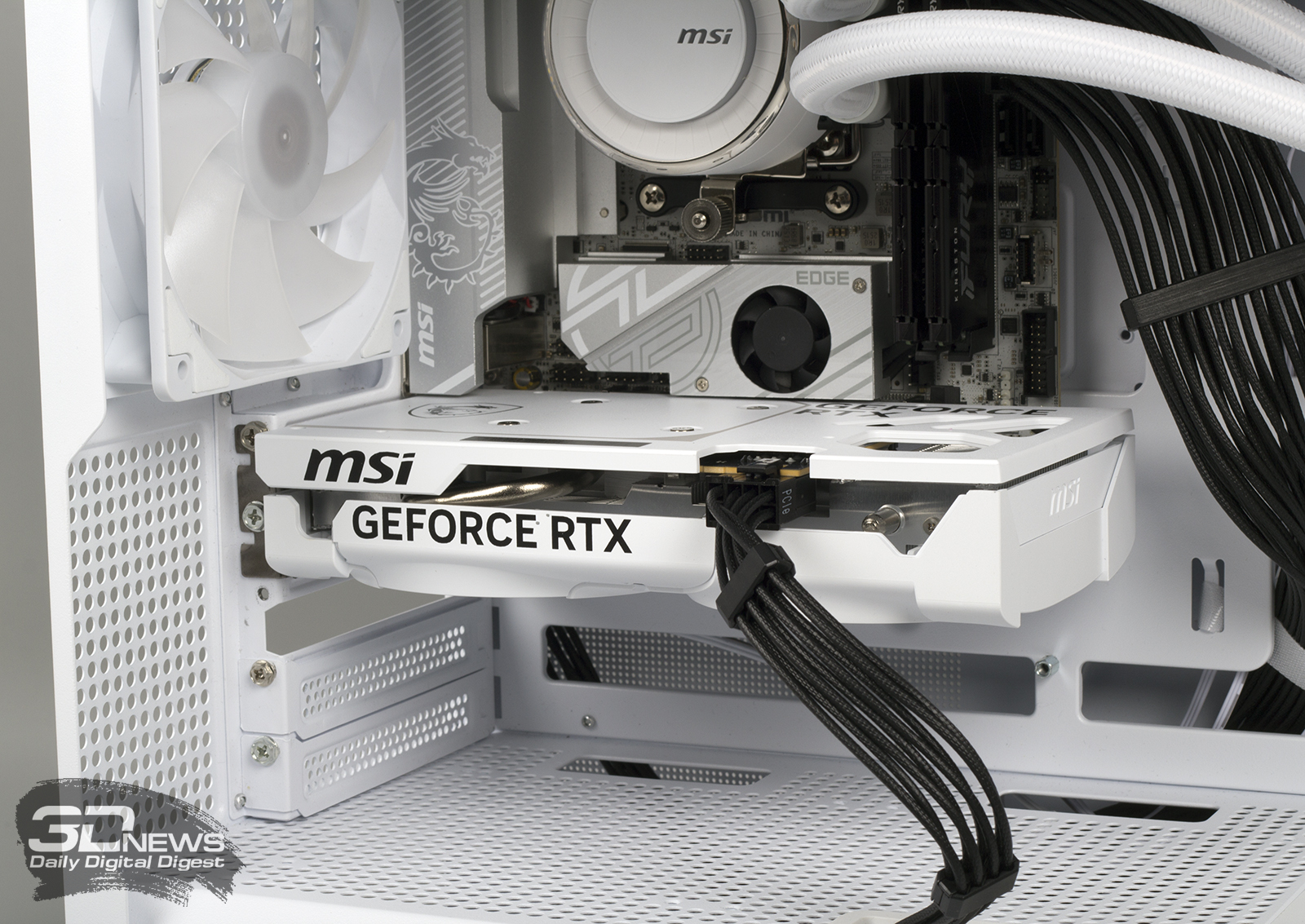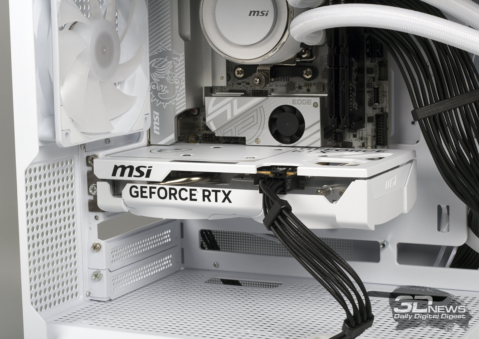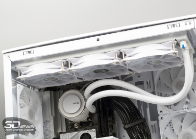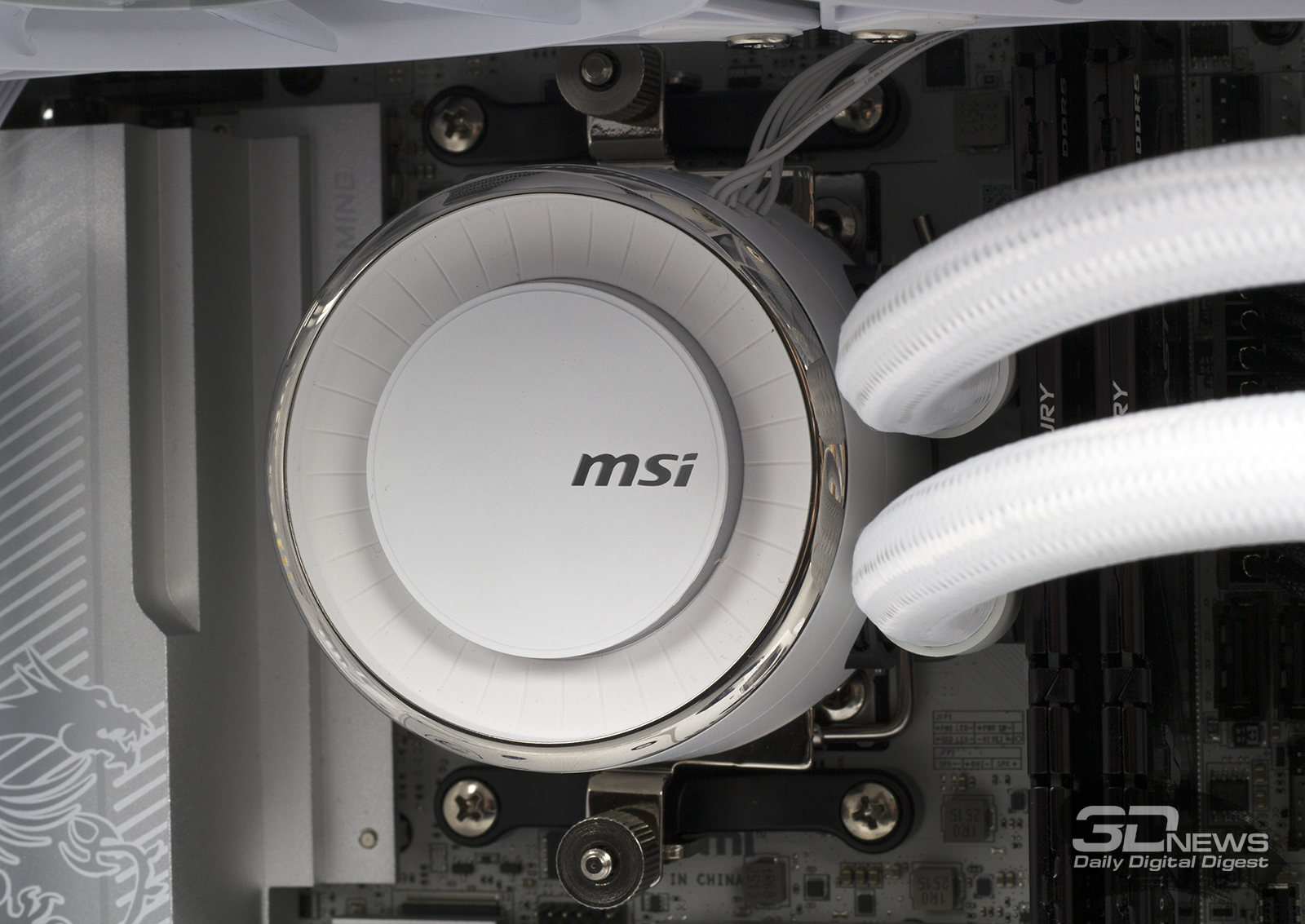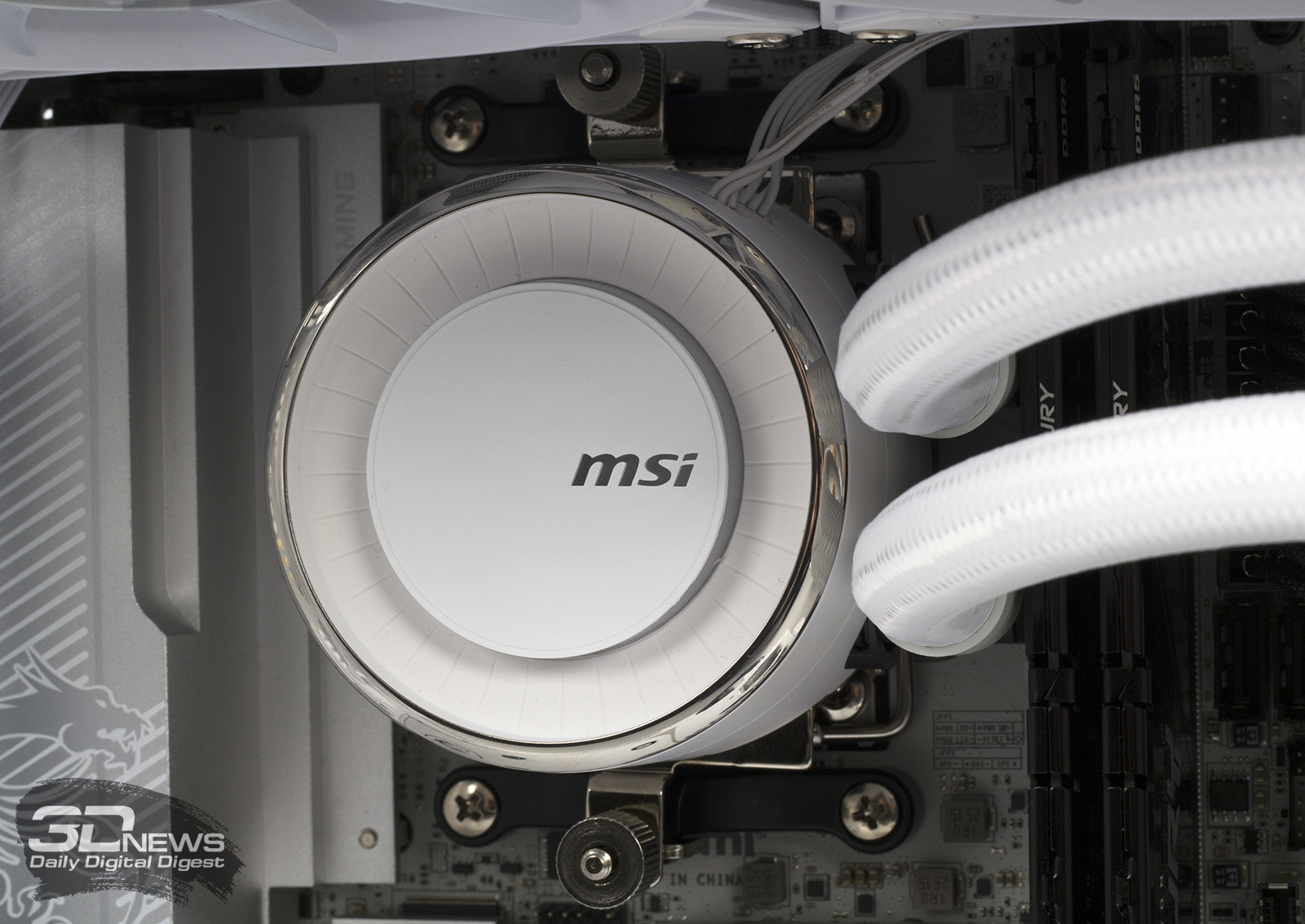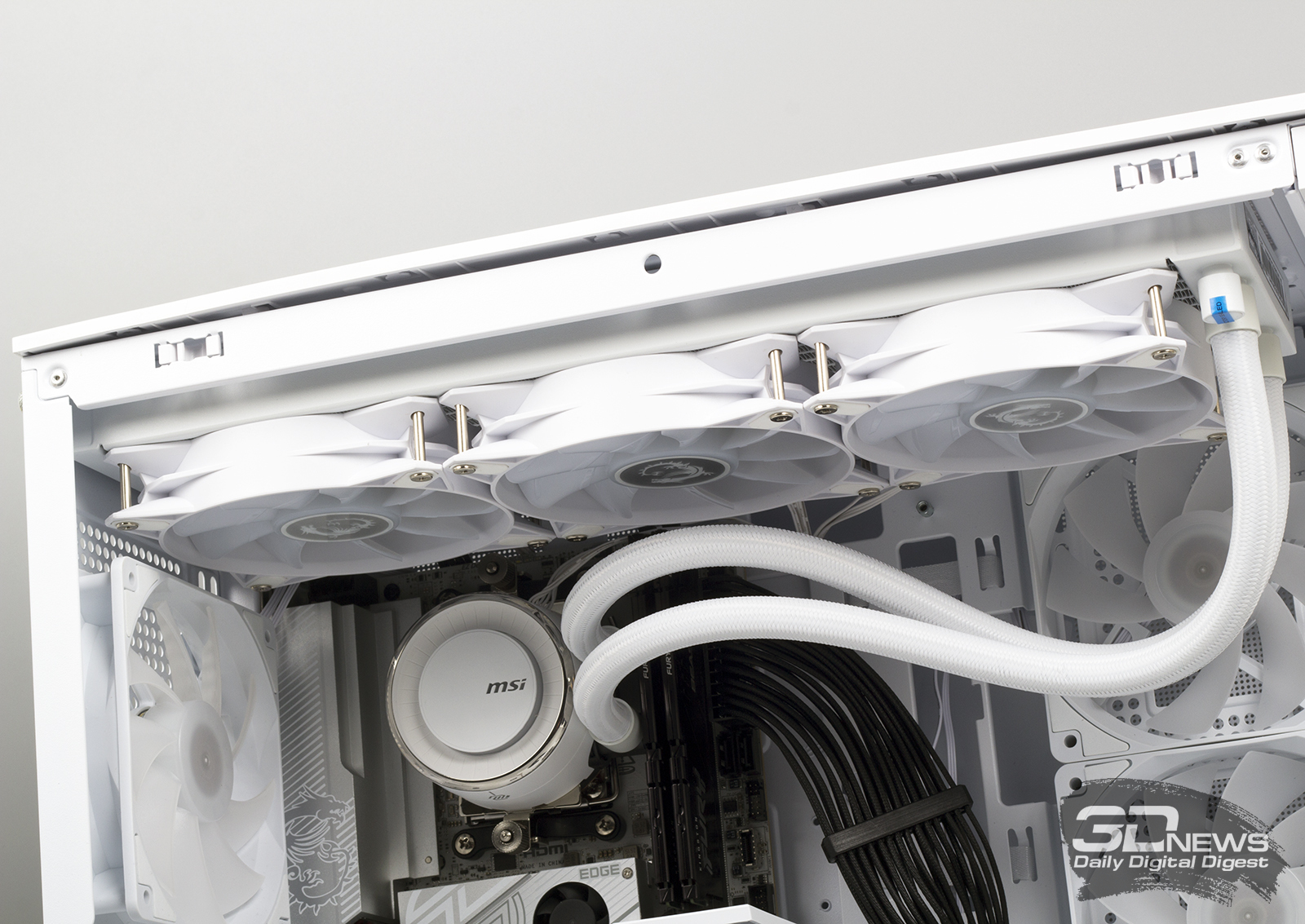 Оно точно того стоит? Мы видим, что использование медленной DDR5-памяти, такой как DDR5-5200, снижает игровую производительность массовой платформы LGA1700 в среднем на 10 %, — если в сборке не использовать дорогущую GeForce RTX 5090, конечно же. В тестировании использовались сильно зависящие от быстродействия ОЗУ игры. Я уверен, что в рамках сборок, представленных в «Компьютере месяца», этими 10 % вполне можно пожертвовать. А вот экономить на процессорном охлаждении не стоит — это правило касается всех трех массовых платформ AMD и Intel. В стенде использовалась необслуживаемая система жидкостного охлаждения MAG CORELIQUID E360 WHITE — обзор черной версии выходил на нашем сайте. Устройство удостоилось награды «3DNews рекомендует» — за высокую эффективность в классе и низкий уровень шума. В частности, отдельного комплимента заслуживает бесшумная помпа «водянки». Толщина радиатора составляет 14,5 мм — сквозь алюминиевые гребенки, заполненные гофролентой, проходит 12 плоских каналов. Длина резиновых шлангов в оплетке составляет 375 мм — то есть радиатор можно повесить как сверху, так и сбоку. Крышка помпы оснащена поворотным механизмом. Заявленная скорость ротора помпы составляет 3000 об/мин, уровень шума — не более 20 дБА, а нормативный срок службы — более двухсот тысяч часов. В системе используется уникальный медный водоблок с массивными ребрами высотой около 4 мм. Три комплектных вентилятора оснащены ARGB-подсветкой. Речь идет о крыльчатках Cooler Master FD12025L12SPAA. Их частота вращения меняется в диапазоне от 600 до 1800 об/мин. В конструкции применяется гидродинамический подшипник с нормативным сроком службы в 50 000 часов. Что удобно, все вертушки можно подключить к одному разъему на материнской плате — Y-разветвитель идет в комплекте.