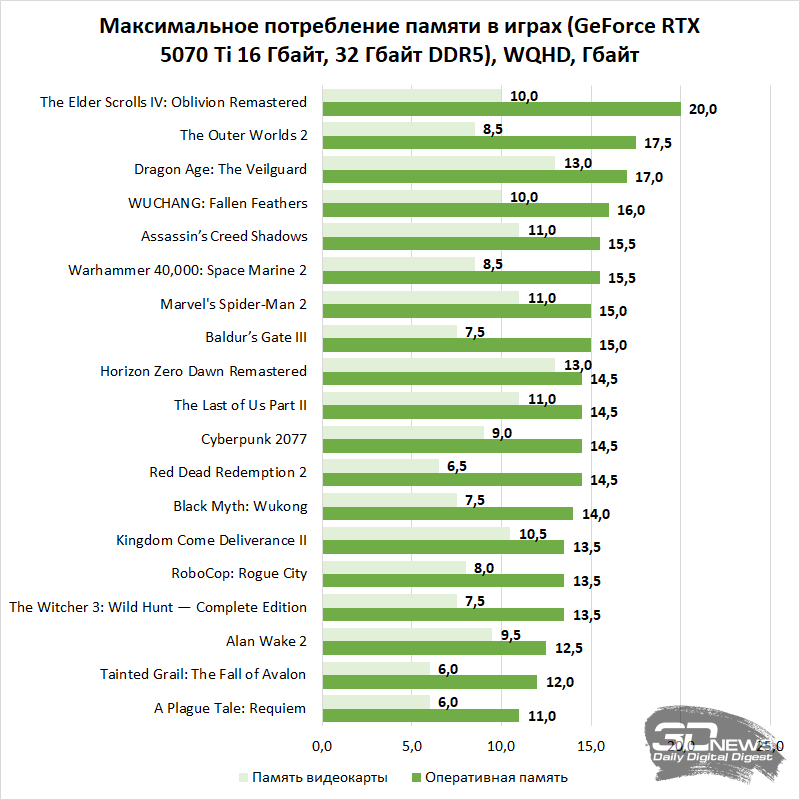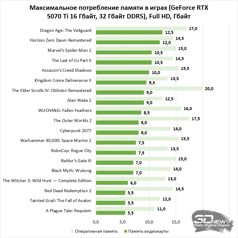 Учитывайте еще один факт: современные игровые движки очень любят размещать все необходимые данные в памяти компьютера, будь то DRAM или VRAM. То, что четыре из девятнадцати игр потребляли больше 16 Гбайт ОЗУ, совершенно не означает, что все данные нужны прямо сейчас. Смотрите, с одной стороны, нехватка видео- и оперативной памяти явственно ощущается в Horizon Zero Dawn Remastered, Alan Wake 2, Marvel's Spider-Man 2, The Last of Us Part II и Dragon Age: The Veilguard — в пяти играх из восьми. В The Elder Scrolls IV: Oblivion Remastered и Assassin’s Creed Shadows кадровая частота падает из-за нехватки VRAM — увеличение ОЗУ ситуацию никак не исправляет. К тому же нехватка памяти нередко сказывается не только на FPS, но и на скорости загрузки самих приложений, а также общем быстродействии. Еще сильнее нехватка DRAM/VRAM ощущается в условиях, когда ресурсы системного блока используются по полной, — например, после включения трассировки лучей в играх. Видеокарты с 8 Гбайт памяти точно не подходят для таких сценариев. Отмечу, что игровой ПК — это далеко не всегда история про игры на максимальном качестве графики. Никто не мешает нам играть с включением высоких и даже средних настроек качества. Нередко картинка меняется ненамного и часто удается попасть в лимит VRAM видеокарты.
