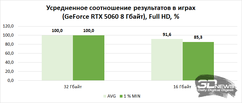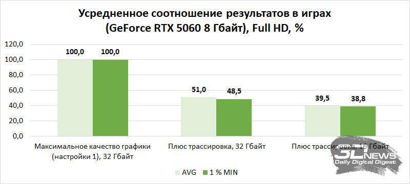 Наши тесты показывают, что в разрешении Full HD в играх без трассировки лучей между версиями GeForce RTX 5060 Ti с разным объемом памяти можно смело ставить знак равенства — разница в среднем составляет 3 % в пользу более дорогой модели. GeForce RTX 5070 оказывается быстрее в среднем на 34 %. Получается, переплата в 8-10 тысяч — вот цена за спокойствие и уверенность по поводу современности игровой сборки в ближайшие несколько лет.