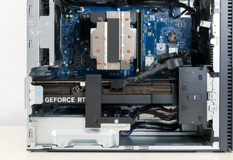 Многочисленные истории про оплавление разъёмов дополнительного питания 12VHPWR и 12V-2×6 на флагманских видеокартах Nvidia изрядно подпортили ей имидж, но бороться с проблемой приходится и её партнёрам. Защитные механизмы встраивались в блоки питания, предлагались специальные технологии мониторинга за состоянием разъёма. Dell в готовом настольном компьютере решила ограничиться дополнительной фиксацией разъёма механическим методом. Самое интересное, что в конкретной системе установлена не самая мощная видеокарта GeForce RTX 5070 Ti, но Dell всё же предпочла подстраховаться от возможных проблем с перегревом разъёма питания. Дополнительную стабильность конструкции обеспечивает поддерживающий видеокарту кронштейн внутри системного блока.
