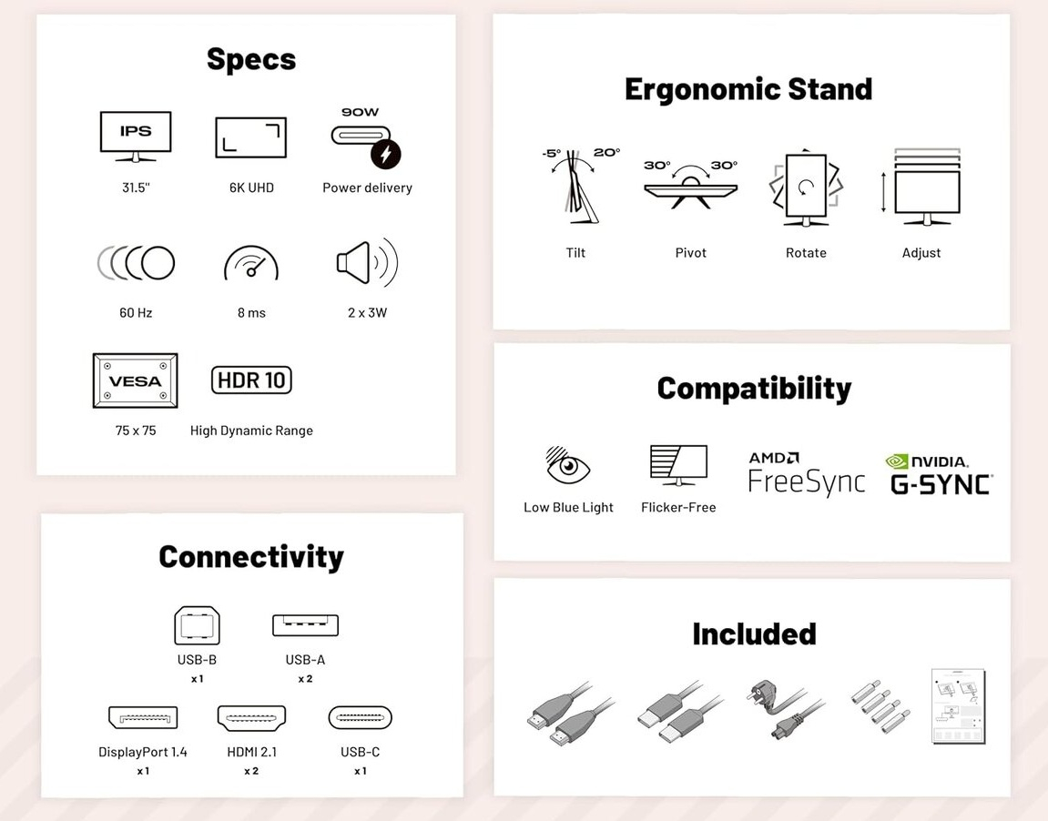 Технические характеристики выглядят многообещающе: 31,5-дюймовая IPS-панель обеспечивает разрешение 6016 × 3384 пикселей при соотношении сторон 16:9, что даёт высокую плотность пикселей — 219 ppi. Однако частота обновления ограничена 60 Гц, что также характерно для других мониторов с таким разрешением. В продаже есть только один монитор с разрешением 6K и более высокой частотой обновления — 120 Гц: Dell UltraSharp 52 Thunderbolt Hub Monitor (U5226KW). Однако размер экрана 52 дюйма и соотношение сторон 21:9 делают его непригодным для прямого сравнения.