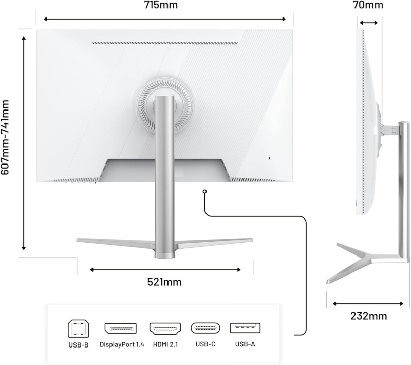 Набор внешних разъёмов монитора включает один DisplayPort 1.4, два HDMI 2.1, один порт USB-C с поддержкой Power Delivery мощностью 90 Вт и два порта USB-A для функции KVM-переключателя. В комплект также входят встроенные динамики и универсальная регулируемая подставка, совместимая с креплением VESA. Монитор поддерживает технологии синхронизации изображения AMD FreeSync и Nvidia G-Sync. Заявленное энергопотребление составляет 44 Вт в типичном режиме работы и 38 Вт — в экономичном.