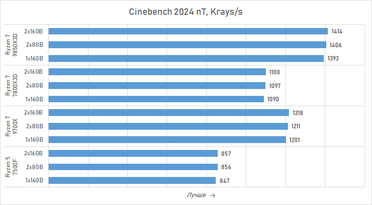 Принято считать, что настройки памяти сильнее влияют на производительность в играх, чем на скорость работы приложений. Но в случае, когда речь идёт об архитектуре подсистемы памяти на базовом уровне, ситуация меняется. Скорость работы Ryzen в ресурсоёмких задачах при использовании двухканальных комплектов 2×8 Гбайт или 2×16 Гбайт и одного модуля 1×16 Гбайт довольно ощутимо отличается. Естественно, это касается не всех без исключения приложений, например рендеринг от подсистемы памяти зависит слабо. Но в ряде случаев разрыв получается даже выше, чем в синтетическом Geekbench 6.