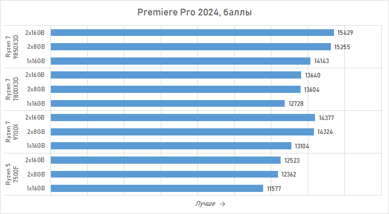Всё сказанное выше верно не только для обычных Ryzen, но и касается процессоров серии X3D, оснащённых расширенной кеш-памятью третьего уровня. AMD не раз подчёркивала, что увеличенный L3-кеш снижает зависимость производительности от скорости и организации ОЗУ. И в наших тестах это частично подтверждается: в ряде игр X3D-модели меньше теряют от перехода с 32 к 16 Гбайт памяти, но это в основном касается двухканального режима. Объёмный L3-кеш не может компенсировать фундаментальные проблемы одноканальной подсистемы памяти. Он уменьшает частоту обращений к DRAM, но не расширяет её шину и не добавляет параллелизма. Поэтому одноканальная конфигурация 1×16 Гбайт остаётся для X3D-процессоров столь же нежелательной: просадки в играх никуда не исчезают и выражены они почти так же сильно, как и у моделей без дополнительного кеша.