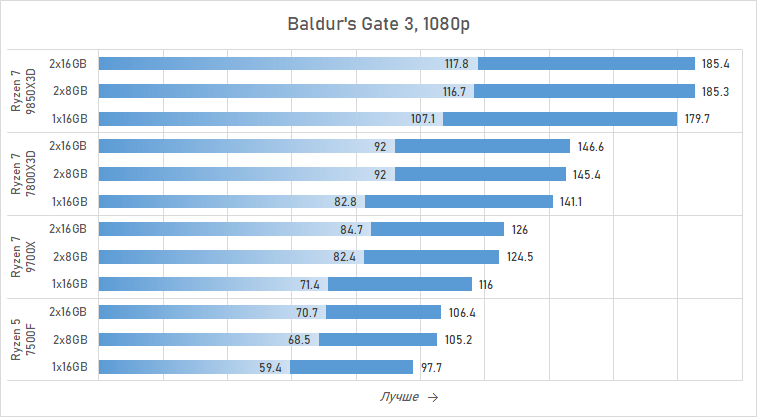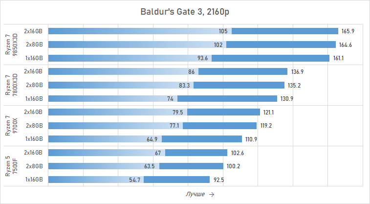 Причём среди игр находятся такие, где одноканальная память наносит в 4K даже более серьёзный урон, чем в разрешении Full HD. Самый яркий пример — Baldur's Gate 3, где дело доходит до того, что геймерский Ryzen 7 7800X3D с одноканальной памятью выдаёт меньший минимальный FPS, чем обычный Ryzen 7 9700X с двухканальной памятью; а Ryzen 7 9700X с памятью в конфигурации 1×16 Гбайт уравнивается по минимальной частоте кадров с Ryzen 5 7500F с комплектом 2×8 Гбайт.