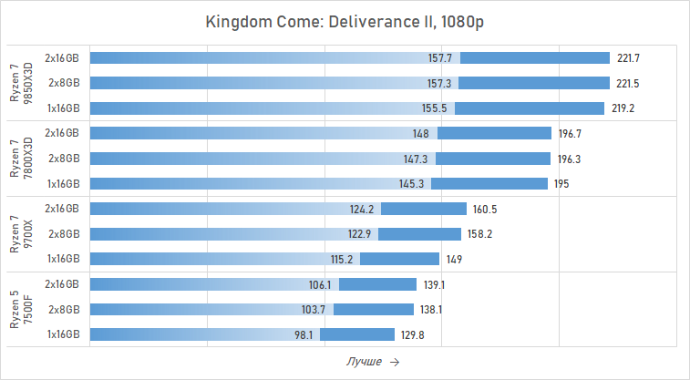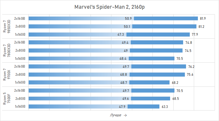 Иными словами, 3D-кеш — это не панацея. В некоторых играх он позволяет получить почти одинаковый уровень FPS как с двумя, так и с одним модулем DDR5 объёмом 16 Гбайт. Например, его положительное влияние хорошо заметно в Horizon Zero Dawn Remastered, Kingdom Come: Deliverance II и The Last of Us Part II Remastered. Но есть и обратные примеры, где производительность Ryzen 7 7800X3D и Ryzen 7 9800X3D страдает от одноканальной памяти так же сильно, как и у Ryzen 7 9700X или Ryzen 5 7500F. Например, в Marvel's Spider-Man 2, Baldur's Gate 3 и Starfield минимальная частота кадров при переходе от конфигурации 2×16 Гбайт к 1×16 Гбайт проседает на 10 % даже у процессоров с 3D-кешем.