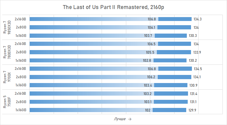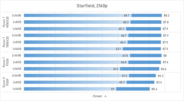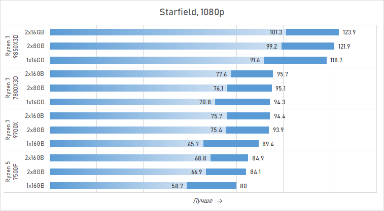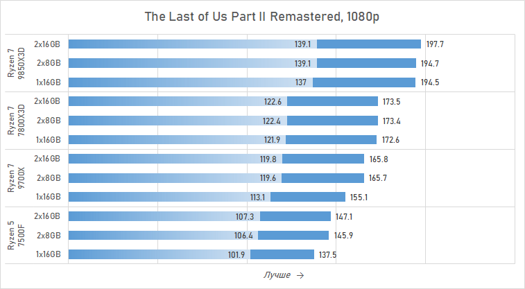 И это далеко не единственный пример. Если судить по минимальному FPS, единичный модуль на 16 Гбайт делает флагманский Ryzen 7 9850X3D слабее Ryzen 7 7800X3D в Battlefield 6, Marvel's Spider-Man 2, Starfield и Last of Us Part II Remastered. И этими тайтлами дело наверняка не ограничивается. Иными словами, использовать один модуль DDR5 в игровых системах на базе Ryzen — плохое решение. И наличие у процессора 3D-кеша в этом случае ситуацию совсем не исправляет — контроллер памяти современных Ryzen имеет крайне слабую оптимизацию для работы с одноканальной памятью. Казалось бы, ситуацию должна была во многом сгладить архитектура модулей DDR5 с двумя субканалами, но на практике мы видим картину, очень похожую на ситуацию в системах с DDR4: одноканальный режим остаётся препятствием для плавного игрового процесса без лагов и кратковременных провалов в частоте кадров.