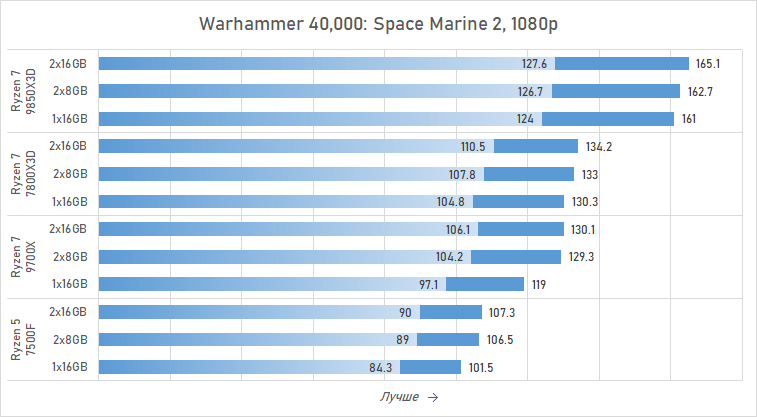 Однако если объём в 16 Гбайт оперативной памяти набран не двумя модулями, а одной планкой, работающей в одноканальном режиме, ситуация с игровой производительностью заметно ухудшается. Такая конфигурация памяти приводит к падению среднего FPS на 3–8 % и минимального FPS — на 6–12 % (в зависимости от процессора). Причём сильнее страдают от снижения параллелизма подсистемы памяти процессоры Ryzen без 3D-кеша, именно их производительность падает на величины по верхней границе приведённых диапазонов. При этом большой L3-кеш в геймерских Ryzen 7 7800X3D и Ryzen 7 9800X3D действительно частично компенсирует недостатки подсистемы памяти, но о полном сокрытии проблем речь, естественно, не идёт.