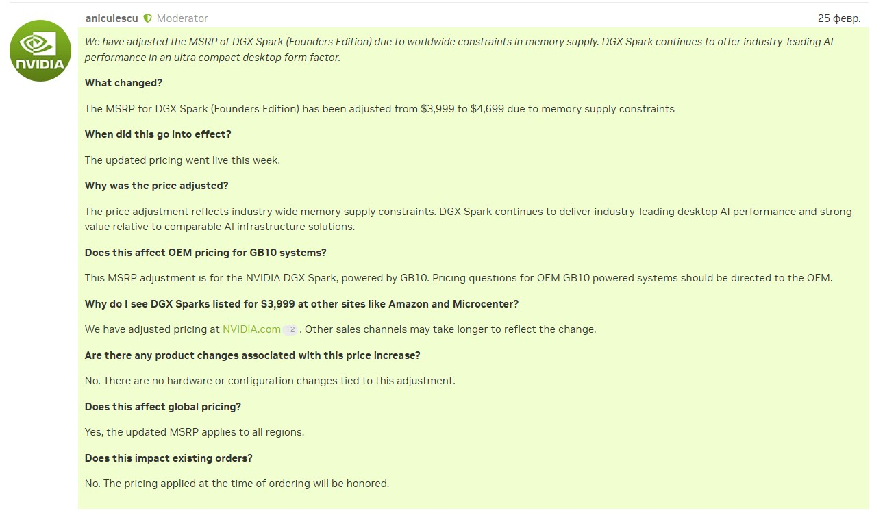«В связи с глобальными ограничениями поставок памяти мы скорректировали рекомендованную розничную цену DGX Spark (Founders Edition). Рекомендованная розничная цена DGX Spark (Founders Edition) была скорректирована с 3999 до 4699 долларов США в связи с ограничениями поставок памяти. DGX Spark продолжает предлагать лучшие в отрасли показатели производительности ИИ в сверхкомпактном формфакторе для настольных компьютеров», — говорится в заявлении на форуме Nvidia для разработчиков.