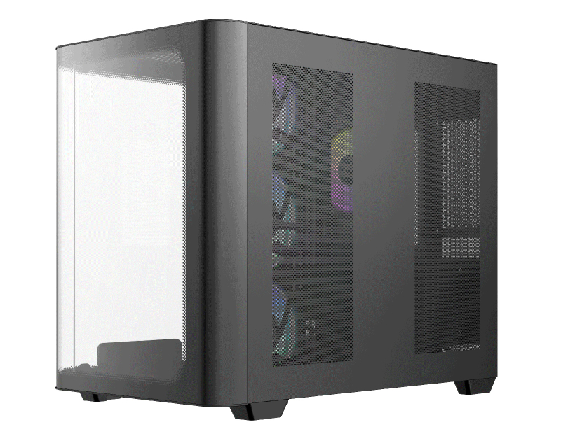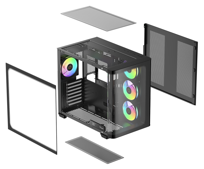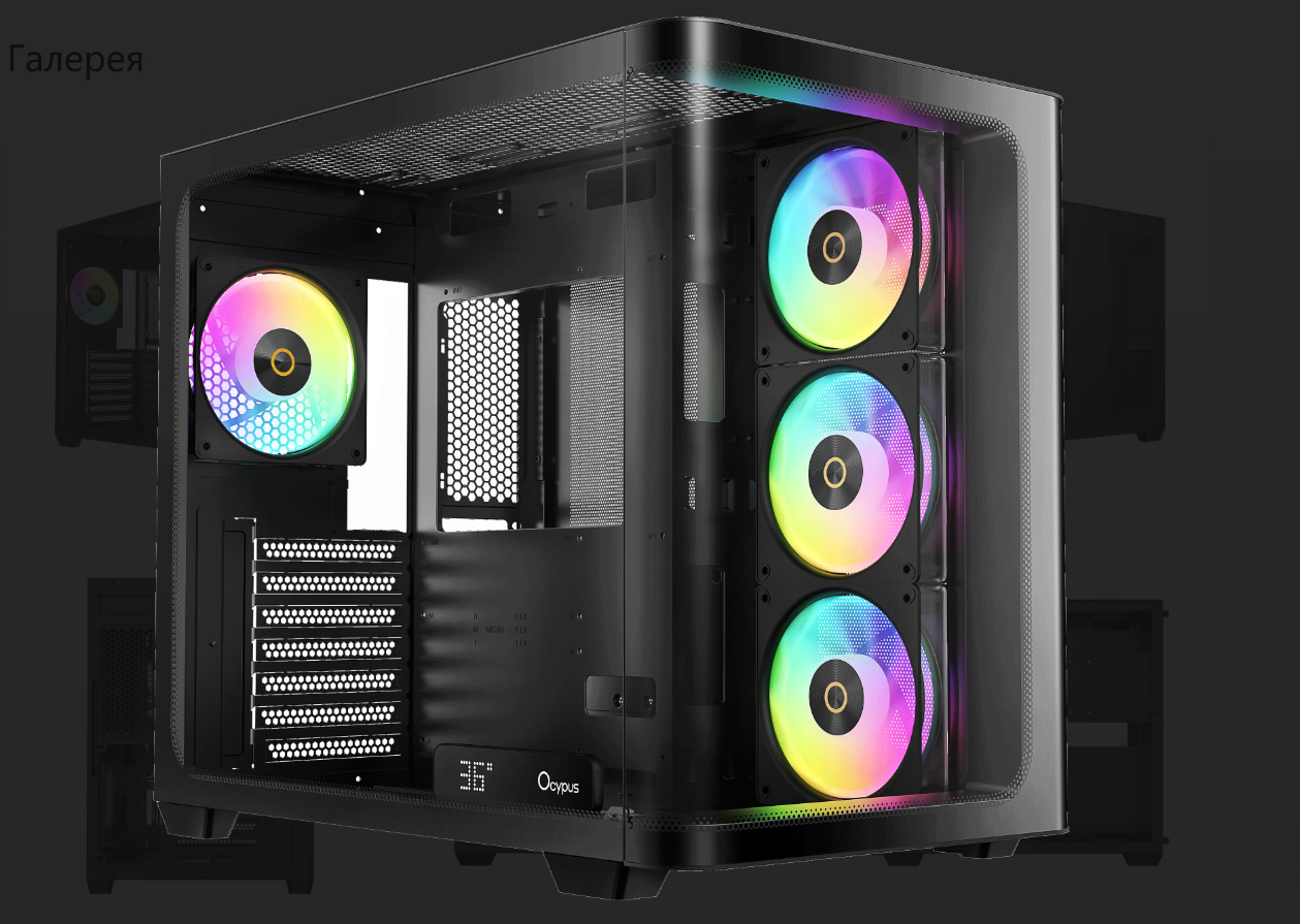 Ocypus Iota C70 Curve ARGB – корпус с панорамным остеклением для демонстрации комплектующих, которые пользователь разместил в нём. Изогнутая передняя панель выглядит свежо и оригинально, на такой корпус обязательно обратят внимание ваши гости, особенно когда работают вентиляторы с подсветкой. Жаль, правда, что разработчики не предусмотрели возможность вертикальной установки видеокарты для полного вау-эффекта.