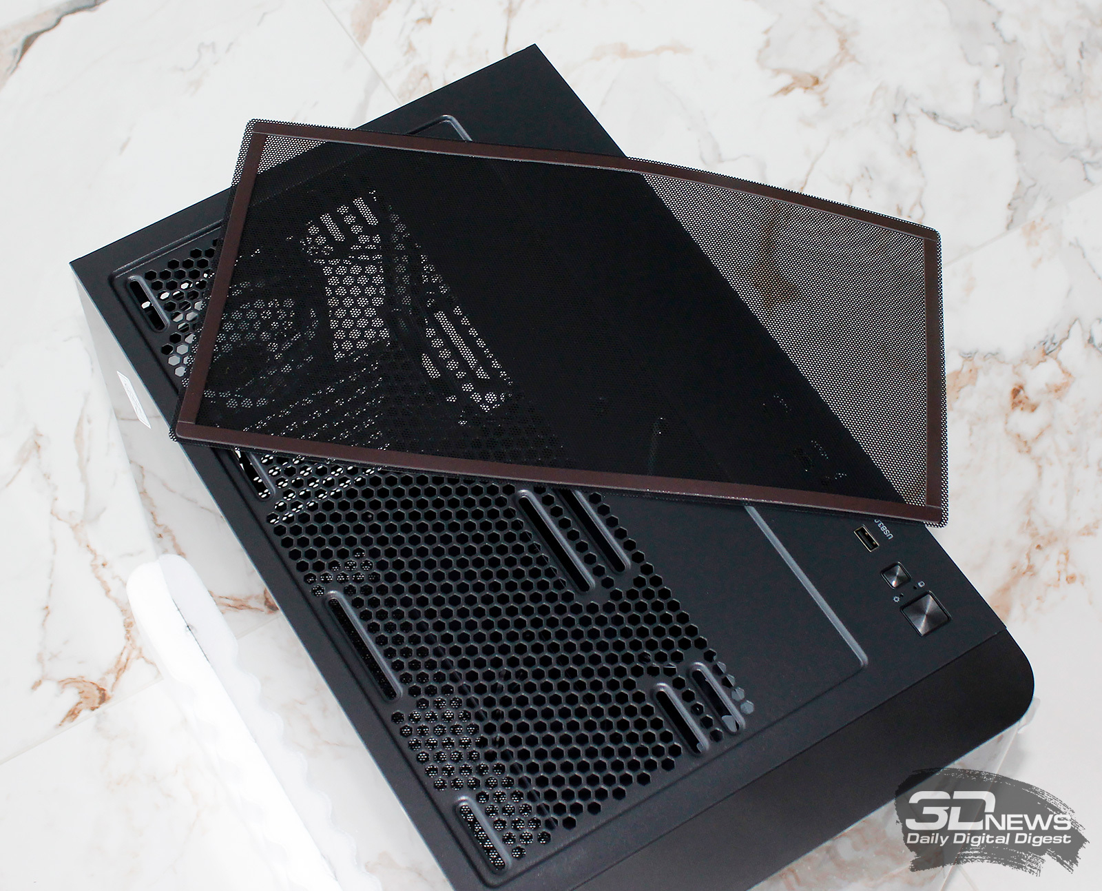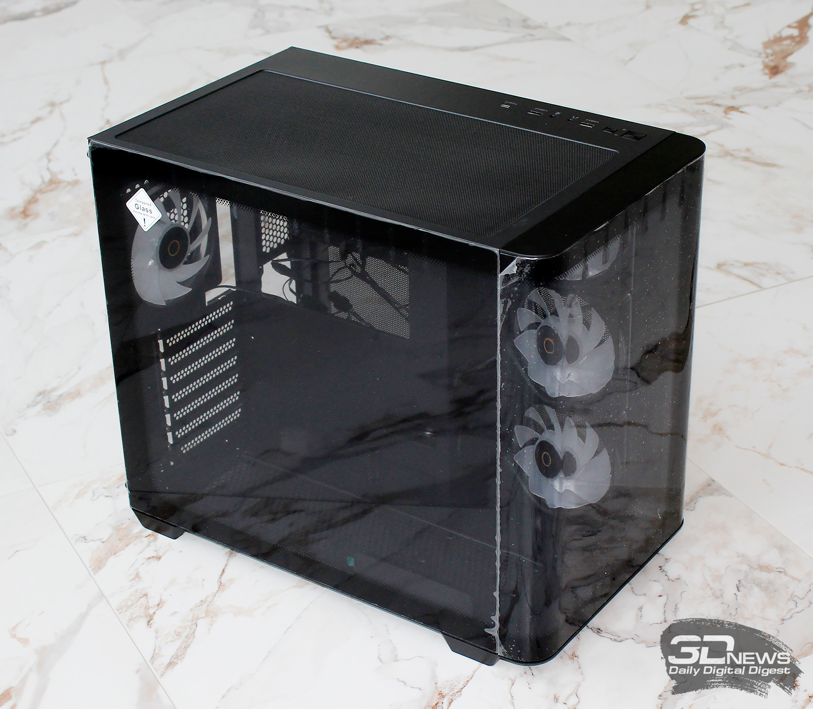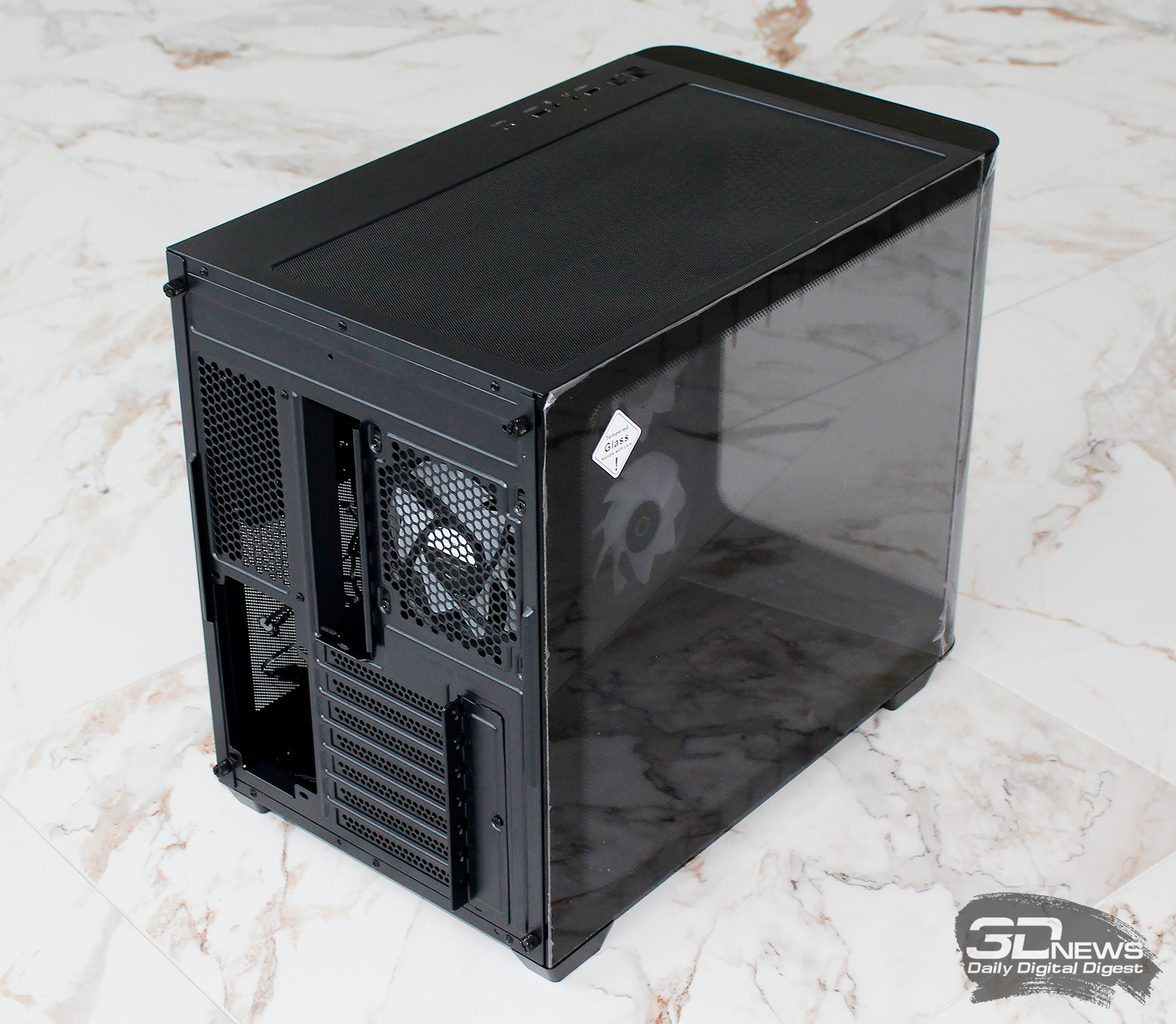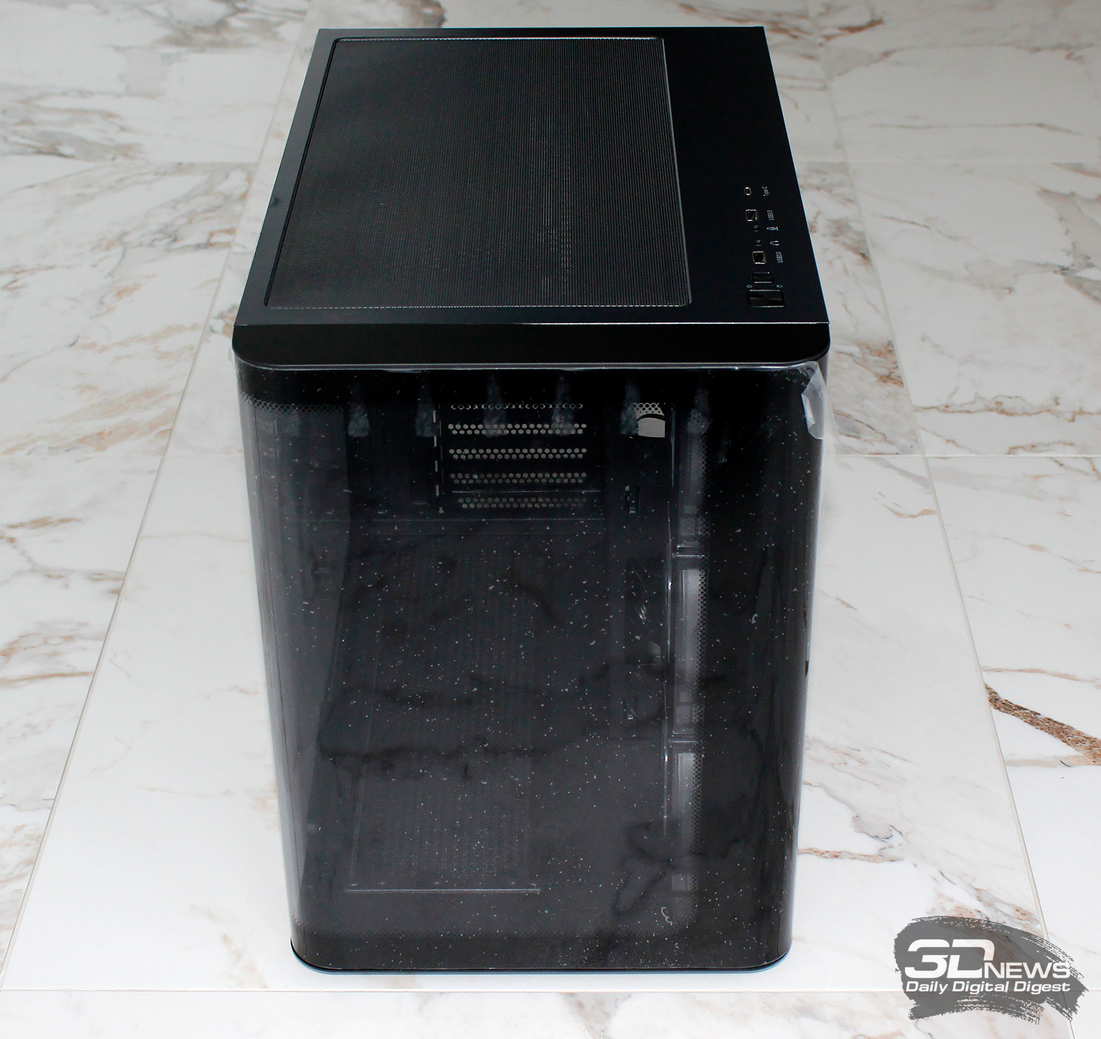 По всей видимости, дисбаланс вдуваемого и выдуваемого воздуха в корпусе компенсируется перфорацией верхней панели и (частично) задней. На этапе тестирования проверим, сможет ли такая комбинация вентиляторов и двух стеклянных панелей обеспечить эффективное охлаждение комплектующим, установленным в этот корпус.