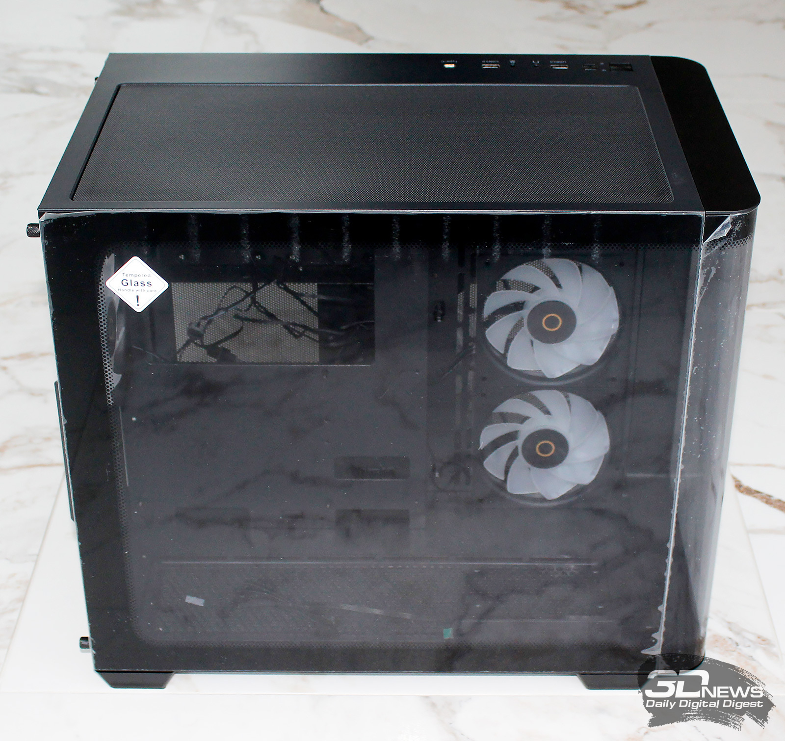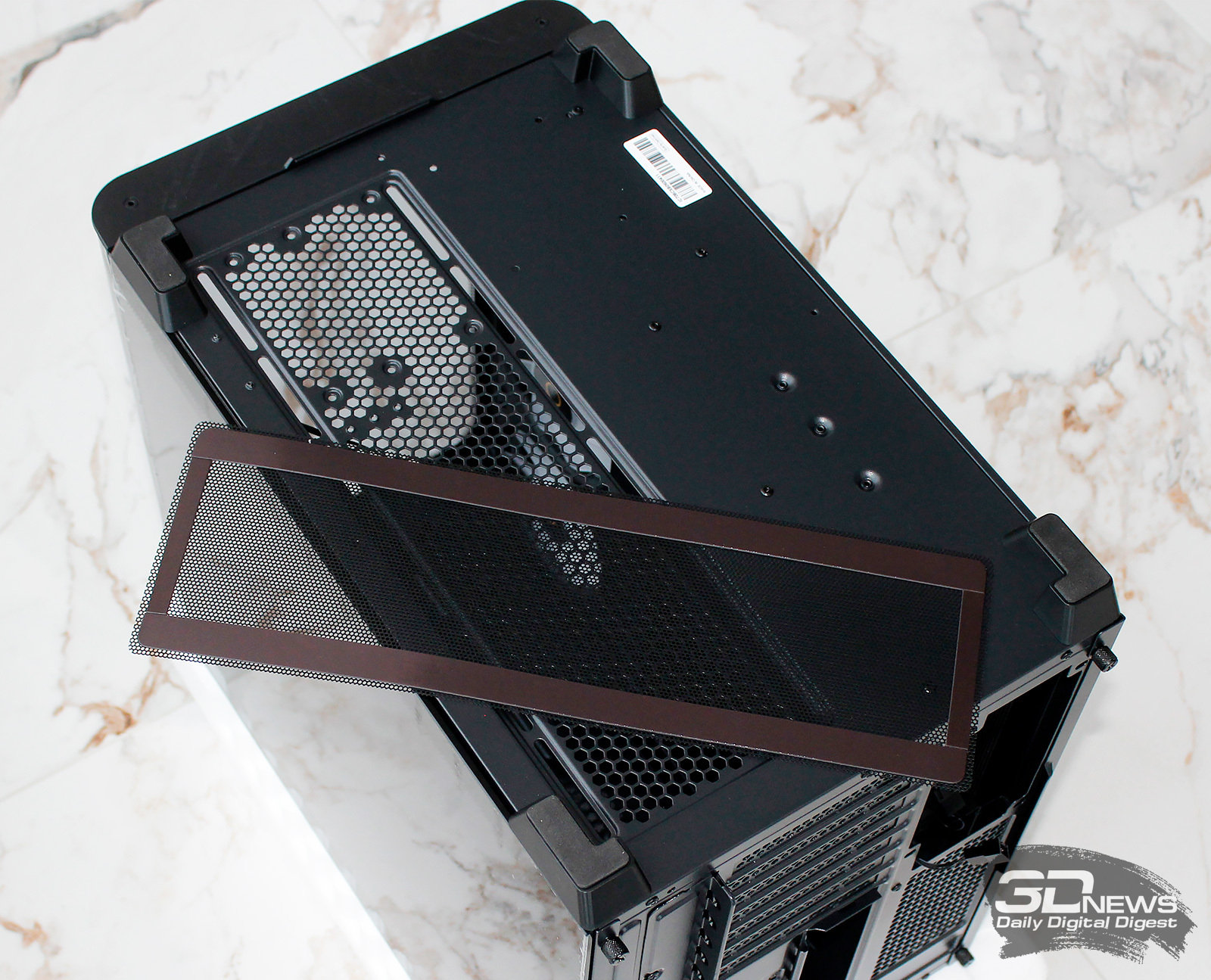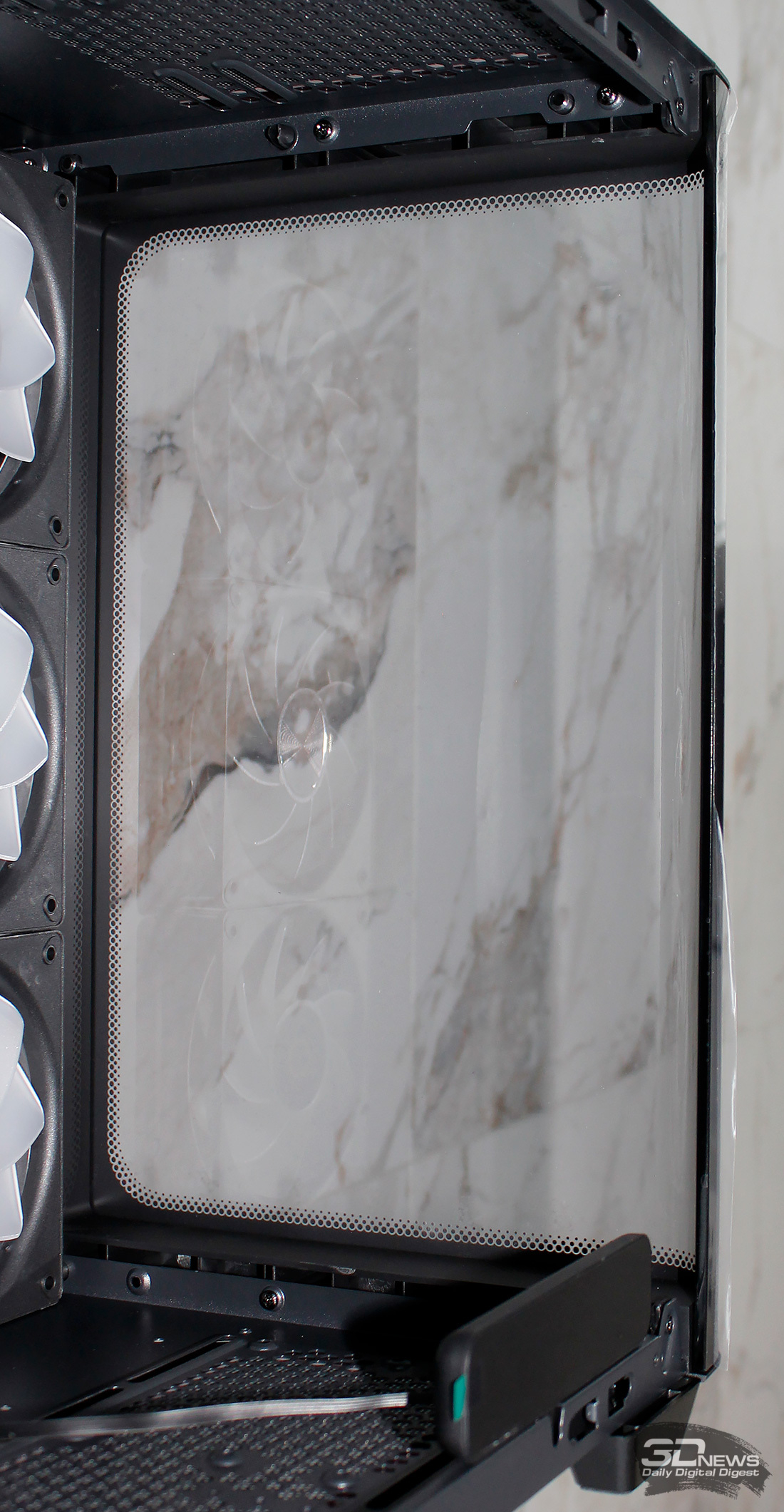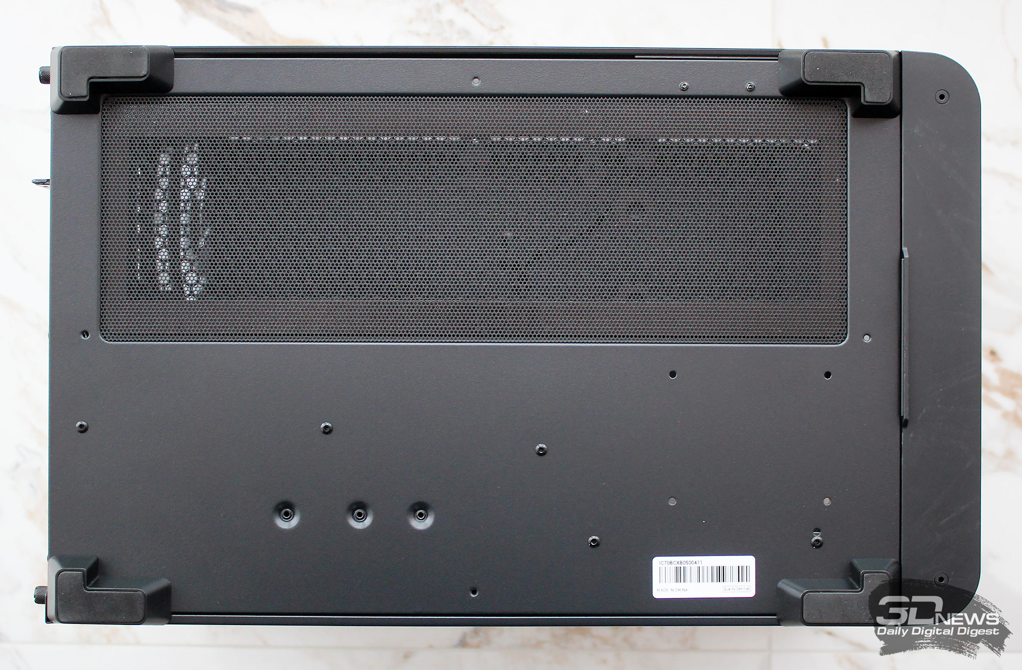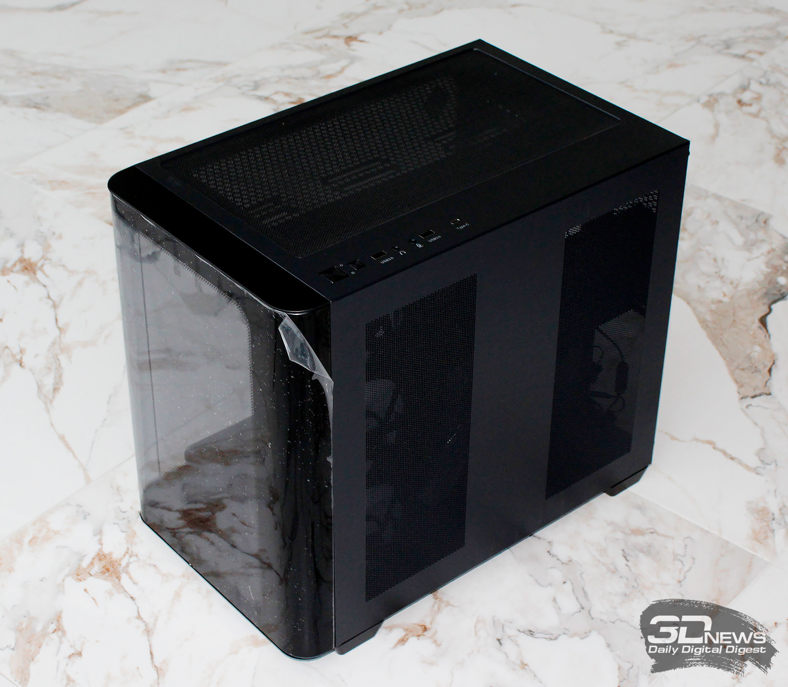 По всей видимости, дисбаланс вдуваемого и выдуваемого воздуха в корпусе компенсируется перфорацией верхней панели и (частично) задней. На этапе тестирования проверим, сможет ли такая комбинация вентиляторов и двух стеклянных панелей обеспечить эффективное охлаждение комплектующим, установленным в этот корпус.
