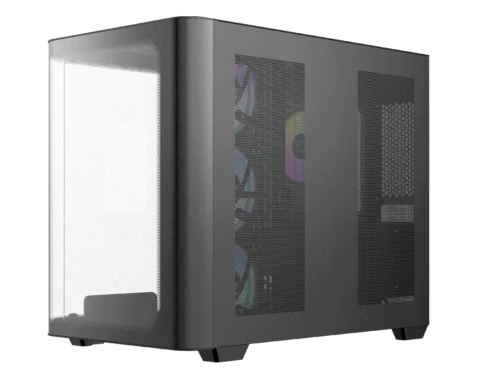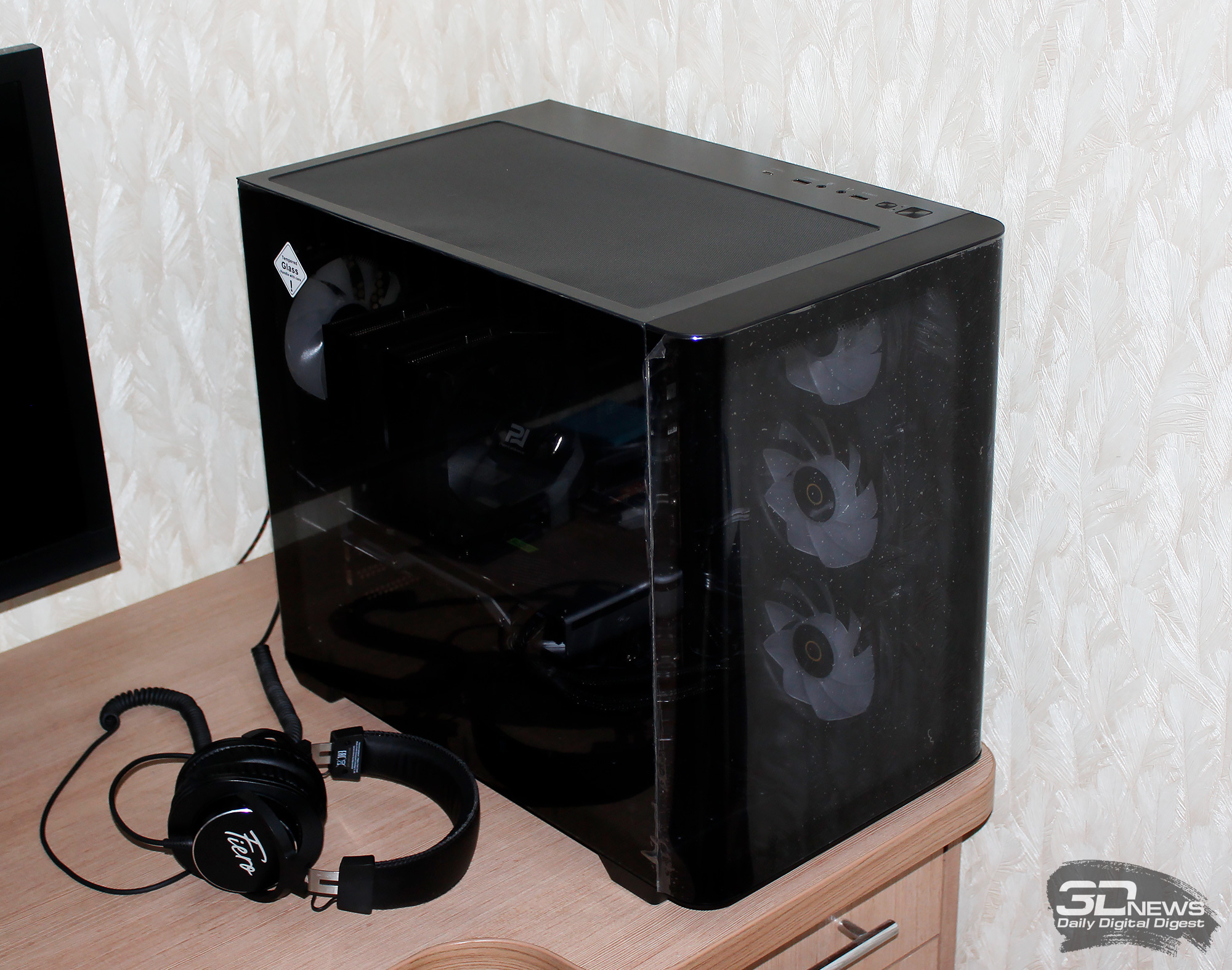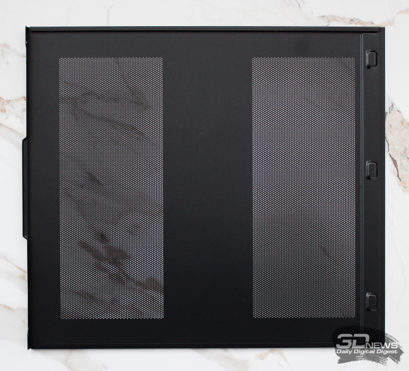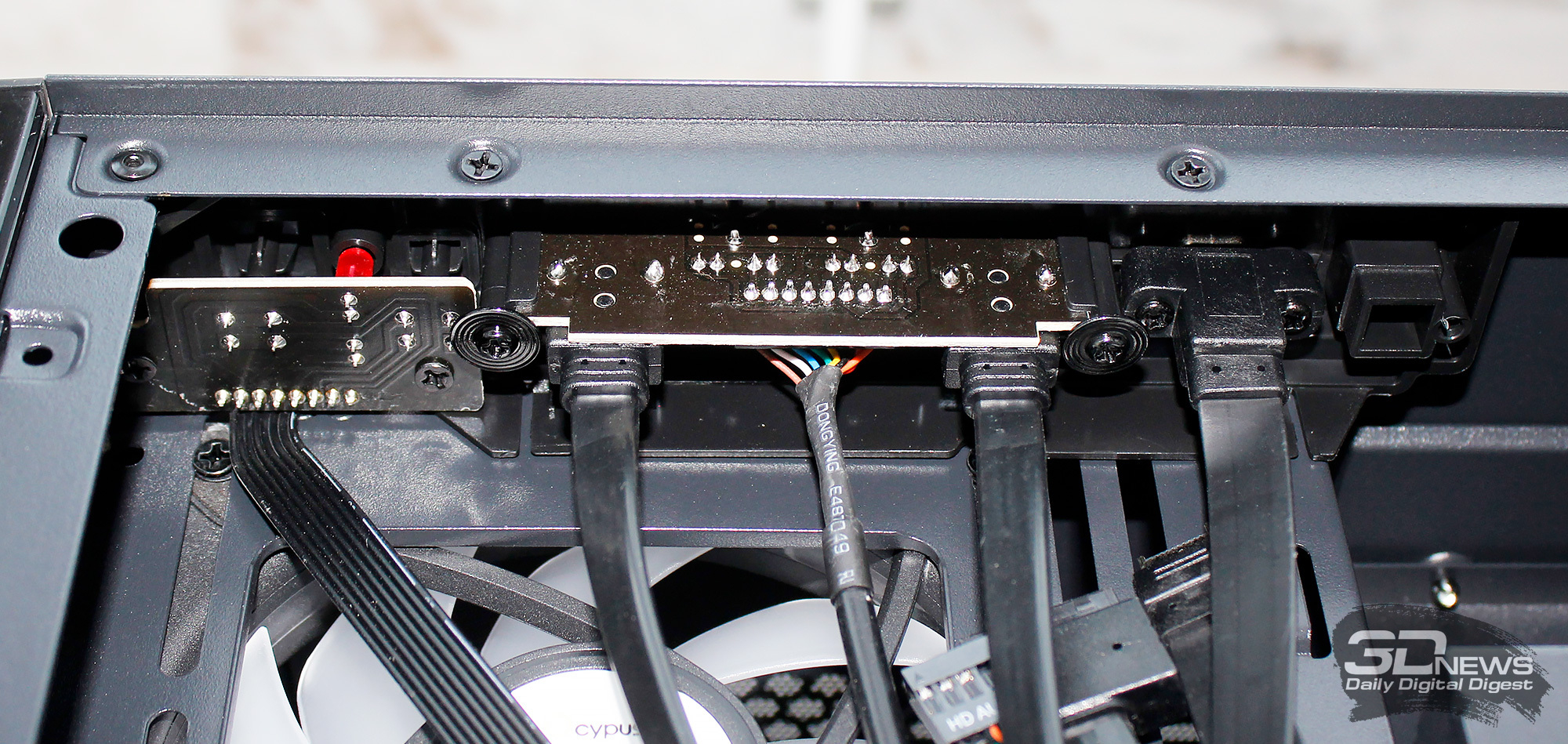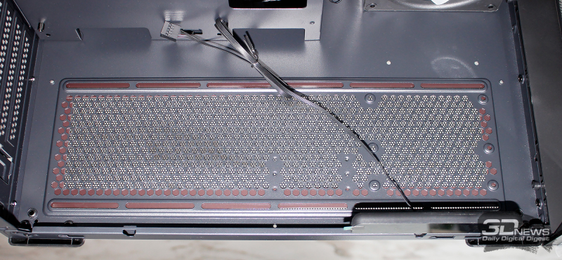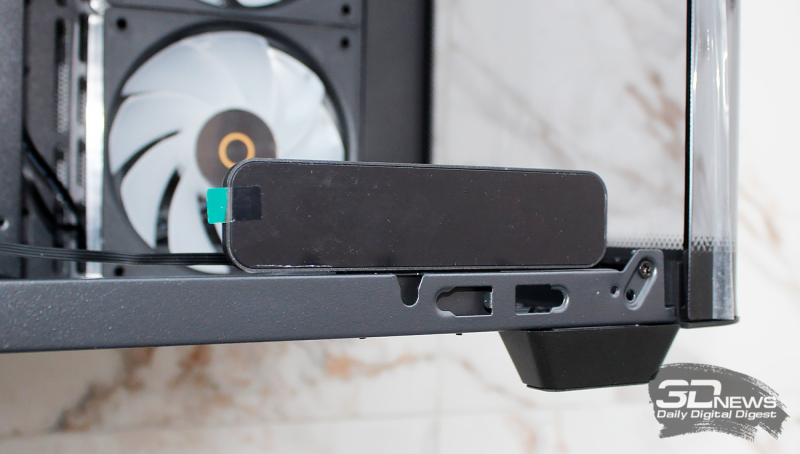 По всей видимости, дисбаланс вдуваемого и выдуваемого воздуха в корпусе компенсируется перфорацией верхней панели и (частично) задней. На этапе тестирования проверим, сможет ли такая комбинация вентиляторов и двух стеклянных панелей обеспечить эффективное охлаждение комплектующим, установленным в этот корпус.