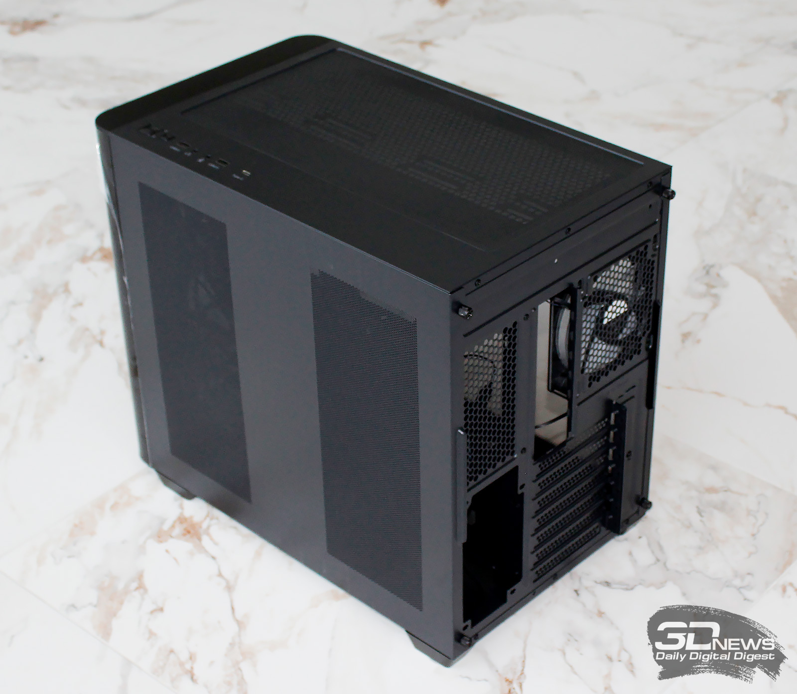 Заднюю панель можно разделить на две зоны по вертикали. Основная состоит из проёма под интерфейсную панель материнской платы, вентиляционной решётки под 120-мм вентилятор и блока со слотами PCIe. Дополнительная отведена под вертикальный проём для установки блока питания и большую вентиляционную решётку. Отметим, что в верхней части есть 35-мм зазор, полезный для установки систем жидкостного охлаждения или просто для удобства сборки.
