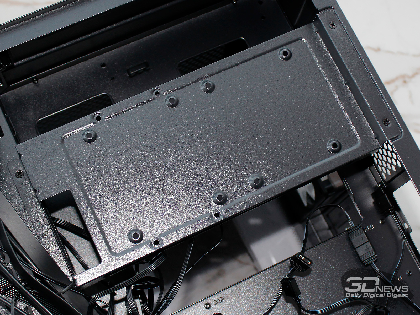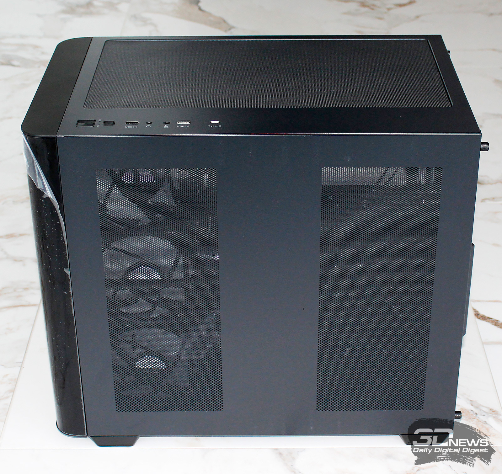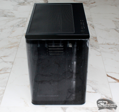 Верхняя панель корпуса подходит для установки радиаторов систем жидкостного охлаждения размерами 360 × 120 мм.