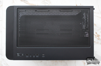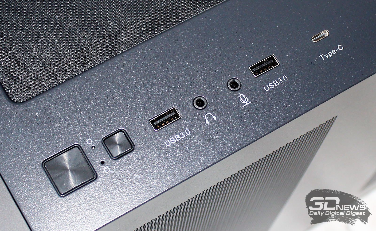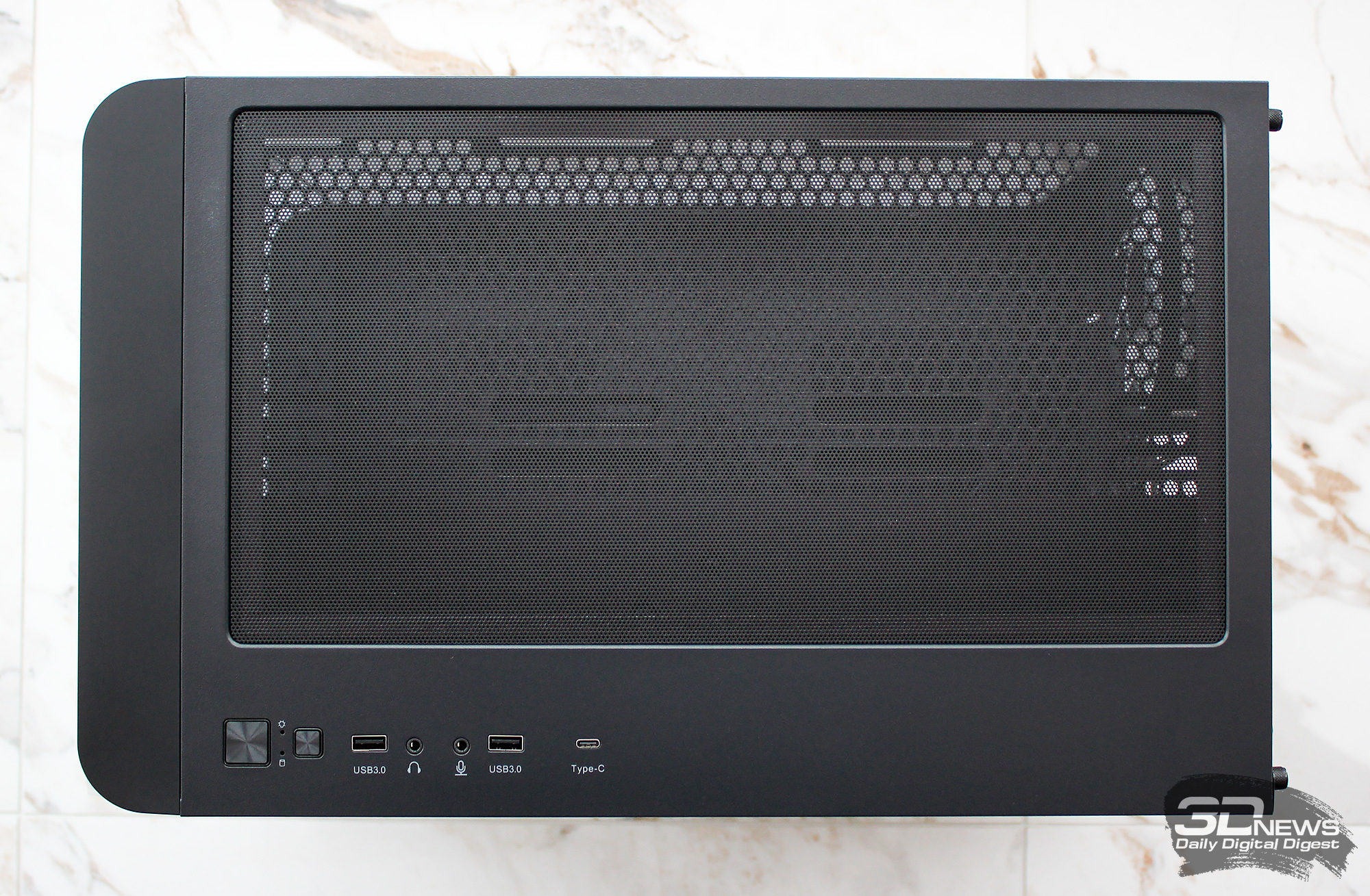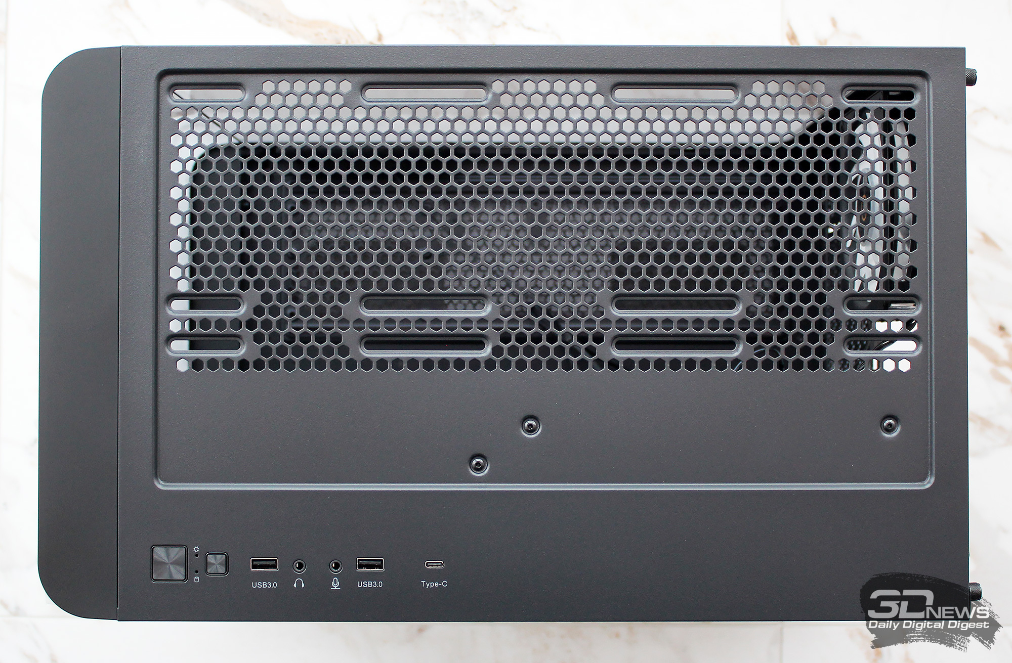 На верхнюю панель выведены кнопки включения и сброса, два порта USB 3.2 Gen1 Type-A, один порт USB 3.2 Gen2 Type-C, а также два отдельных 3,5-мм разъёма для наушников и микрофона.